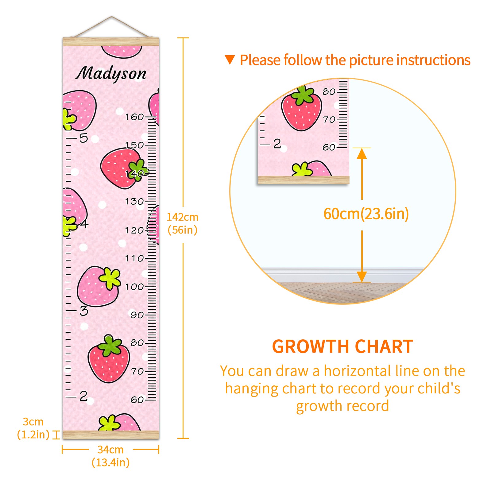 <p><b>Features:</b></p> <p>Rope for Hanging</p> <p>Material: Linen + Wood</p> <p>Dimensions: 13.4x56 inches</p> <p>Package Included: 1 * Baby Growth Chart</p> <p><b>Baby height growth chart can be used anywhere</b></p> <p>Ideal for kids nursery decoration, kids bedroom, interior walls or windows, playroom, living room, homedecoration.Add name and make the growth chart special!</p> <p><b>Easy to fold and carry</b></p> <p>With rope at the top of the growth chart, it is easy to install and remove.You can fold it and unfold any time any where.</p> <p><b>Perfect Gift Idea for Kids</b></p> <p>Environmental and non-toxic for kids use, it must be a perfect gift for baby, kids, girls, and boys.This is a best choice for your friend who have kids or baby as a popular gift.</p> <p><b>Easy to read</b></p> <p>Measurement accrate with 2 scales, Centimeters and feet. The letters are big enough, very easy to read.</p> <p><b>60cm(23.6inch) Over Ground Design</b></p> <p>Not only can protect from dust and other damage, but also will not interfere in floor cleaning.</p>