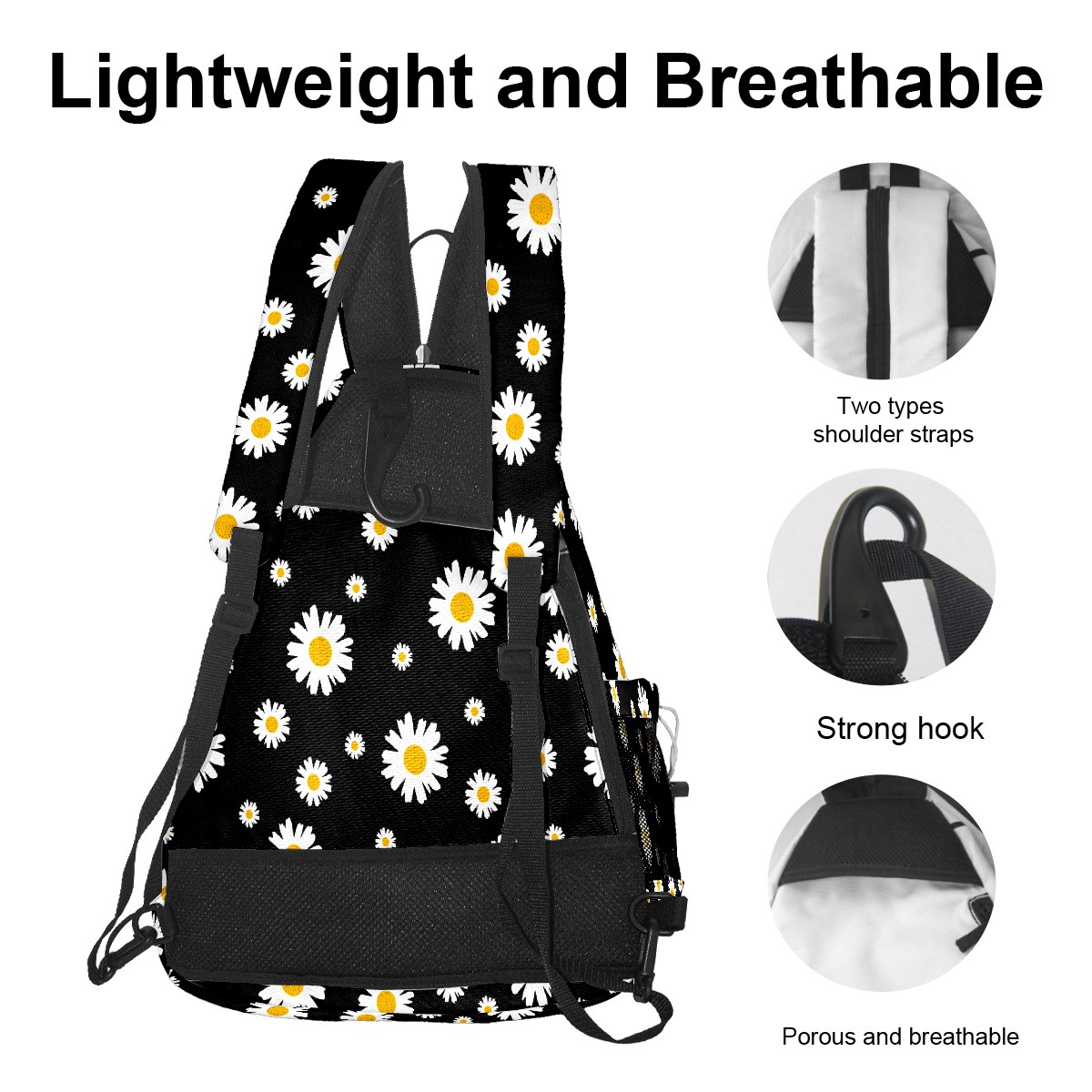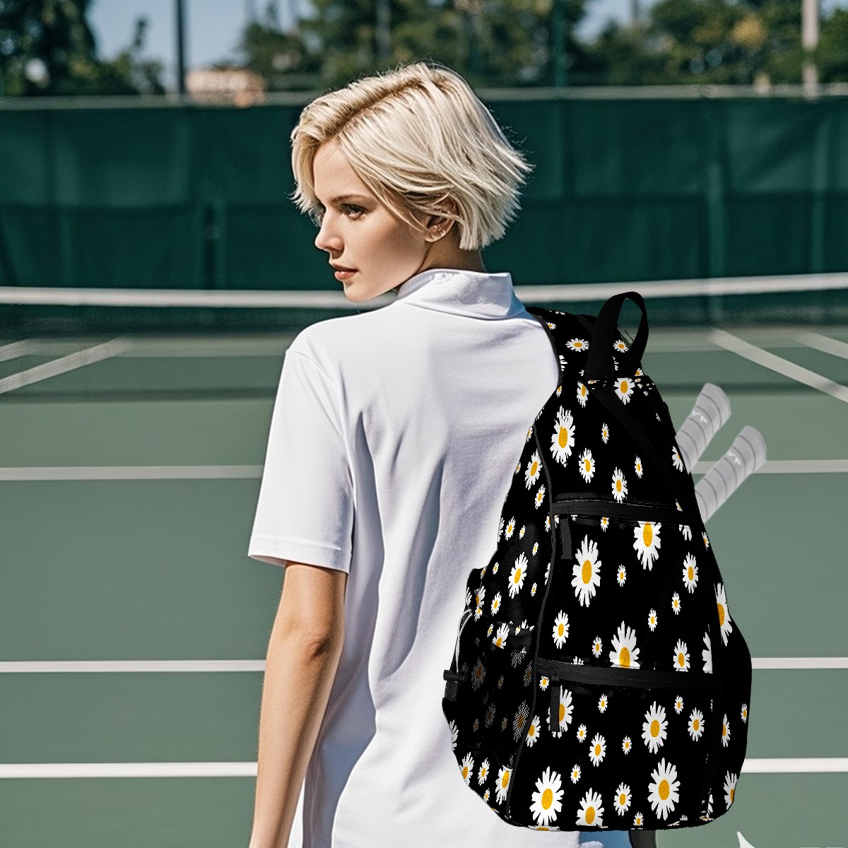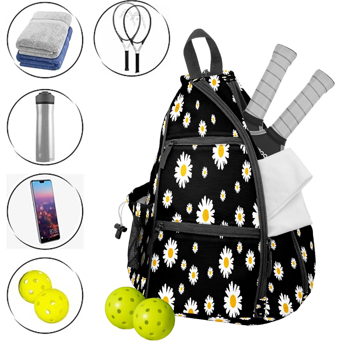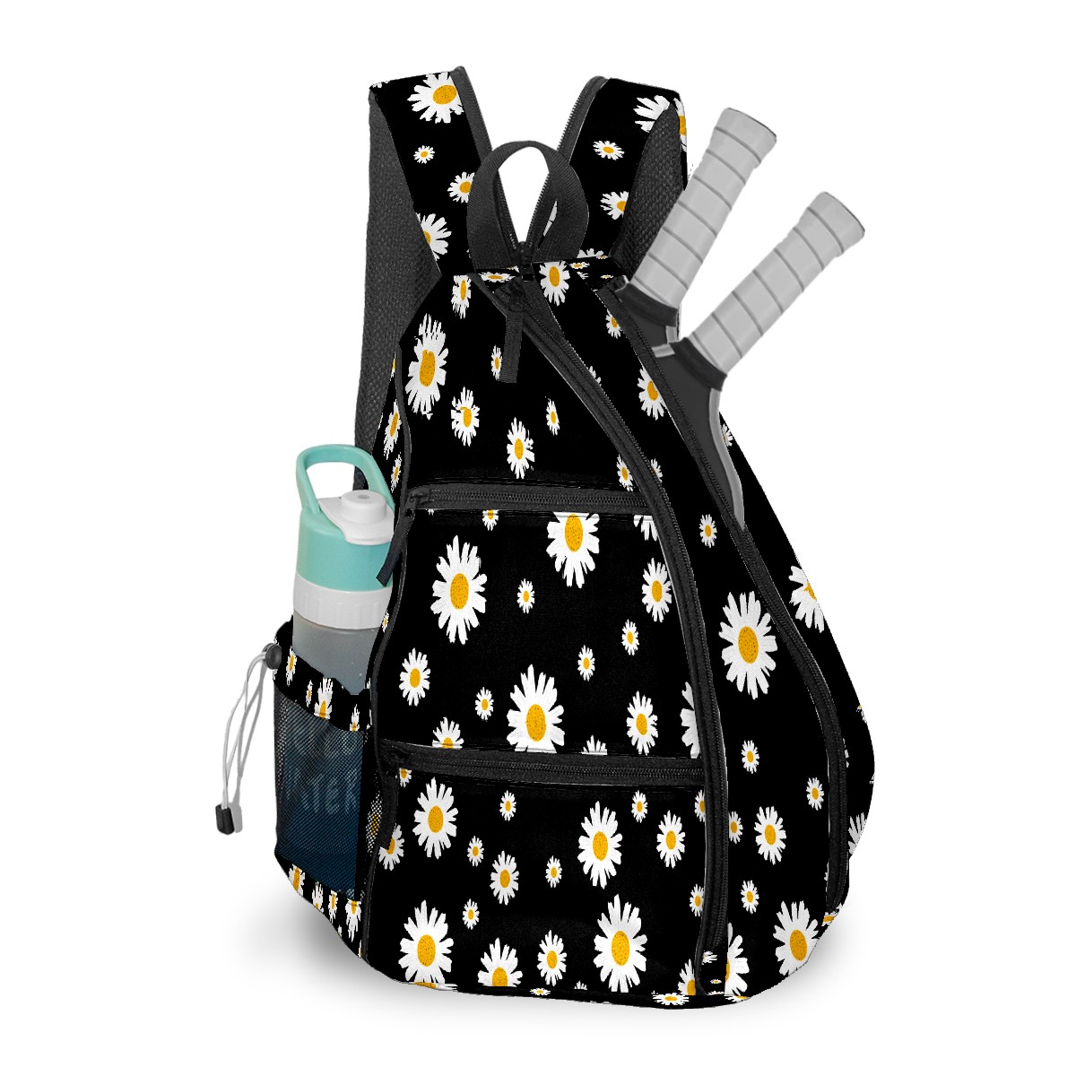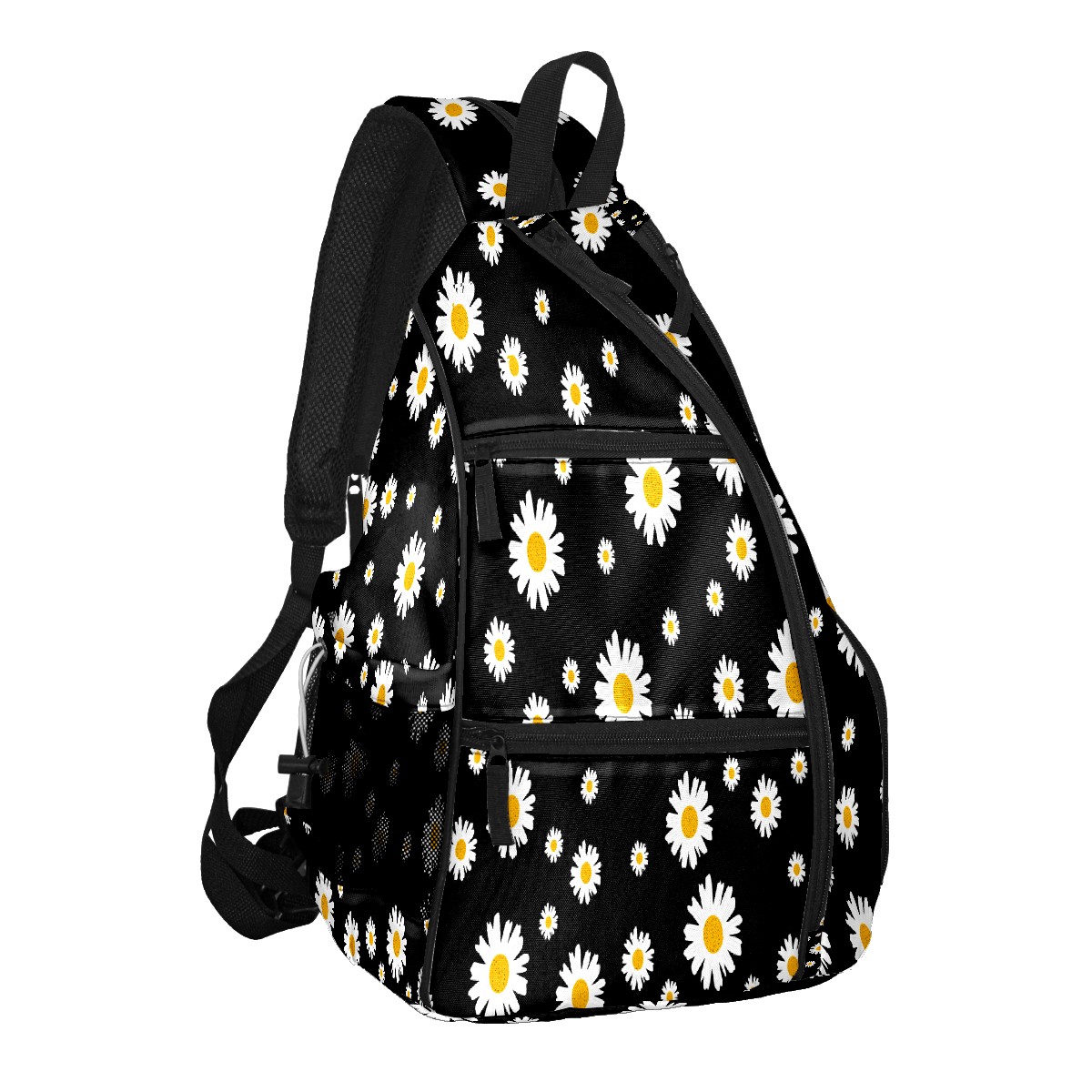 Pickleball Bag White Daisy On Black Pickle Ball Backpack for Women Men Premium Lightweight Crossbody Sling Bag Sports Backpack for Pickleball Paddle Tennis
