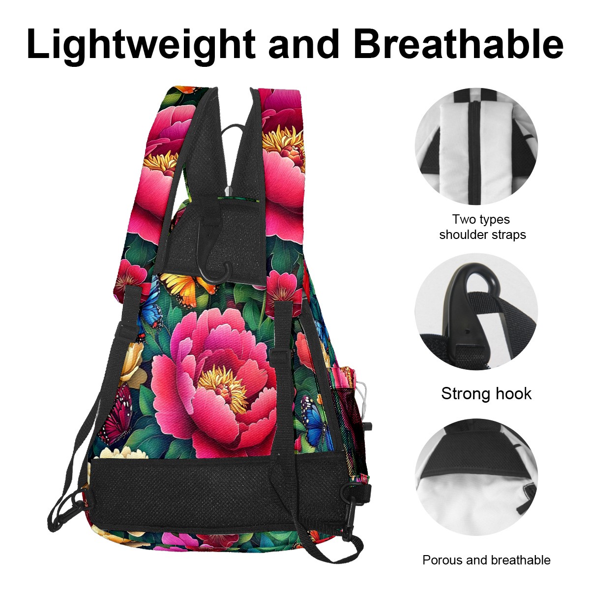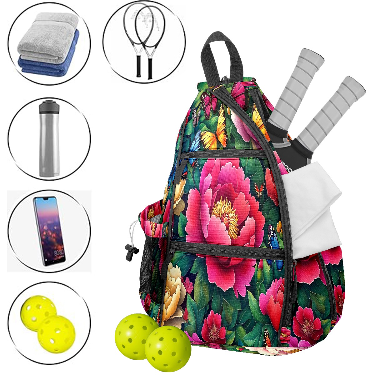 <p>ADJUSTABLE & VERSATILE</p> <p>Convertible Shoulder Strap: Wear it on either shoulder and adjust the length for maximum comfort. Perfect for left- or right-handed players!</p> <p>SPACIOUS & ORGANIZED</p> <p>5 Multi-Functional Pockets + Water Bottle Holder</p> <p>Fits 2-4 pickleball paddles + balls (or 2+ table tennis sets)</p> <p>Hidden anti-theft pocket for cash, keys, or cards – keep valuables secure</p> <p>Dimensions: 14"W × 6"D × 18"H – Compact yet roomy.</p>