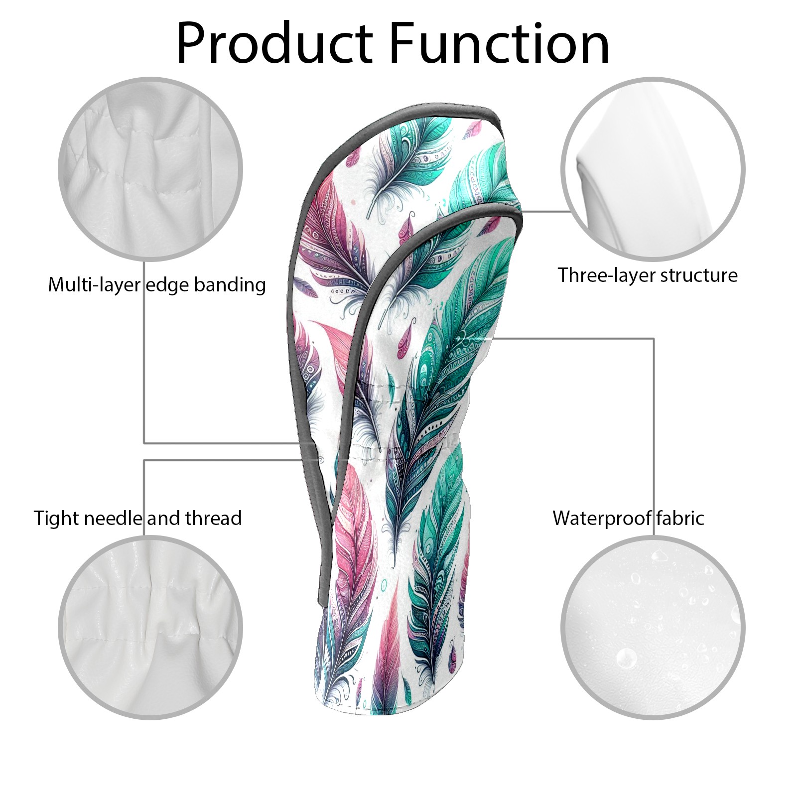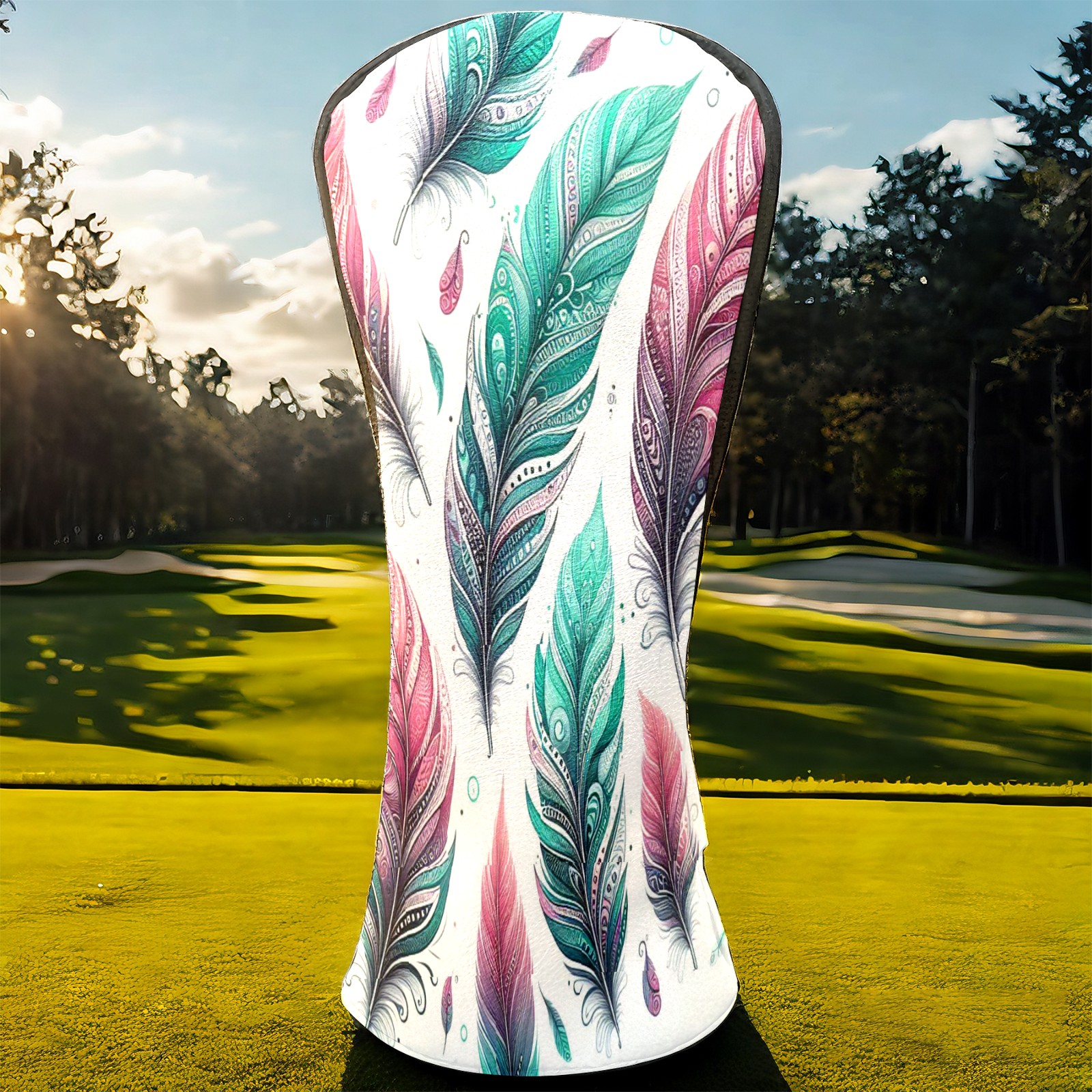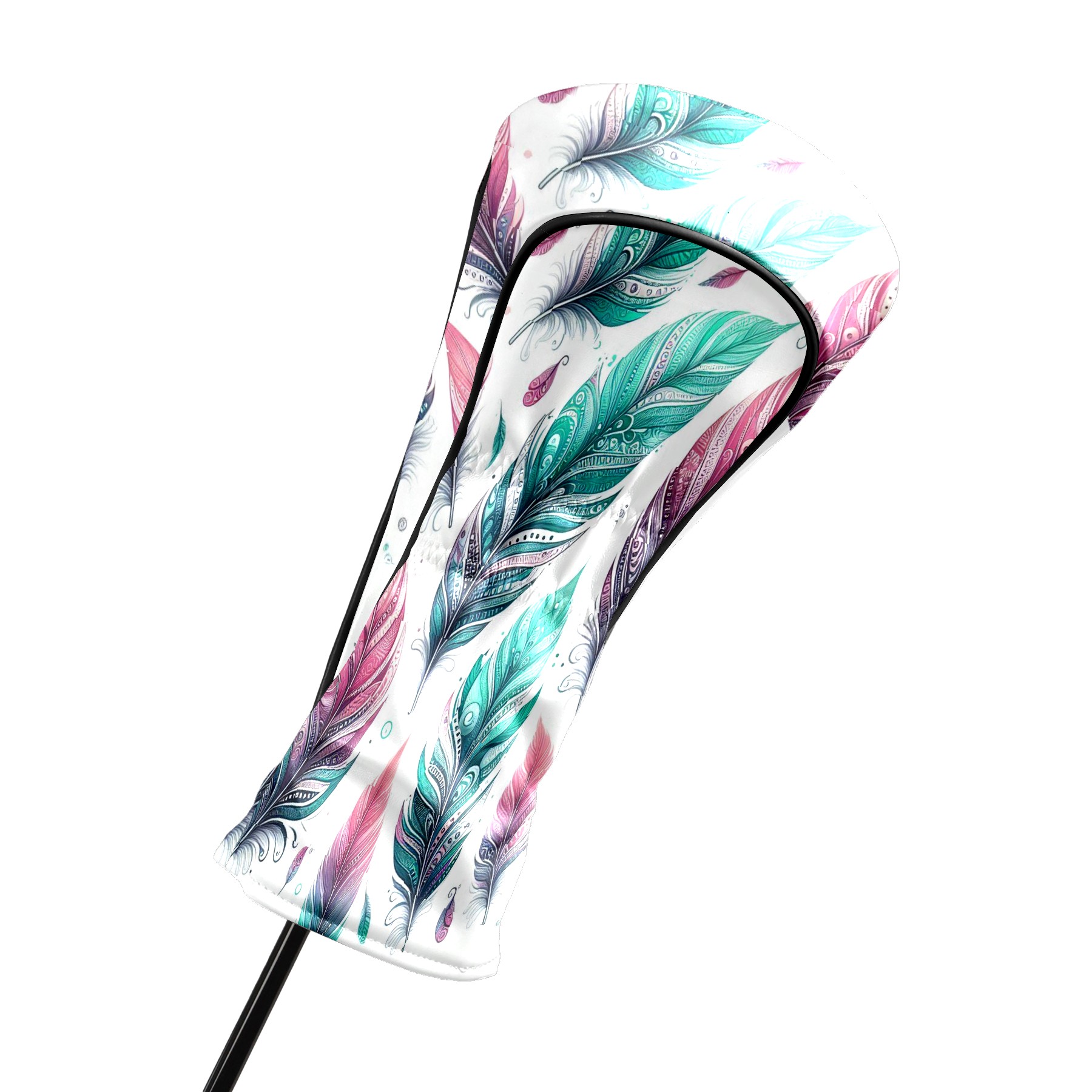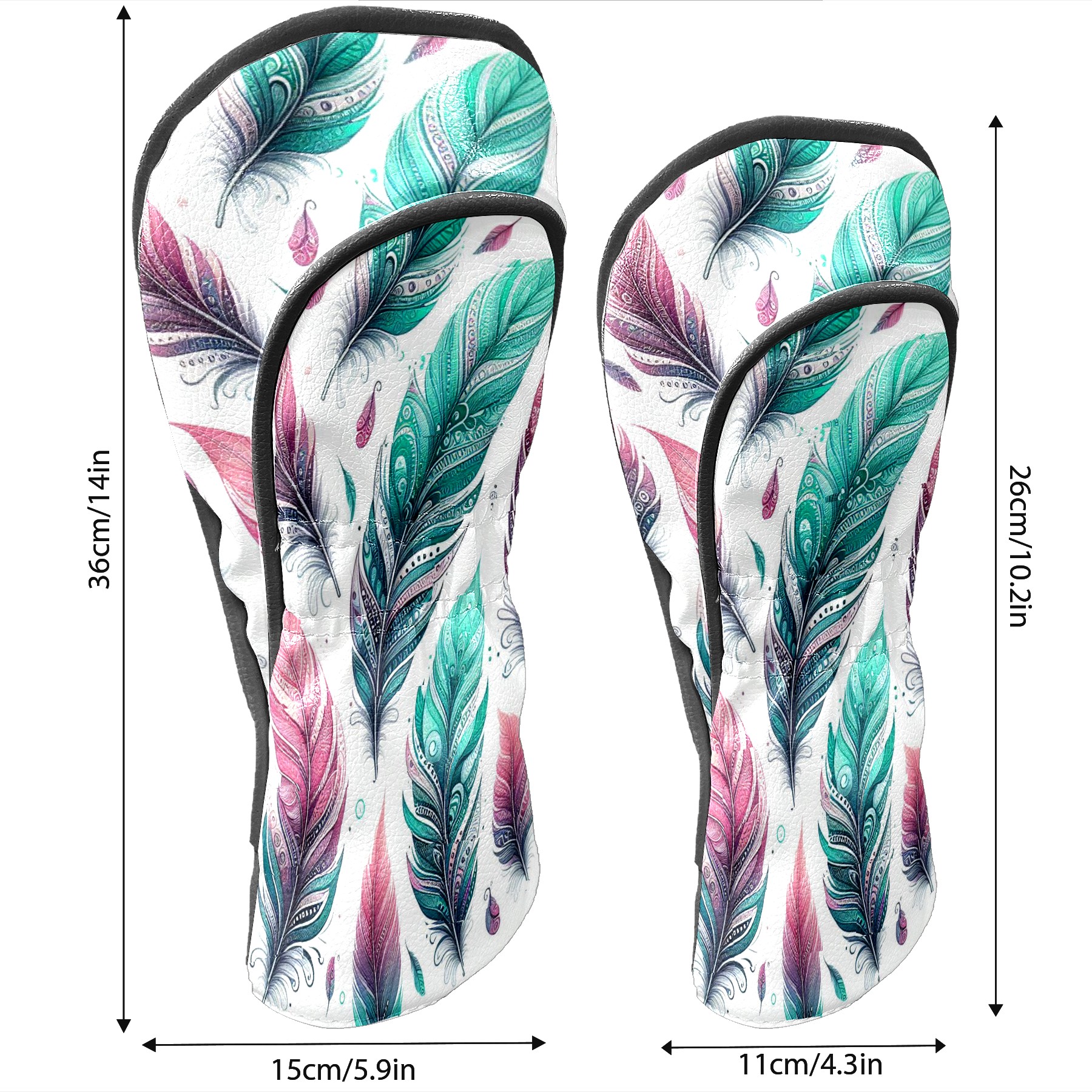 Golf Club Covers, Green Blue Feathers Premium PU Leather Driver Hybrid Putter Head Covers with Velvet Lining, Waterproof Golf Gifts for Men Women