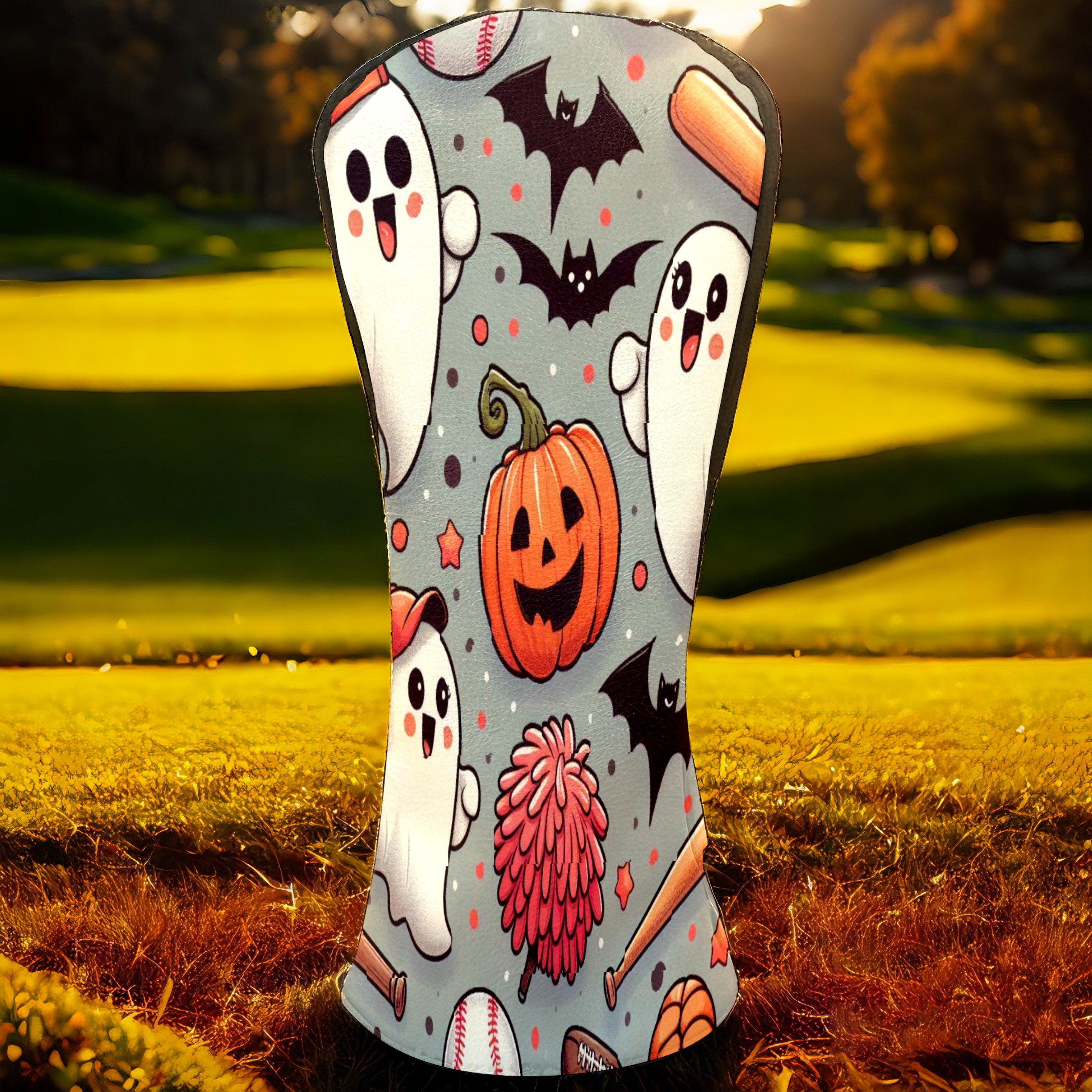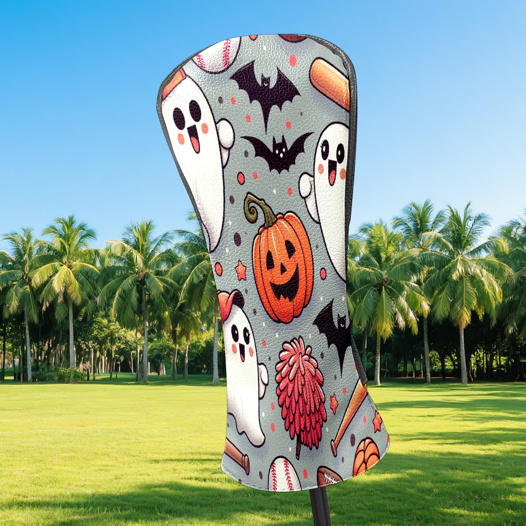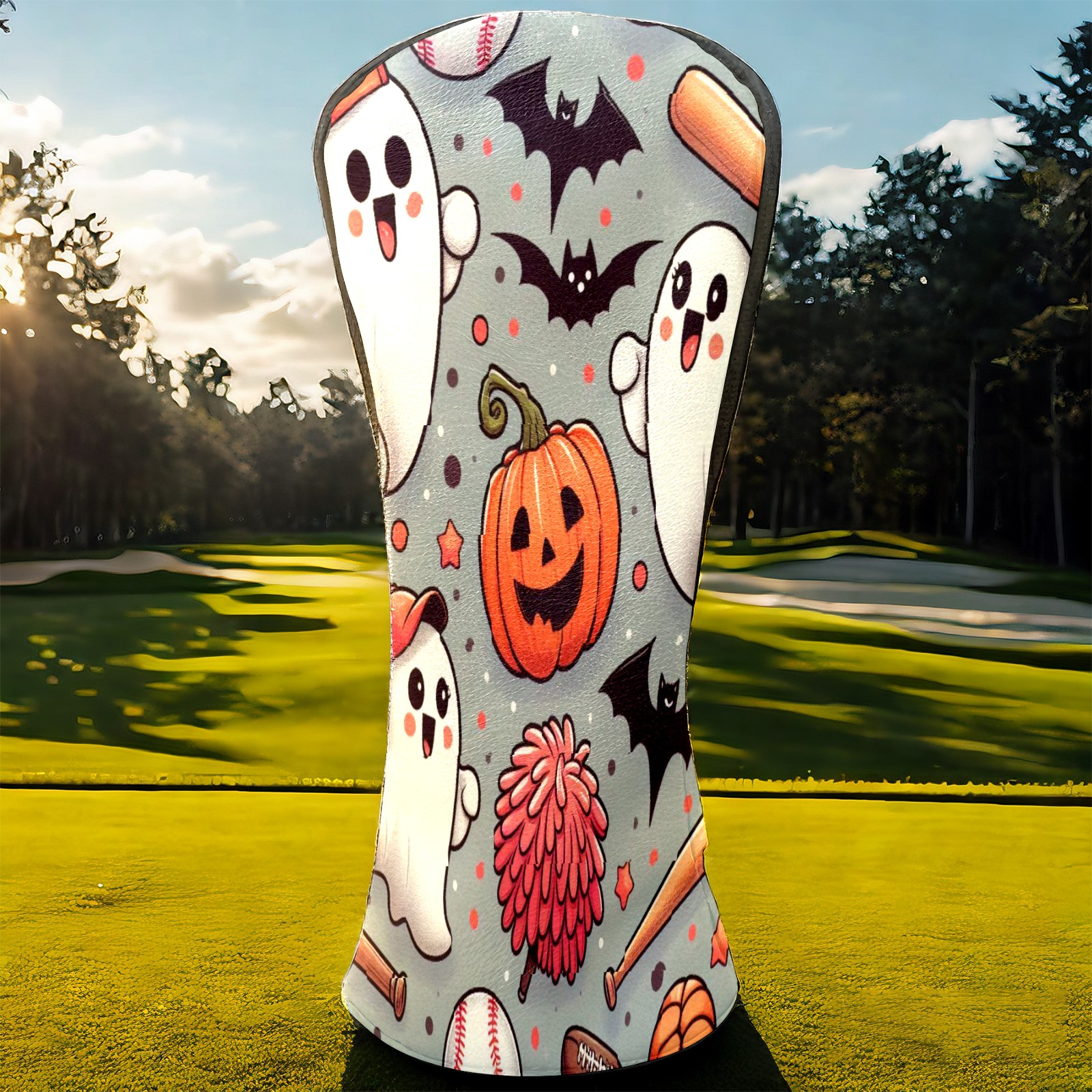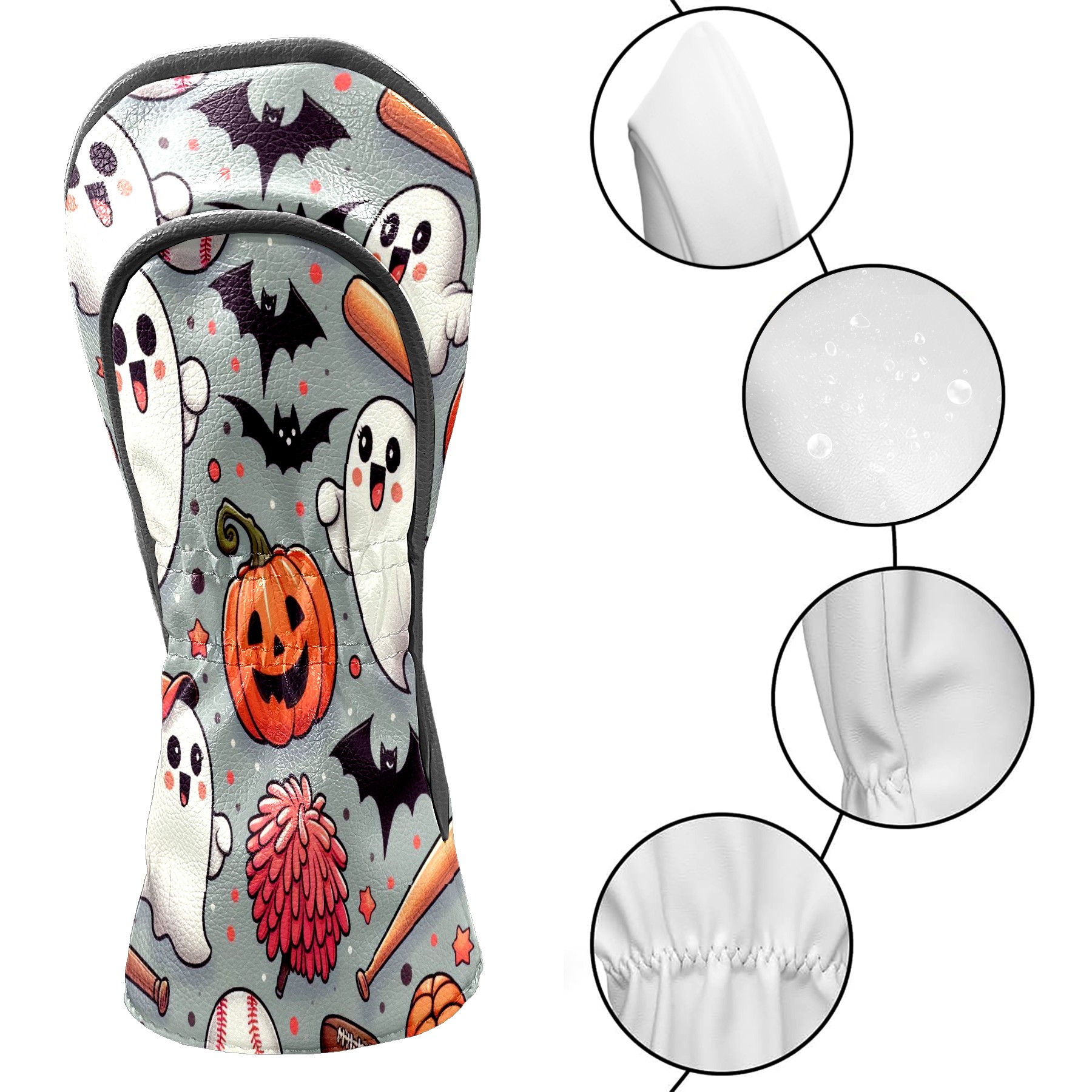 Golf Club Covers, Orange Ghost Pumpkin Premium PU Leather Driver Hybrid Putter Head Covers with Velvet Lining, Waterproof Golf Gifts for Men Women