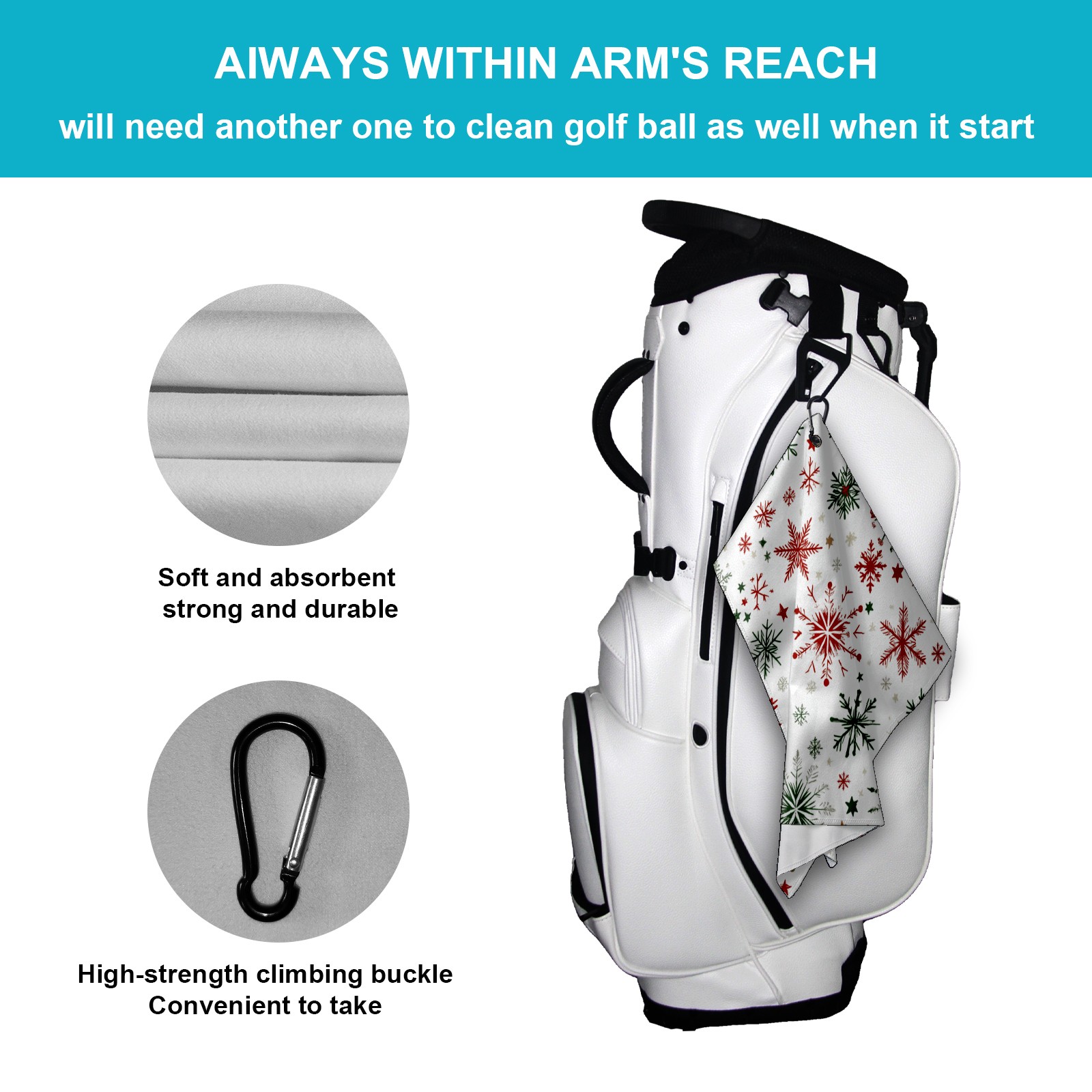 • <p>This premium golf towel is crafted from ultra-absorbent polyester for fast drying, reducing moisture and odor. The generous 15.7"x23.6" size provides ample coverage, while the compact design fits easily in your golf bag. The included secure buckle clip ensures easy attachment to your bag, belt, or backpack. Lightweight yet durable, it's ideal for golf, fitness, hiking, and more.</p>