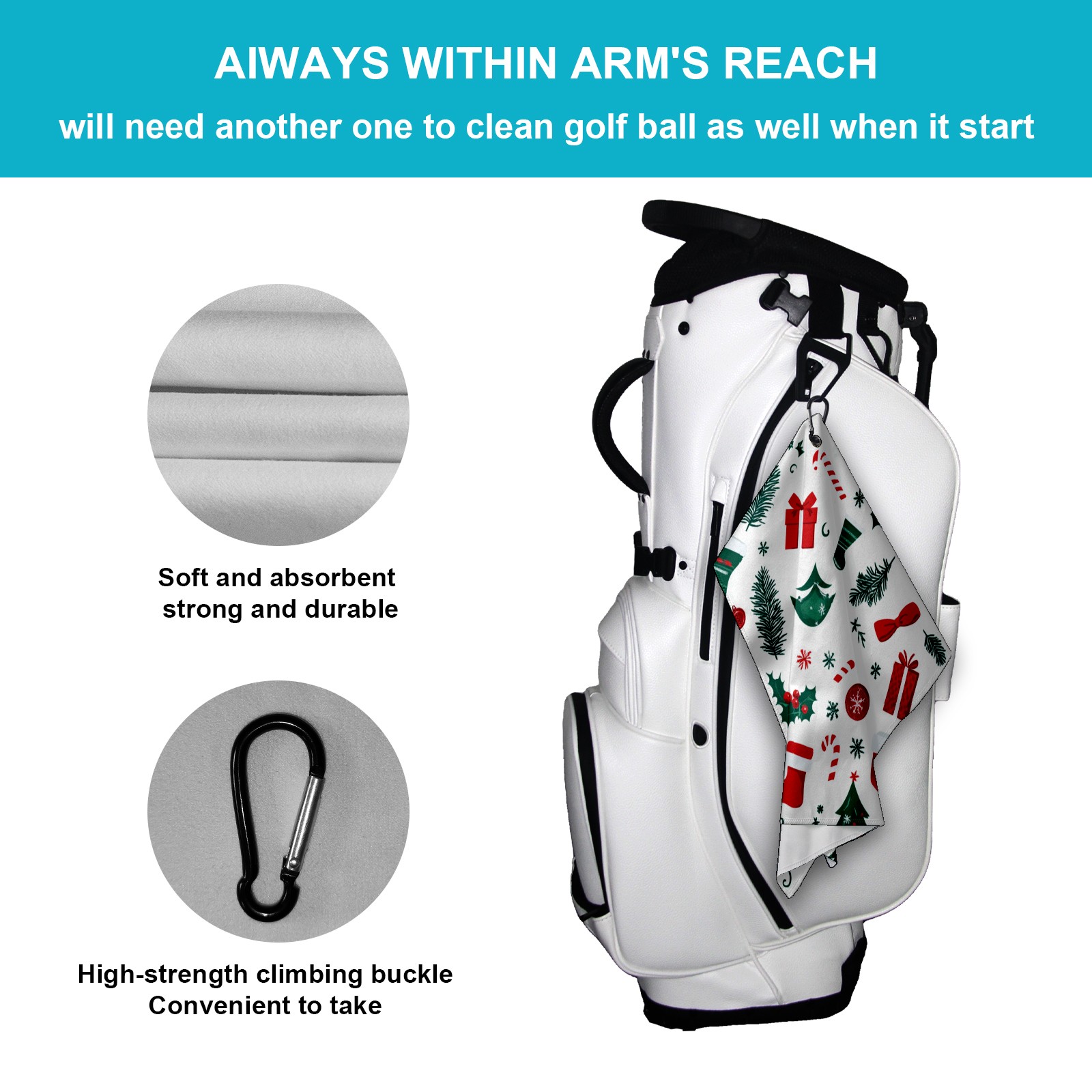 • <p>This premium golf towel is crafted from ultra-absorbent polyester for fast drying, reducing moisture and odor. The generous 15.7"x23.6" size provides ample coverage, while the compact design fits easily in your golf bag. The included secure buckle clip ensures easy attachment to your bag, belt, or backpack. Lightweight yet durable, it's ideal for golf, fitness, hiking, and more.</p>