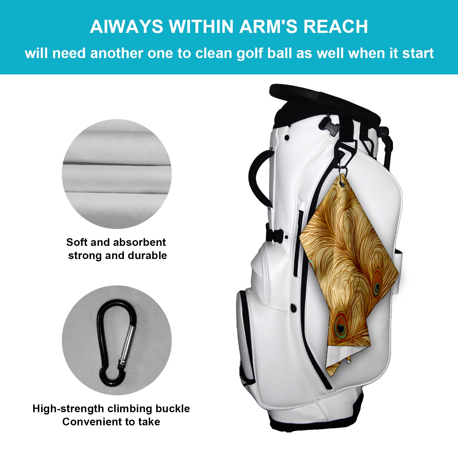• <p>This premium golf towel is crafted from ultra-absorbent polyester for fast drying, reducing moisture and odor. The generous 15.7"x23.6" size provides ample coverage, while the compact design fits easily in your golf bag. The included secure buckle clip ensures easy attachment to your bag, belt, or backpack. Lightweight yet durable, it's ideal for golf, fitness, hiking, and more.</p>