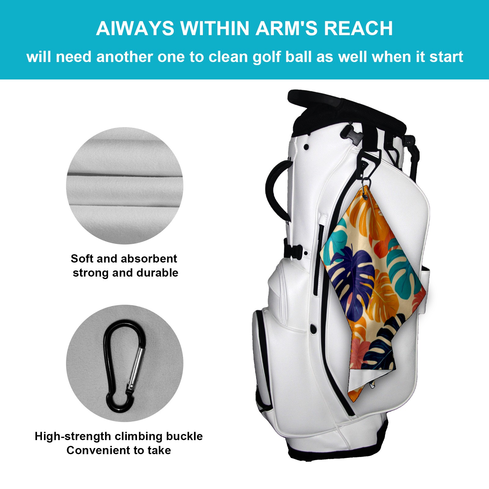 • <p>This premium golf towel is crafted from ultra-absorbent polyester for fast drying, reducing moisture and odor. The generous 15.7"x23.6" size provides ample coverage, while the compact design fits easily in your golf bag. The included secure buckle clip ensures easy attachment to your bag, belt, or backpack. Lightweight yet durable, it's ideal for golf, fitness, hiking, and more.</p>