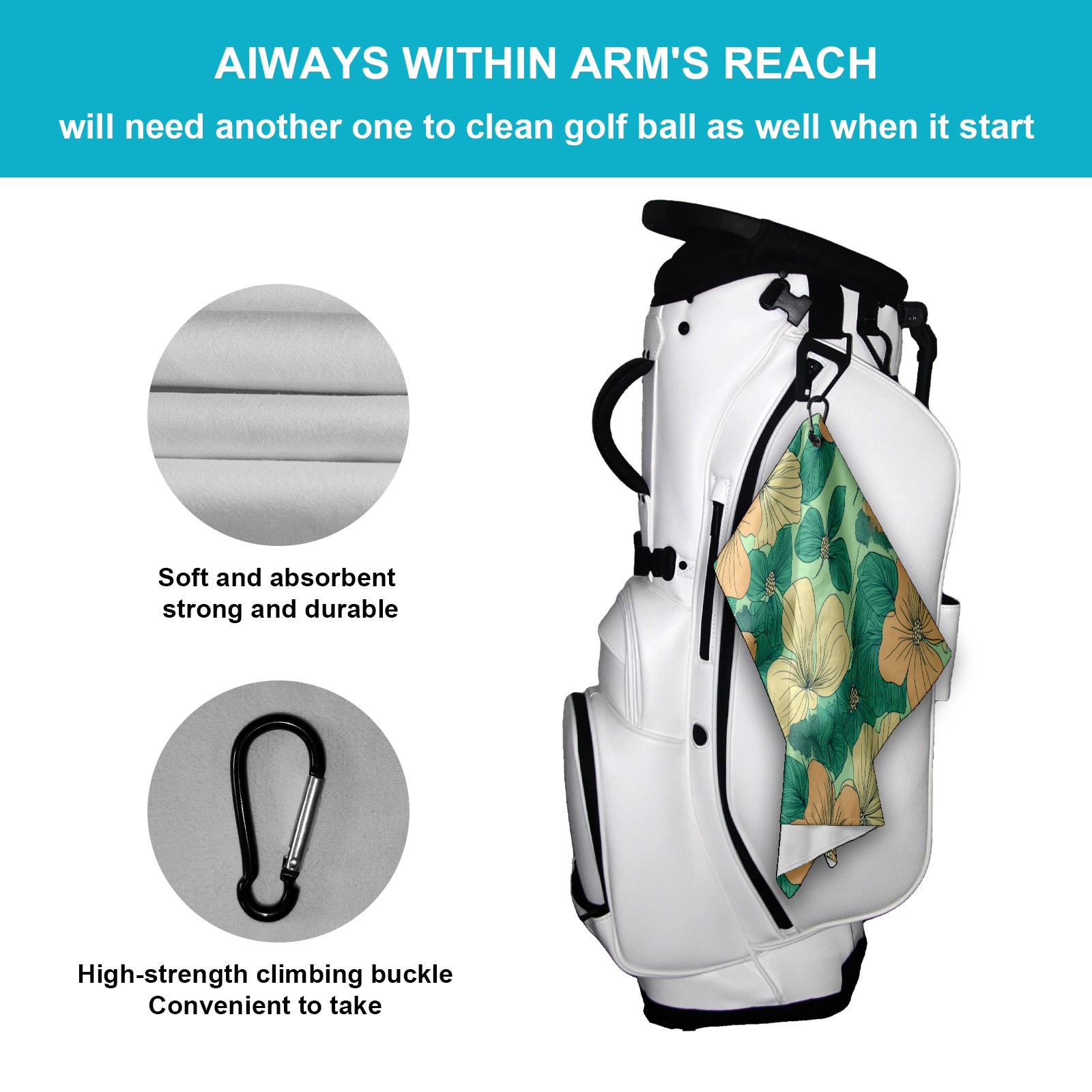 • <p>This premium golf towel is crafted from ultra-absorbent polyester for fast drying, reducing moisture and odor. The generous 15.7"x23.6" size provides ample coverage, while the compact design fits easily in your golf bag. The included secure buckle clip ensures easy attachment to your bag, belt, or backpack. Lightweight yet durable, it's ideal for golf, fitness, hiking, and more.</p>