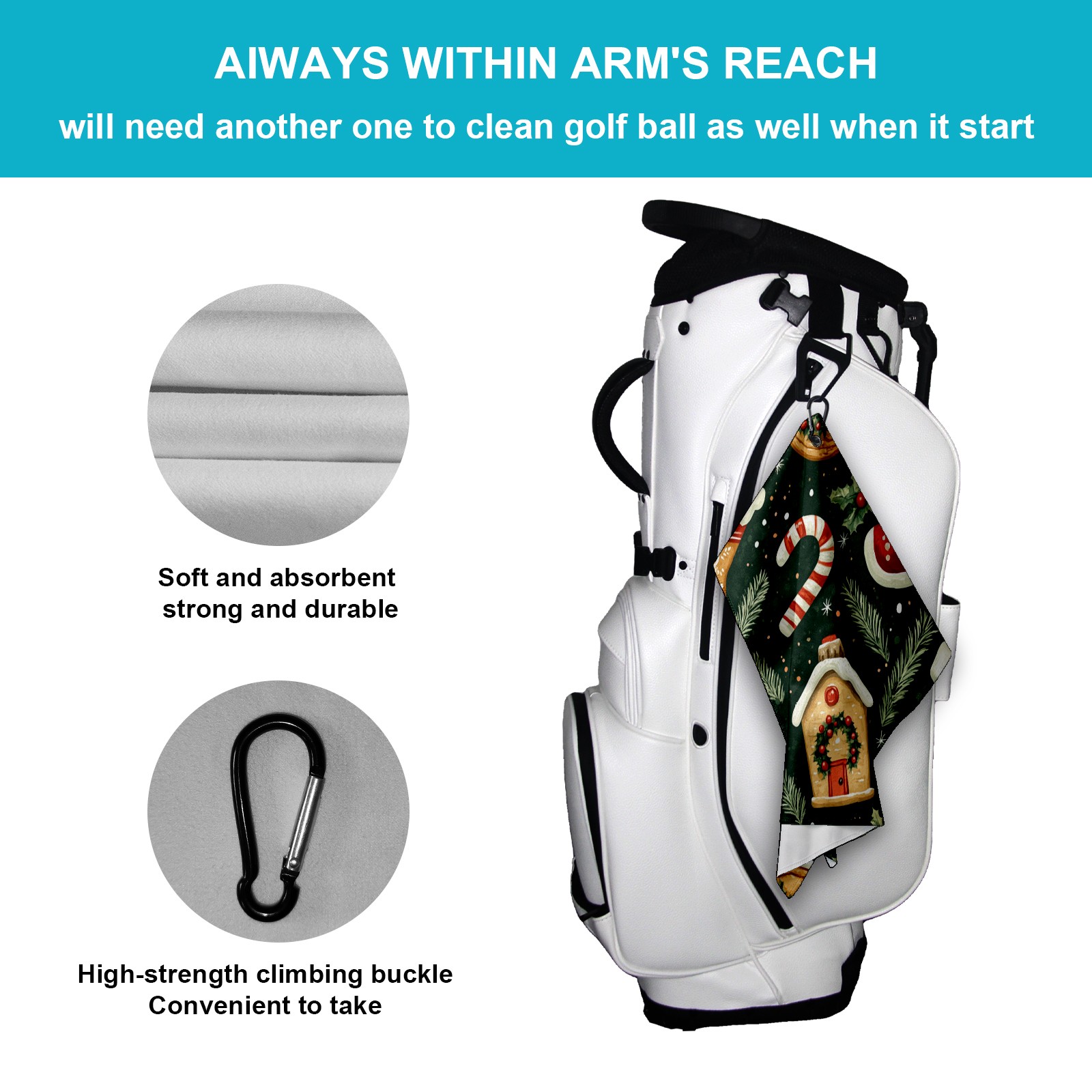 • <p>This golf towel is a magical tool for cleaning the golf course, combining practicality and convenience. The golden size of 40cm×60cm (16inx24cm) is light and does not take up space, and can be easily stored in a golf bag. It is made of lightweight and durable material, with high water absorption and quick drying properties, which can quickly absorb water stains and say goodbye to the trouble of damp odor. The unique multi-functional buckle clip design can be fixed to the golf bag or waistband at will, and can be used whenever you want. Whether it is cleaning clubs, wiping sweat, or taking care of golf balls, it can easily do the job. As a gift for holidays, birthdays, and anniversaries, it is given to family and friends who love golf. It is practical and considerate, and it is a must-have golf item that men, women, young and old can't put down.</p>