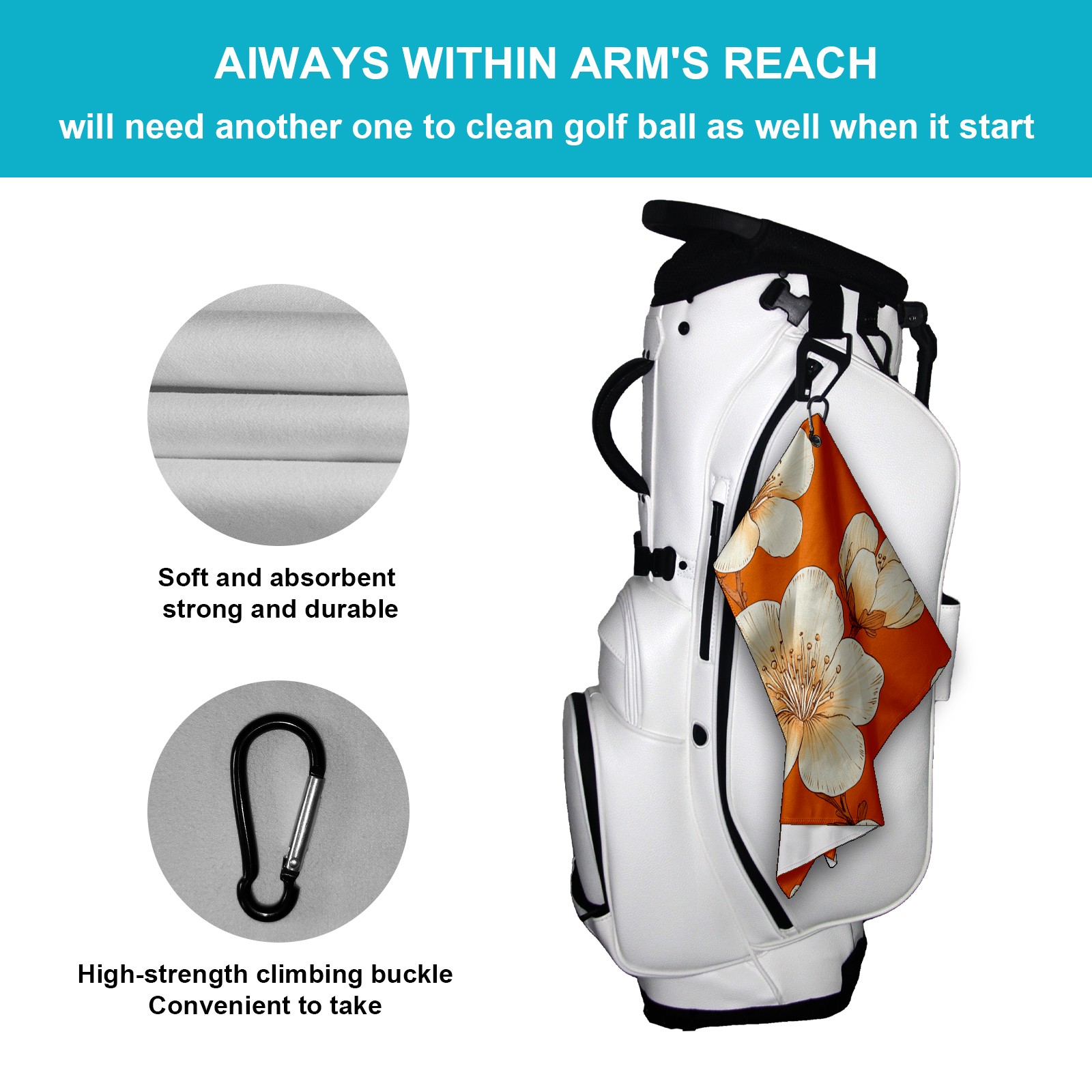 • <p>This golf towel is a magical tool for cleaning the golf course, combining practicality and convenience. The golden size of 40cm×60cm (16inx24cm) is light and does not take up space, and can be easily stored in a golf bag. It is made of lightweight and durable material, with high water absorption and quick drying properties, which can quickly absorb water stains and say goodbye to the trouble of damp odor. The unique multi-functional buckle clip design can be fixed to the golf bag or waistband at will, and can be used whenever you want. Whether it is cleaning clubs, wiping sweat, or taking care of golf balls, it can easily do the job. As a gift for holidays, birthdays, and anniversaries, it is given to family and friends who love golf. It is practical and considerate, and it is a must-have golf item that men, women, young and old can't put down.</p>