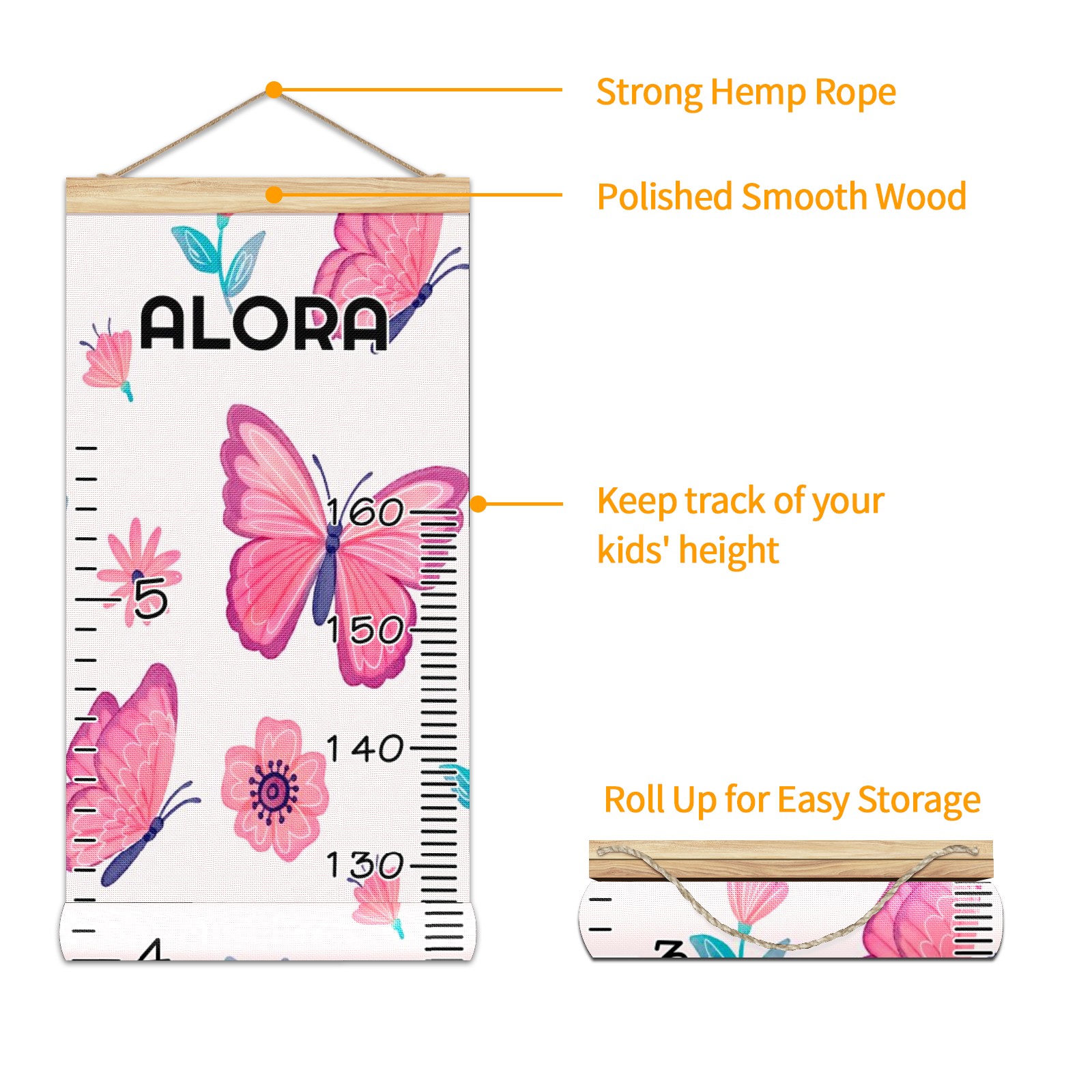 Personalized Kids Name Growth Chart Ruler for Wall Wood Frame Canvas Height Measure Chart 13.4x56 in Hanging Growth Chart Pink Butterfly & Flower10.9 Boys Girls Room Decor