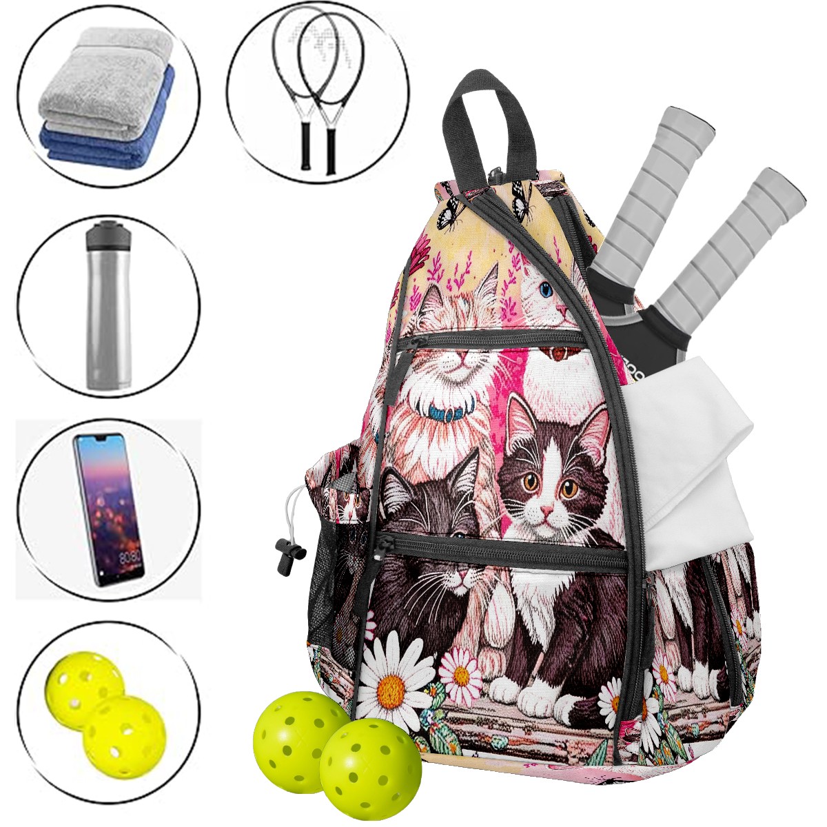 <p>ADJUSTABLE & VERSATILE</p> <p>Convertible Shoulder Strap: Wear it on either shoulder and adjust the length for maximum comfort. Perfect for left- or right-handed players!</p> <p>SPACIOUS & ORGANIZED</p> <p>5 Multi-Functional Pockets + Water Bottle Holder</p> <p>Fits 2-4 pickleball paddles + balls (or 2+ table tennis sets)</p> <p>Hidden anti-theft pocket for cash, keys, or cards – keep valuables secure</p> <p>Dimensions: 14"W × 6"D × 18"H – Compact yet roomy.</p>