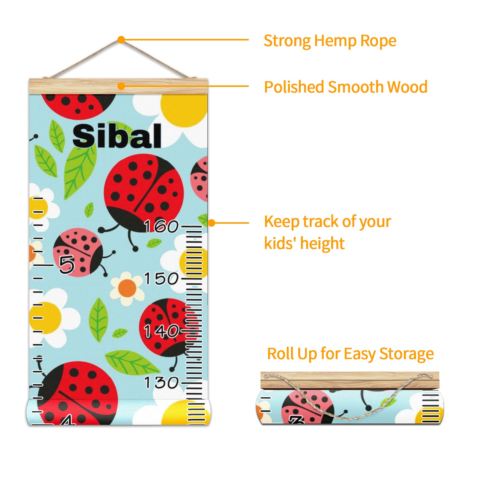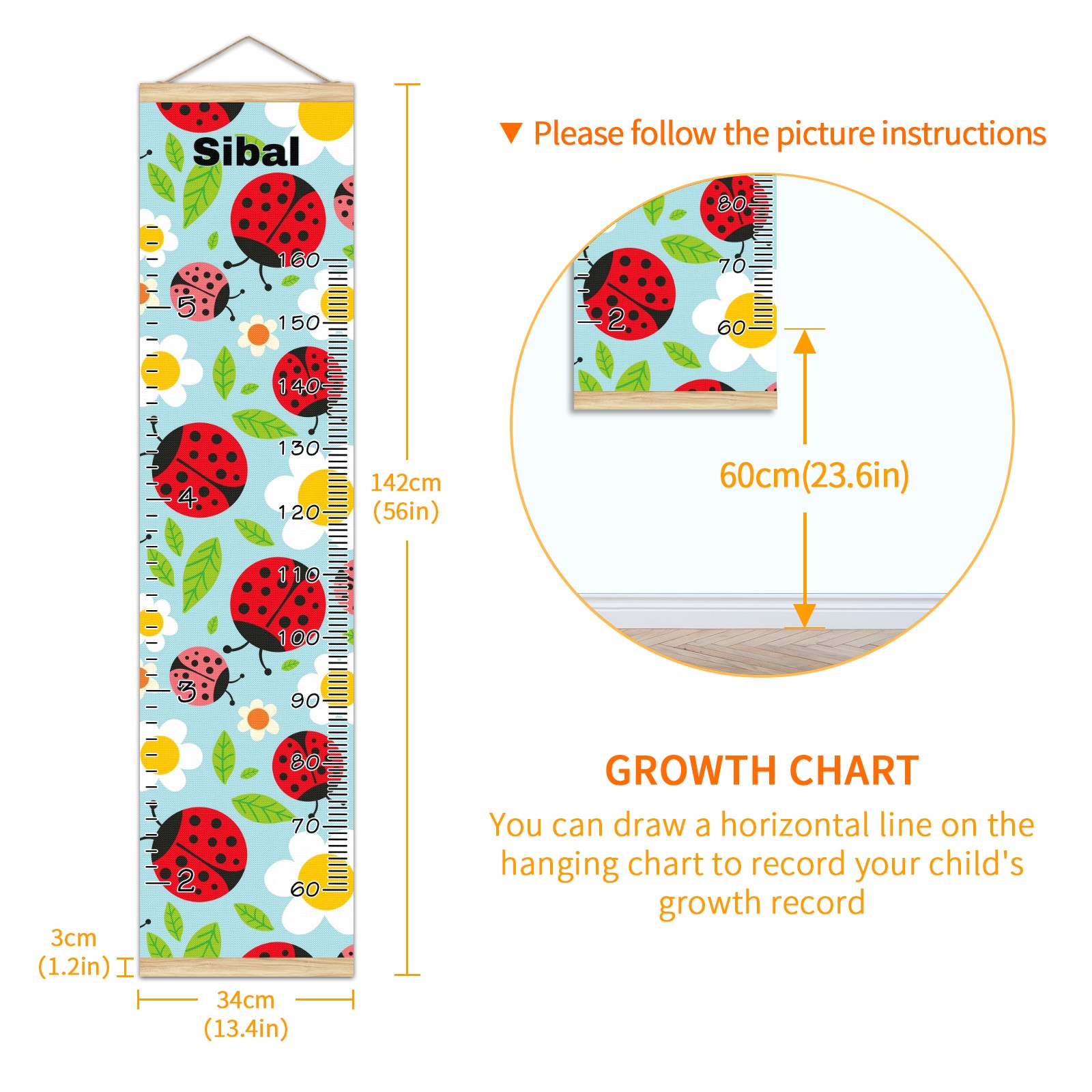 Personalized Kids Name Growth Chart Ruler for Wall Wood Frame Canvas Height Measure Chart 13.4x56 in Hanging Growth Chart Ladybugs And Flowers10.13 Boys Girls Room Decor