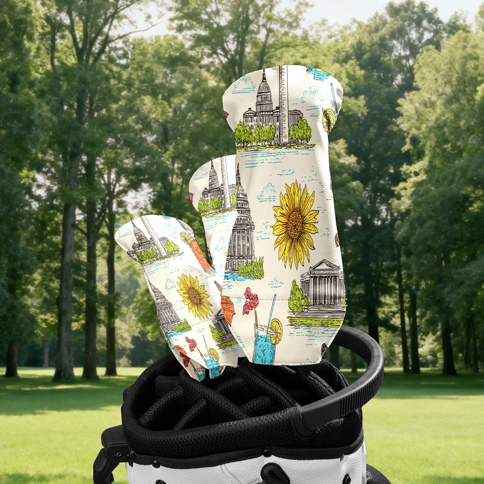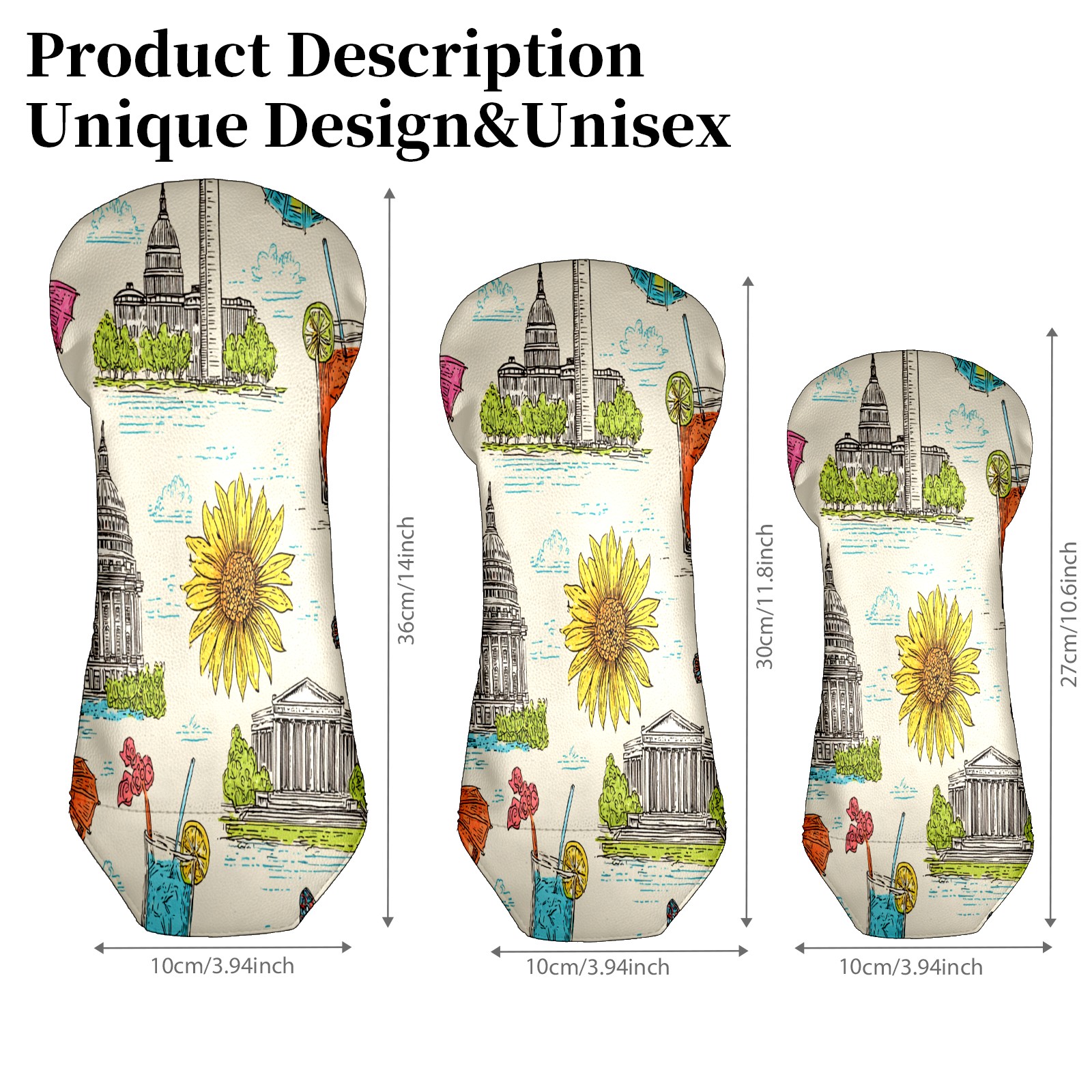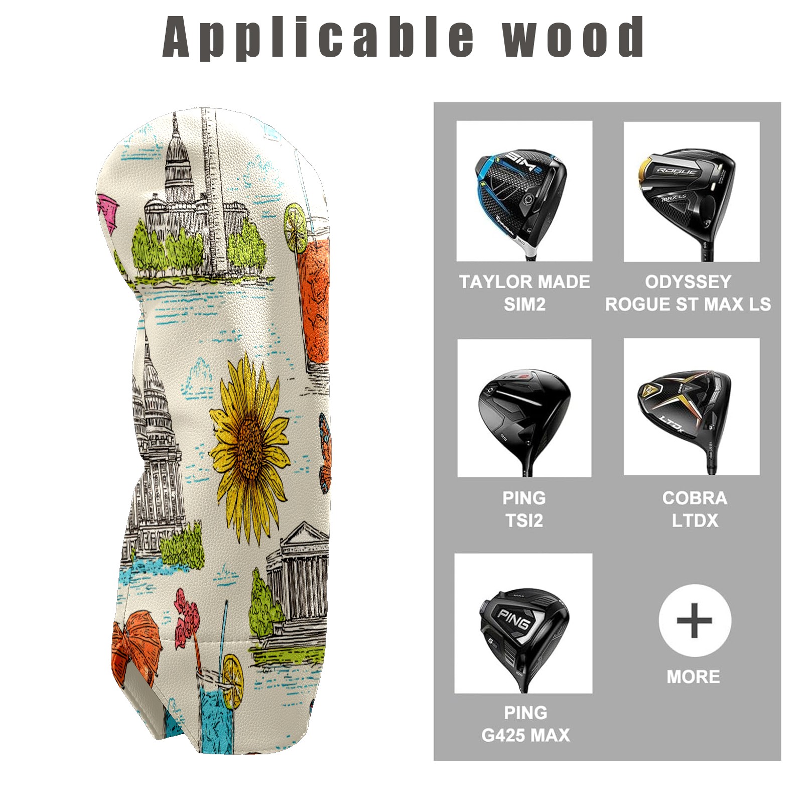 Golf Club Head Cover Waterproof Leather for Driver & Fairway Wood, Driver Headcovers, Golf Accessories for Men Women, Anti-Scratch, Golf Gift for Golfers, 1/3/5 Wood Cover Colorful City Sunflower Drinks