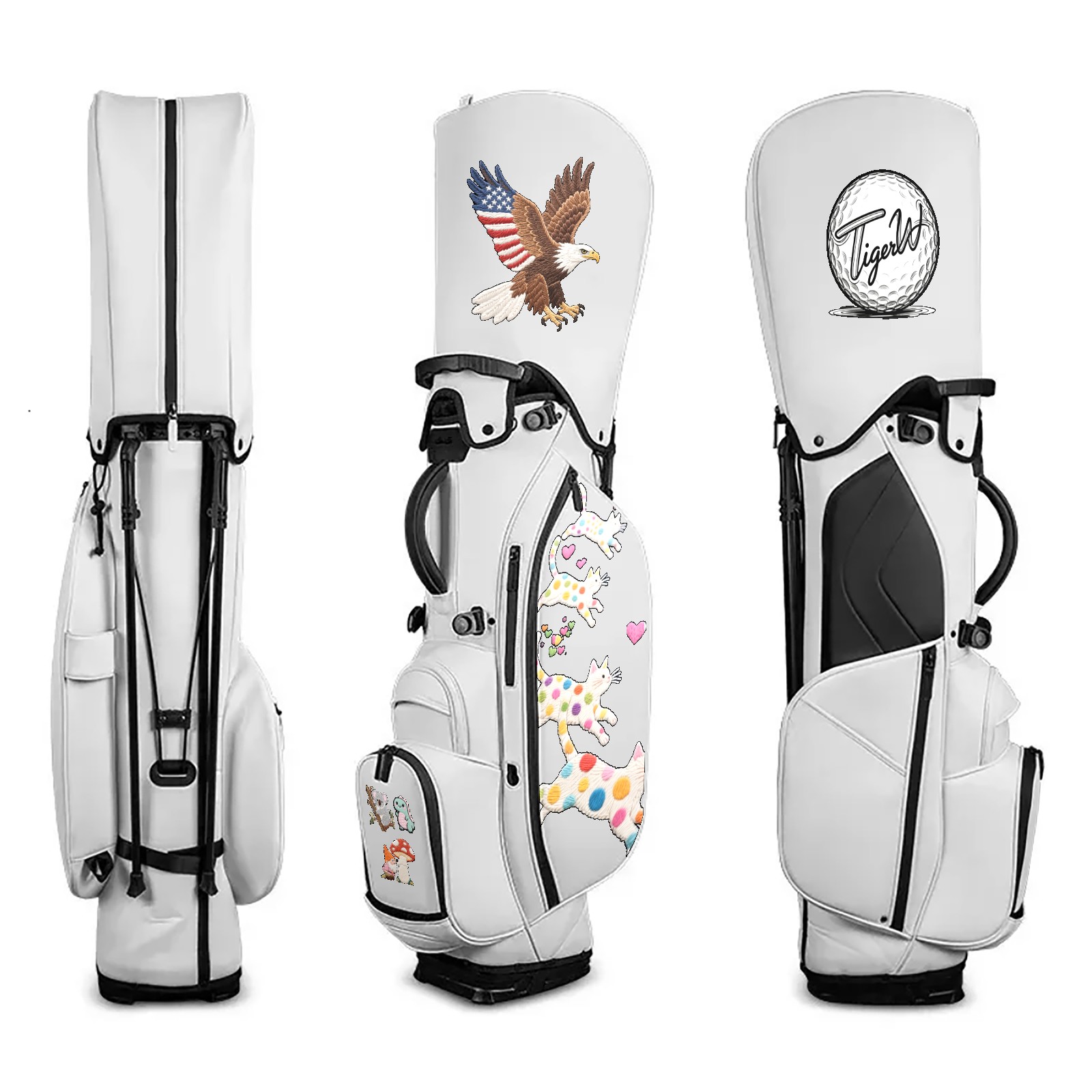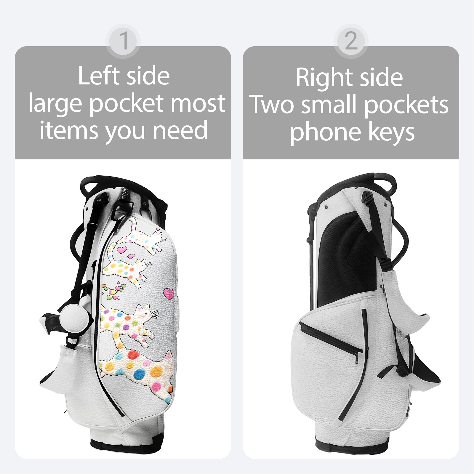<p>The golf bag is carefully crafted with PU leather fabric, with classic lychee pattern and matte texture, available in black and white, and equipped with a dedicated rain cover. It not only looks stylish, but also can protect your clubs and equipment from wind and rain. In terms of storage design, it provides 5/14 compartments of large capacity to effectively protect the clubs; waterproof zipper pockets ensure that items are dry and safe; abundant storage space to meet your storage needs for various necessities. Thickened breathable shoulder straps with adjustable chest buckles evenly disperse shoulder pressure, 14-way partition design on the top of the bag, each iron, wood and putter has a dedicated position, and the bottom anti-wear and anti-slip spikes design can adapt to various complex terrain placements to prevent the bag from tipping over or shaking, escorting your golf trip.</p>
