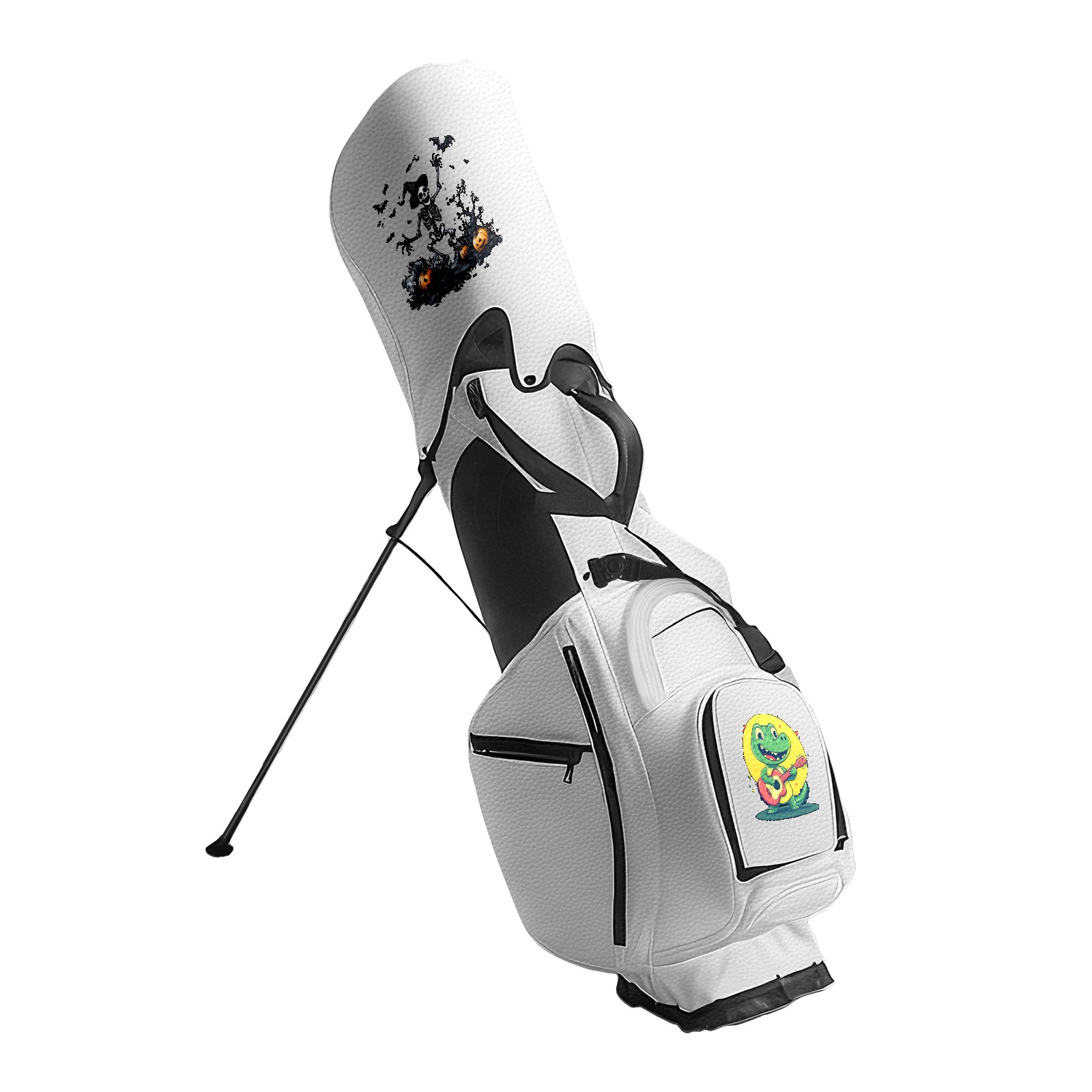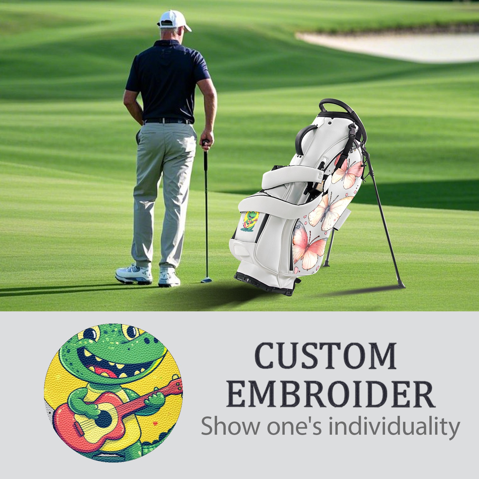 <p>The golf bag is carefully crafted with PU leather fabric, with classic lychee pattern and matte texture, available in black and white, and equipped with a dedicated rain cover. It not only looks stylish, but also can protect your clubs and equipment from wind and rain. In terms of storage design, it provides 5/14 compartments of large capacity to effectively protect the clubs; waterproof zipper pockets ensure that items are dry and safe; abundant storage space to meet your storage needs for various necessities. Thickened breathable shoulder straps with adjustable chest buckles evenly disperse shoulder pressure, 14-way partition design on the top of the bag, each iron, wood and putter has a dedicated position, and the bottom anti-wear and anti-slip spikes design can adapt to various complex terrain placements to prevent the bag from tipping over or shaking, escorting your golf trip.</p>