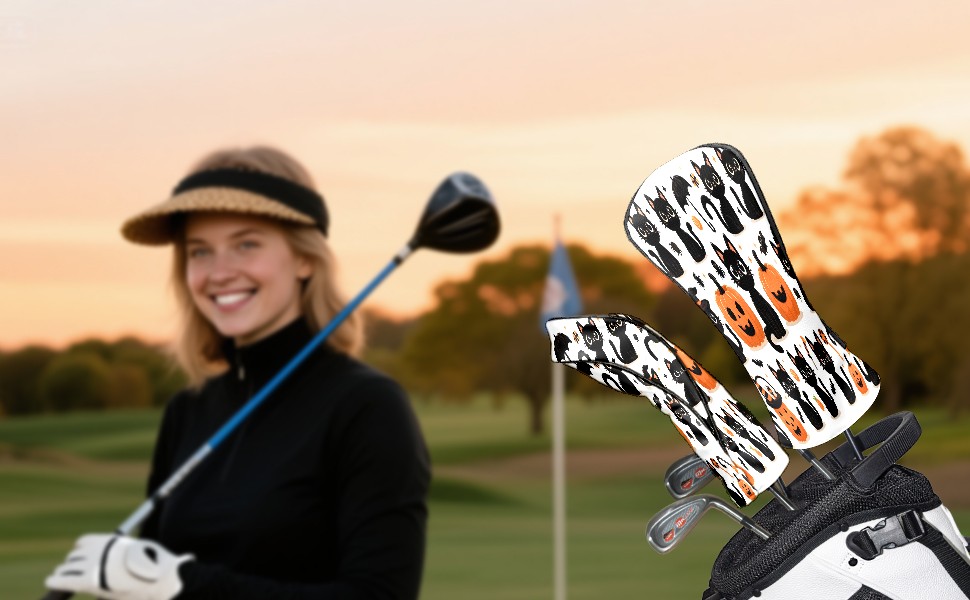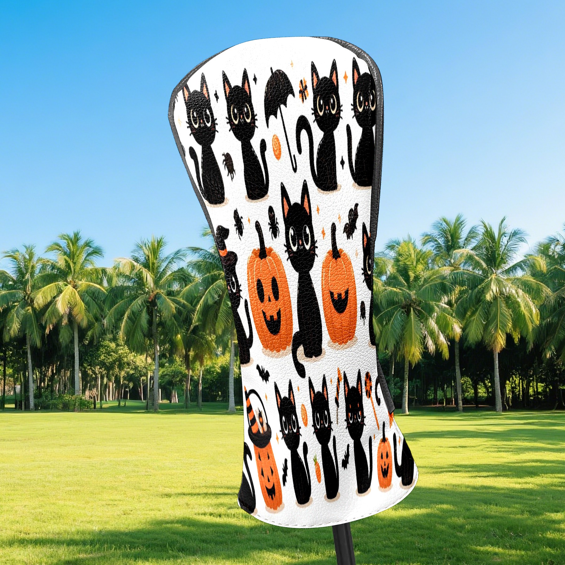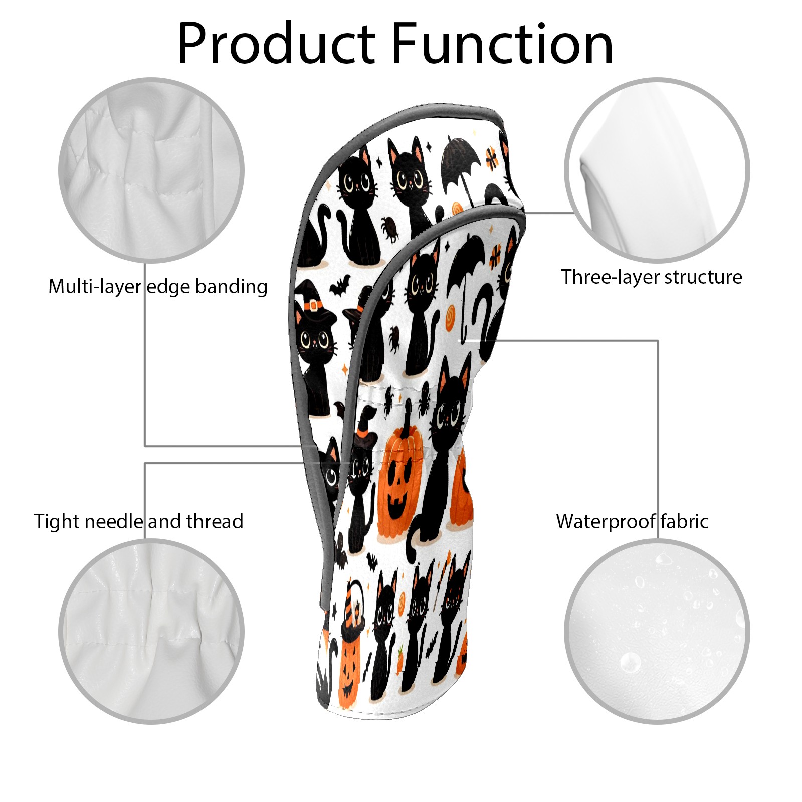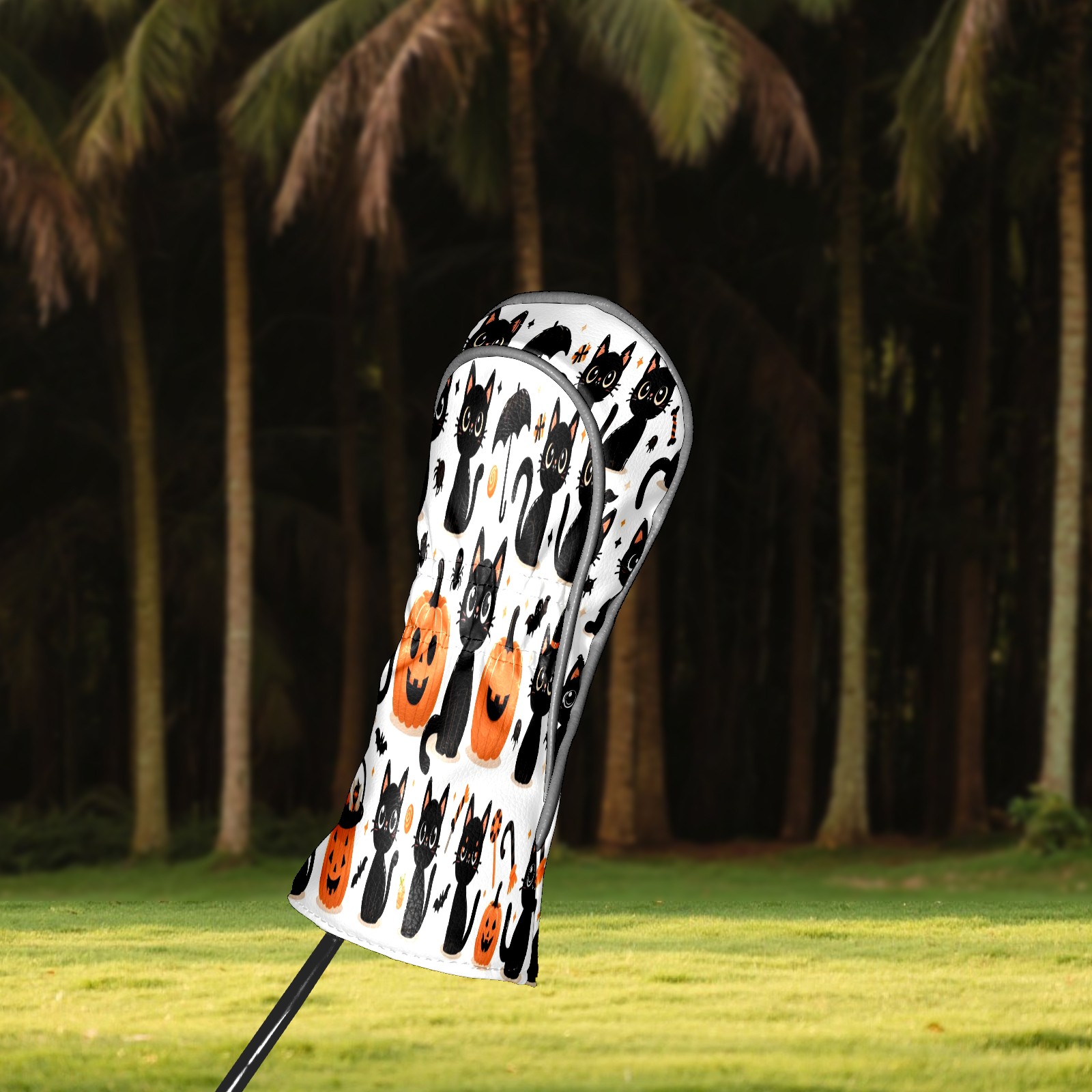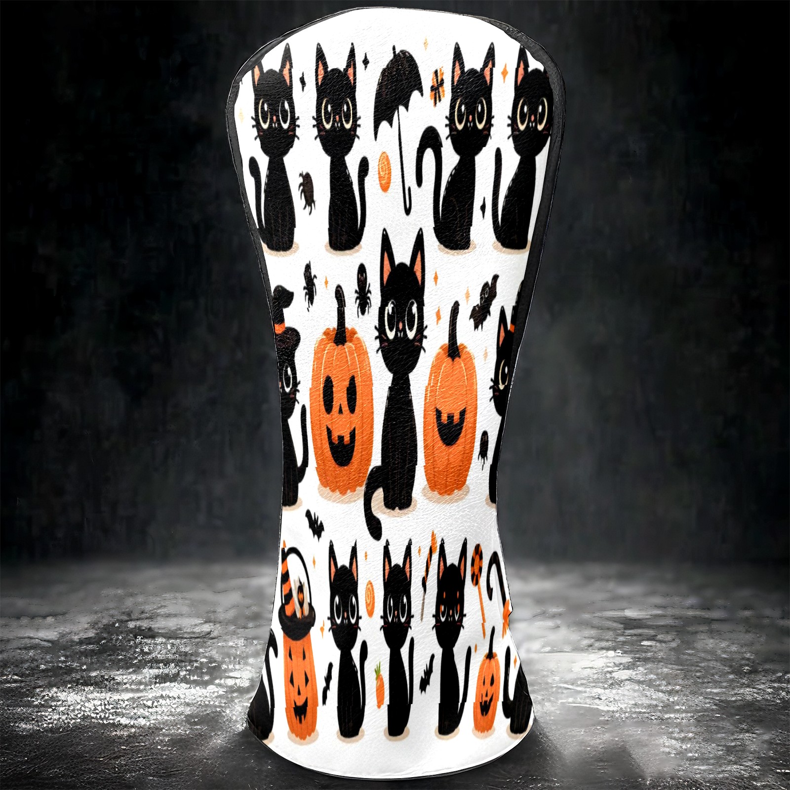 Golf Club Head Covers Halloween Black Cats Pumpkins Horizontal Design for Driver & Hybrid, Waterproof PU Leather with Plush Velvet Lining, Scratch Protection & Secure Fit, Ideal Golf Gift for Men Women