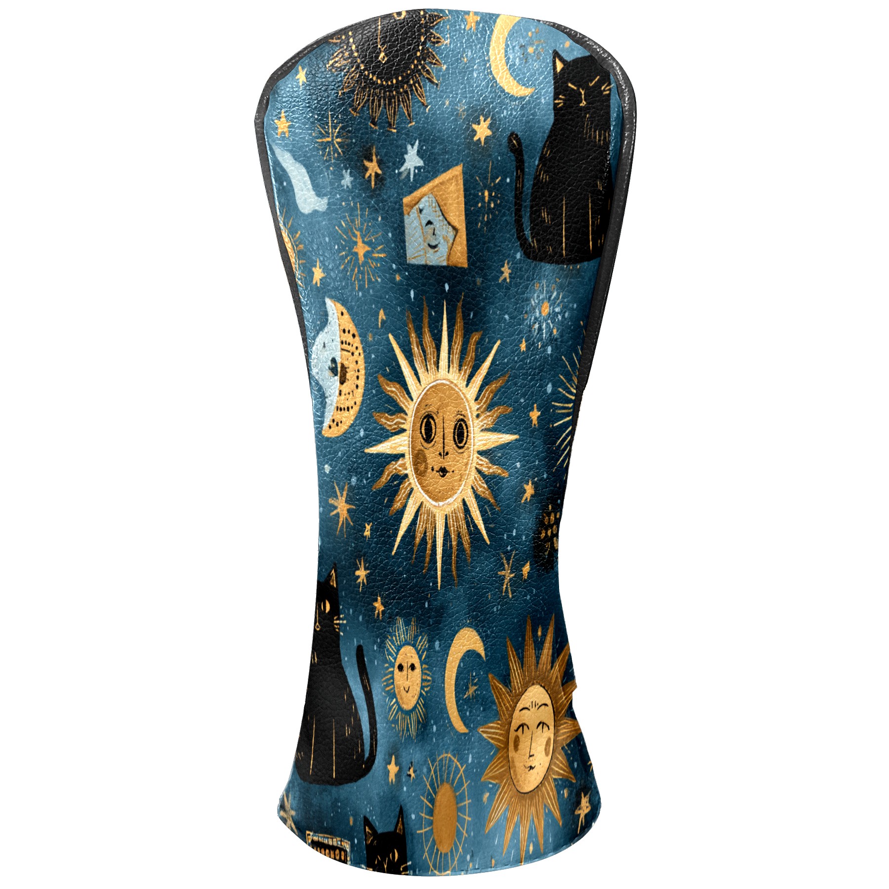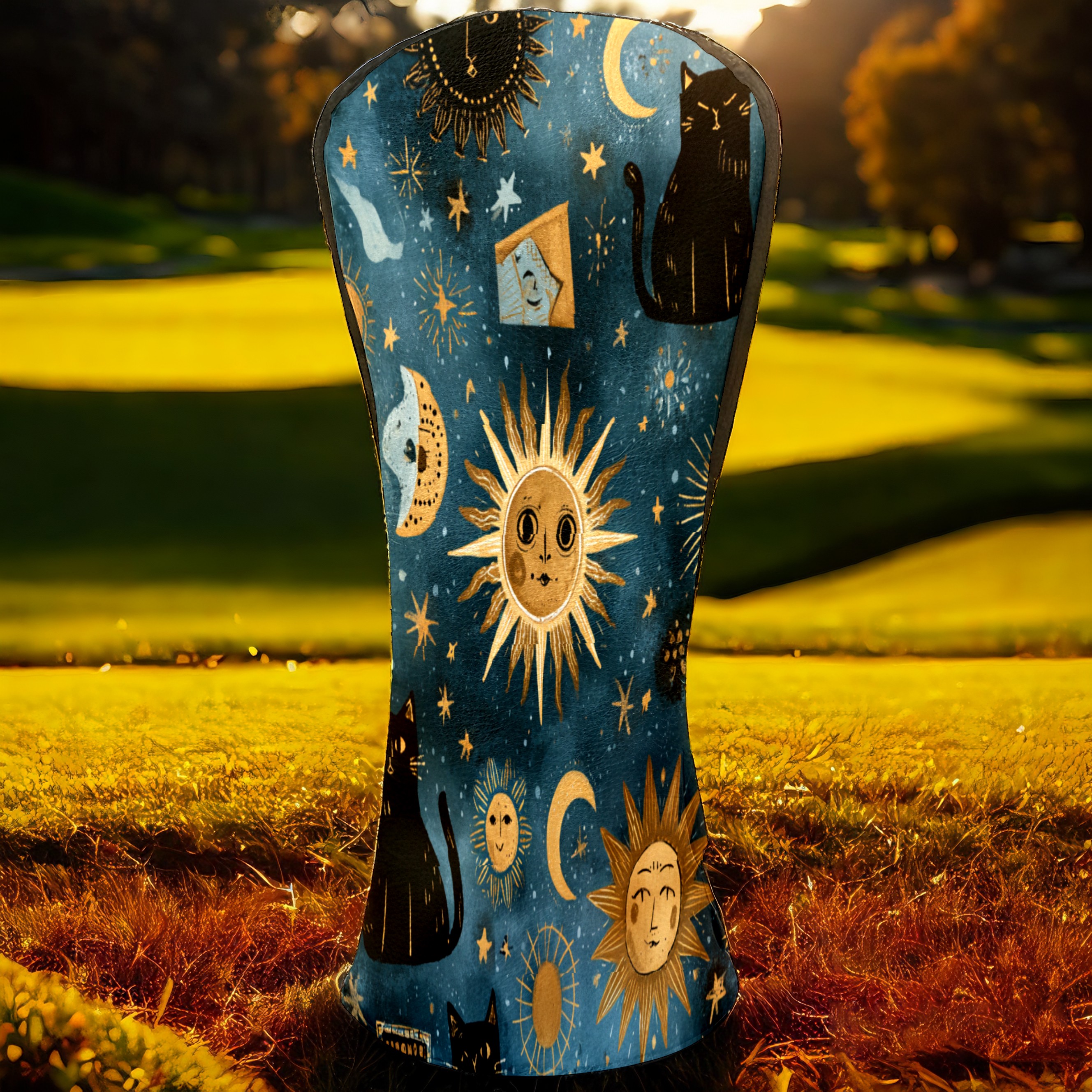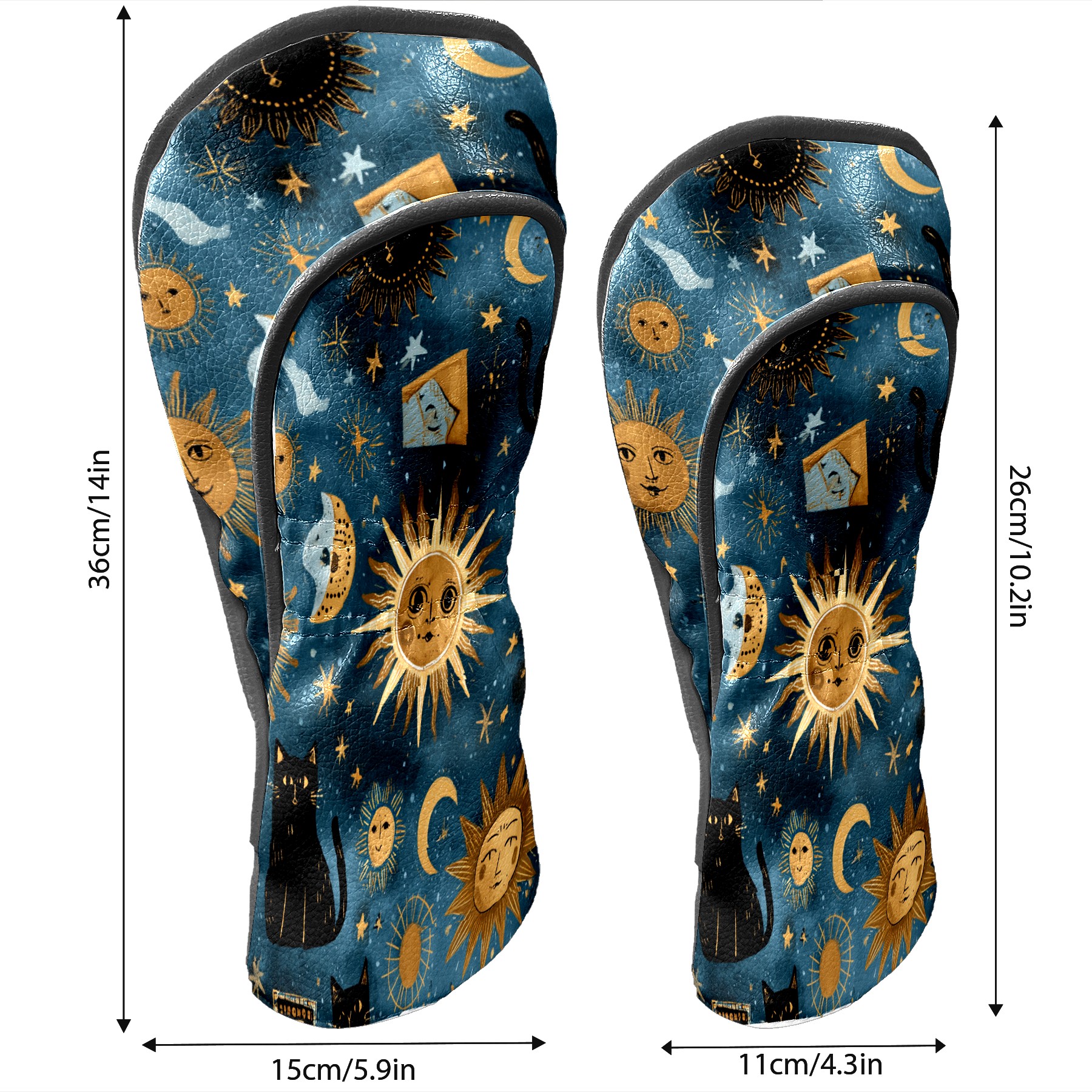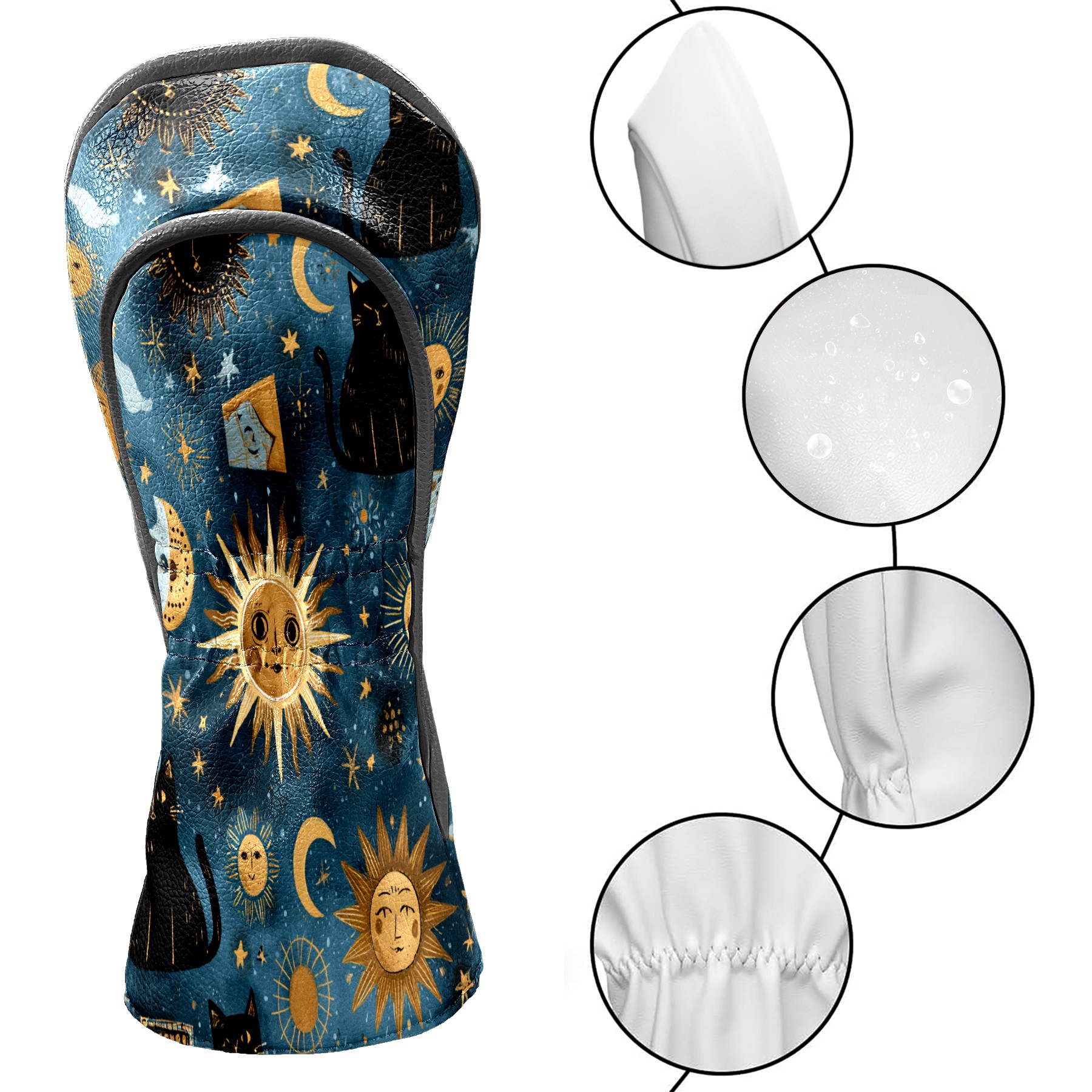 Golf Club Head Covers Dark Blue Sun Moon Black Cats Design for Driver & Hybrid, Waterproof PU Leather with Plush Velvet Lining, Scratch Protection & Secure Fit, Ideal Golf Gift for Men Women