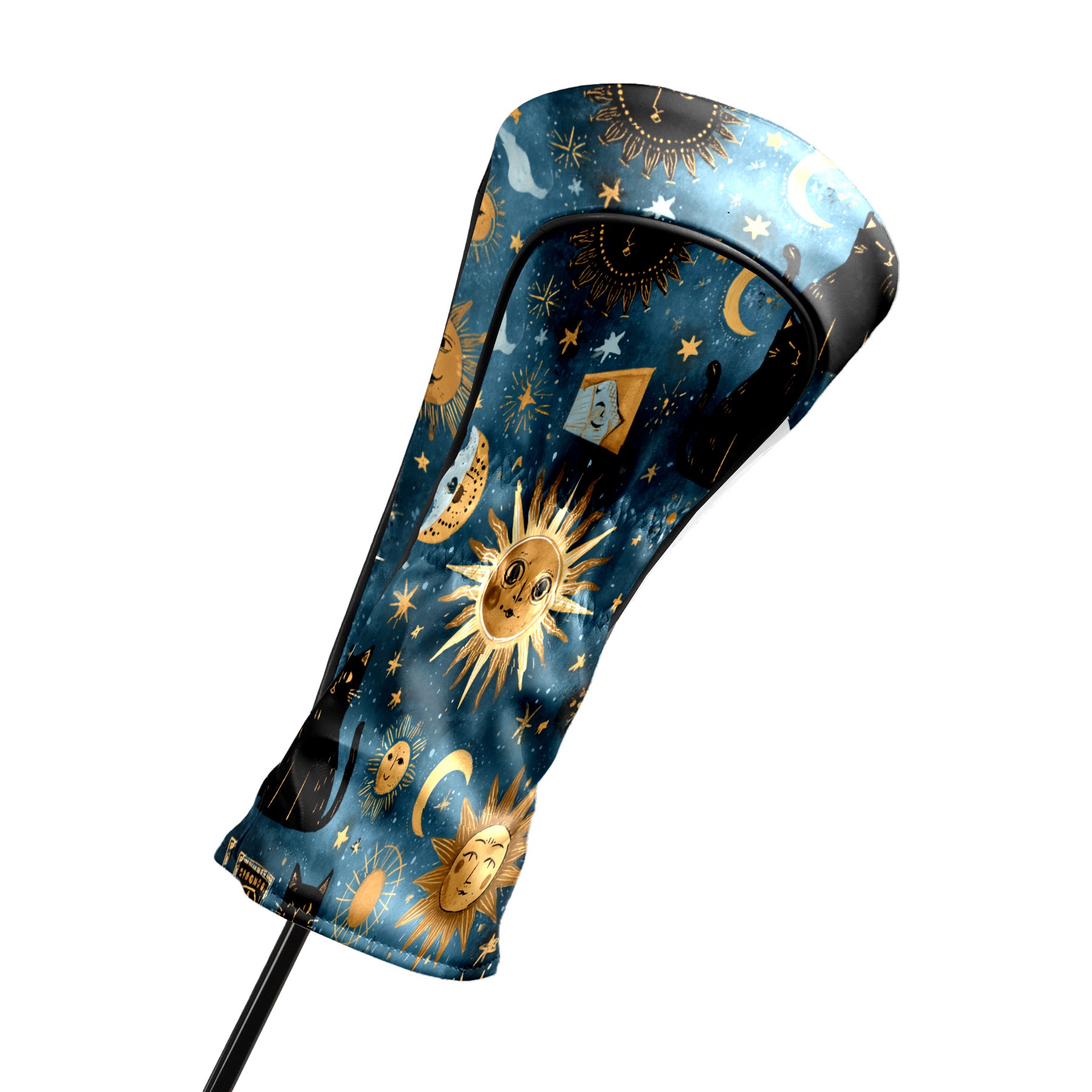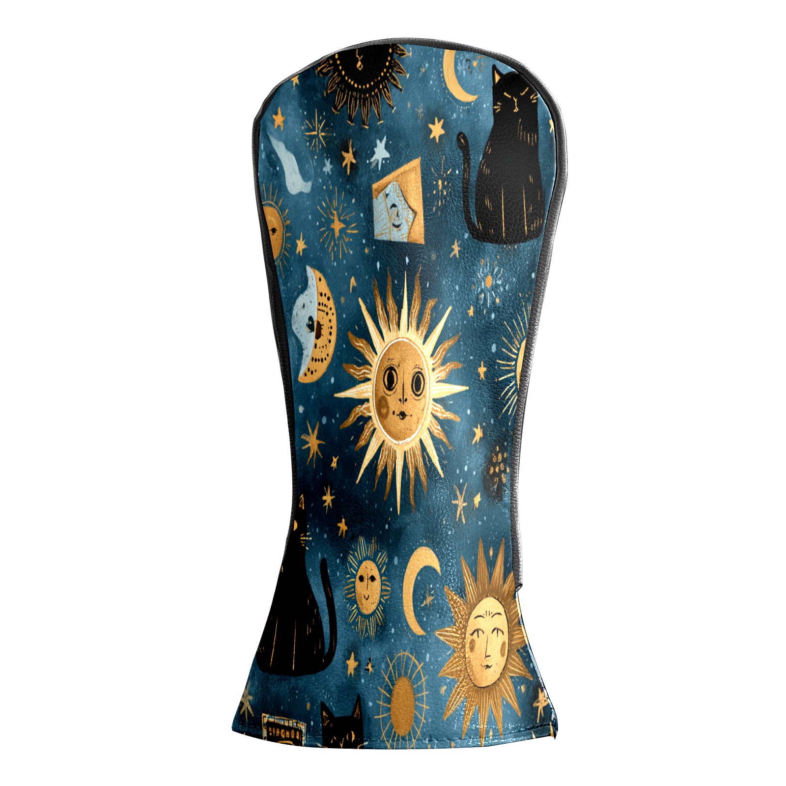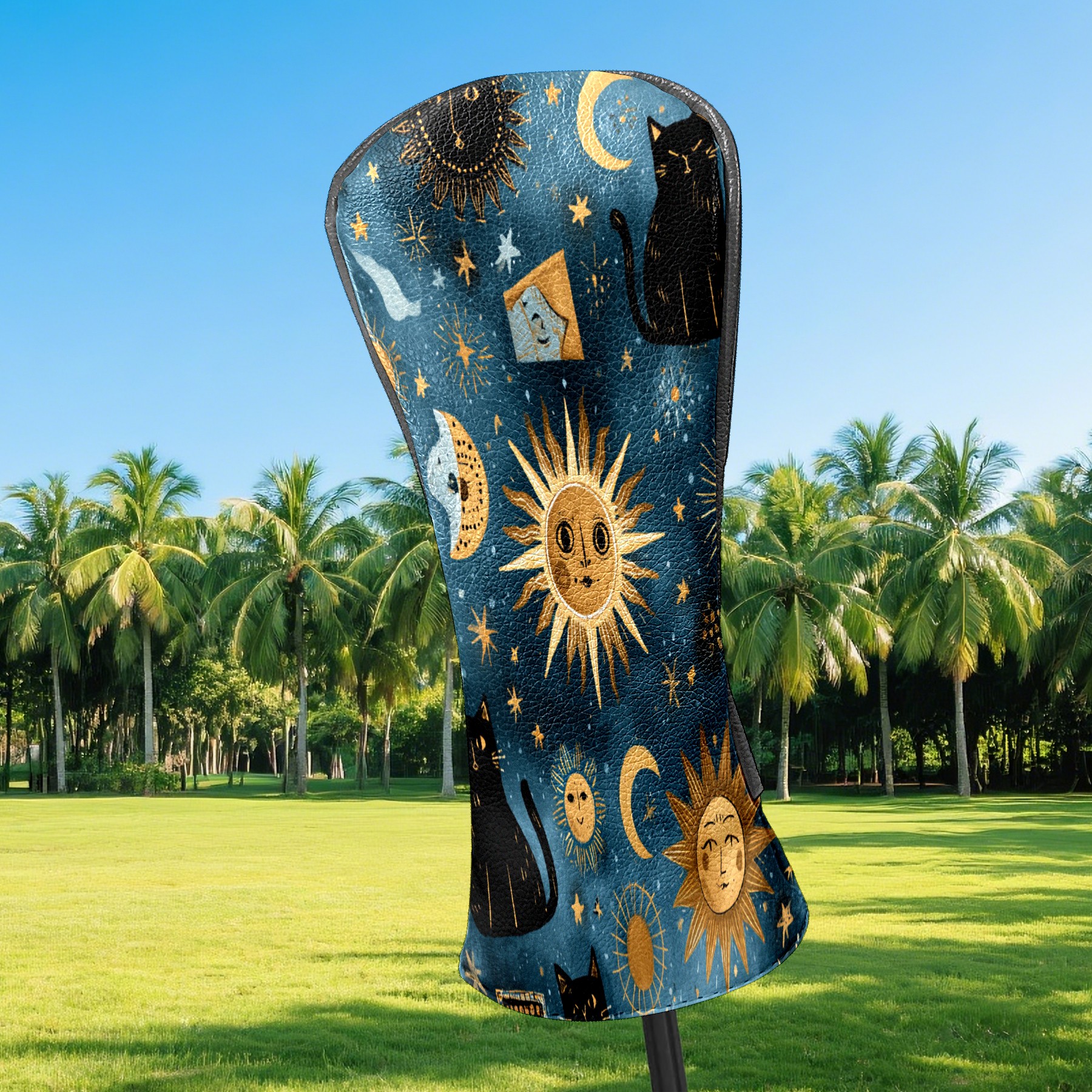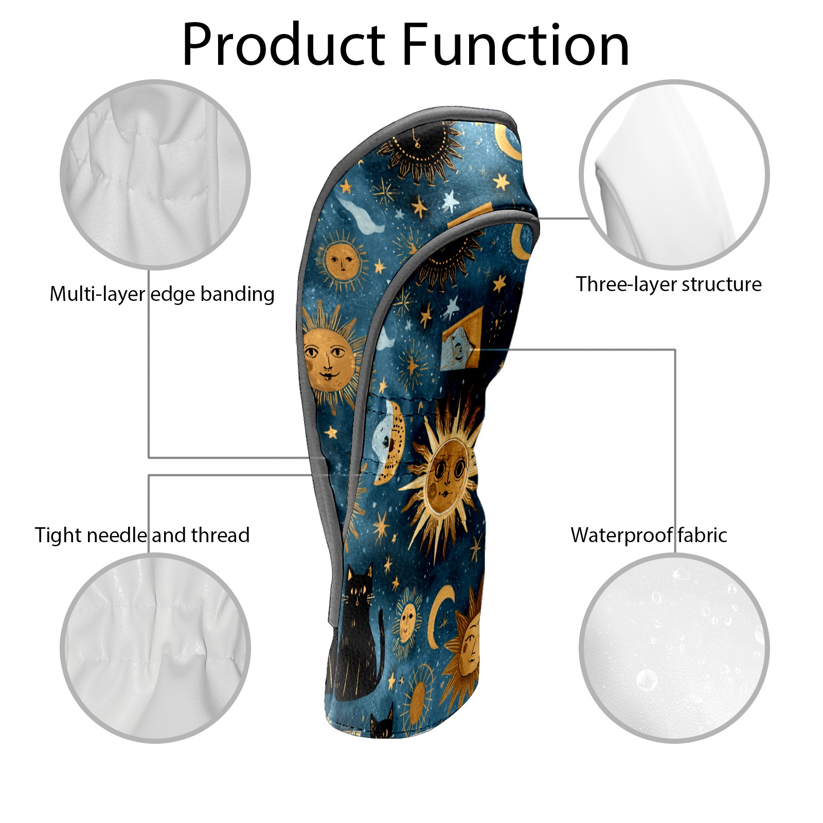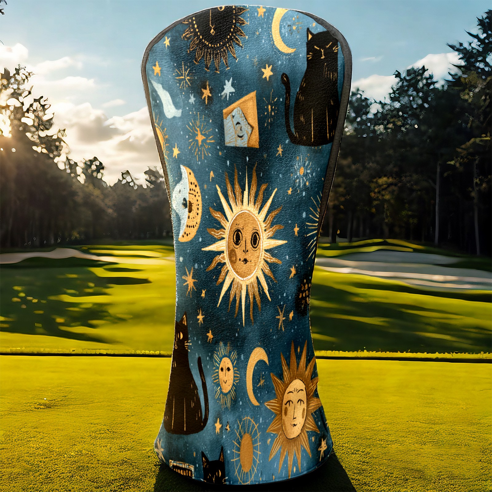 Golf Club Head Covers Dark Blue Sun Moon Black Cats Design for Driver & Hybrid, Waterproof PU Leather with Plush Velvet Lining, Scratch Protection & Secure Fit, Ideal Golf Gift for Men Women