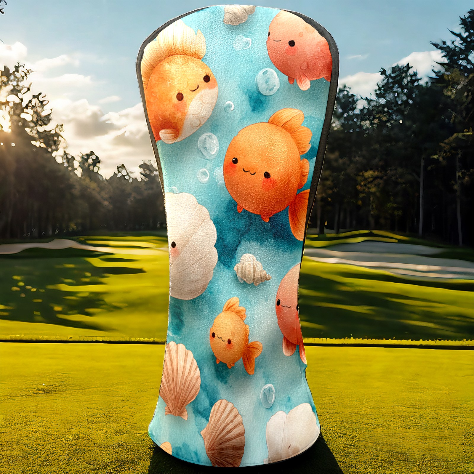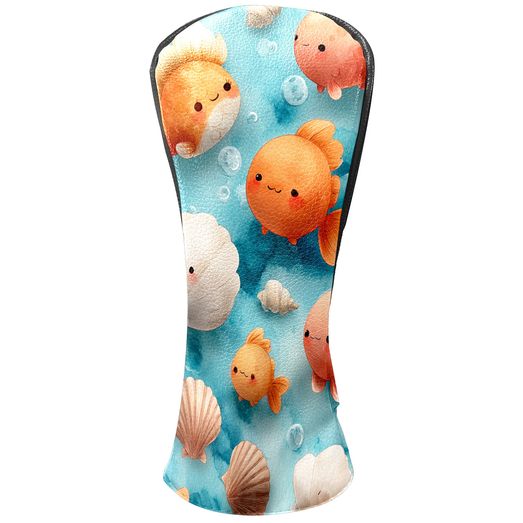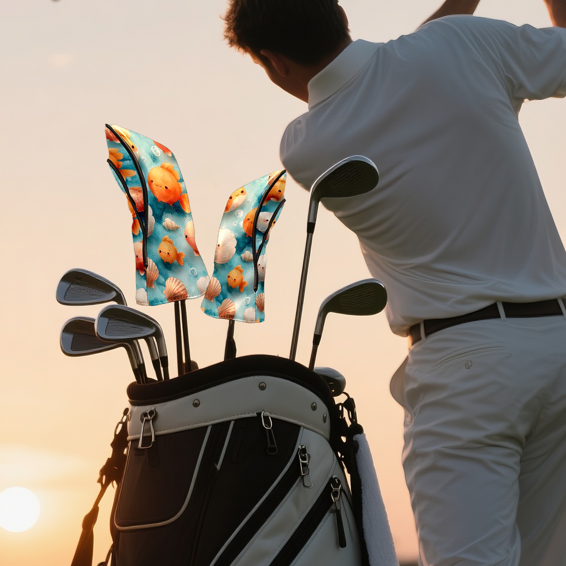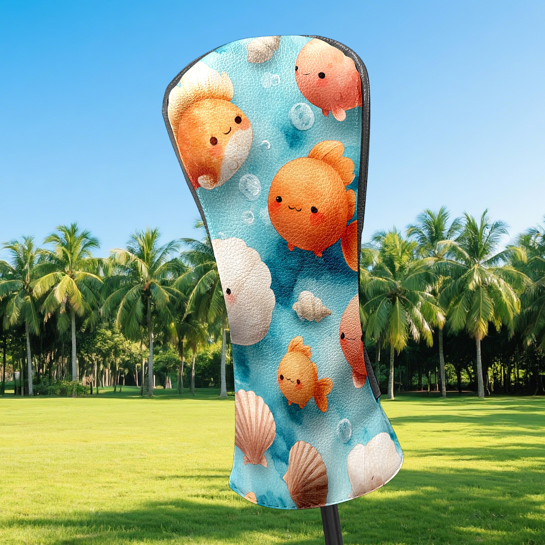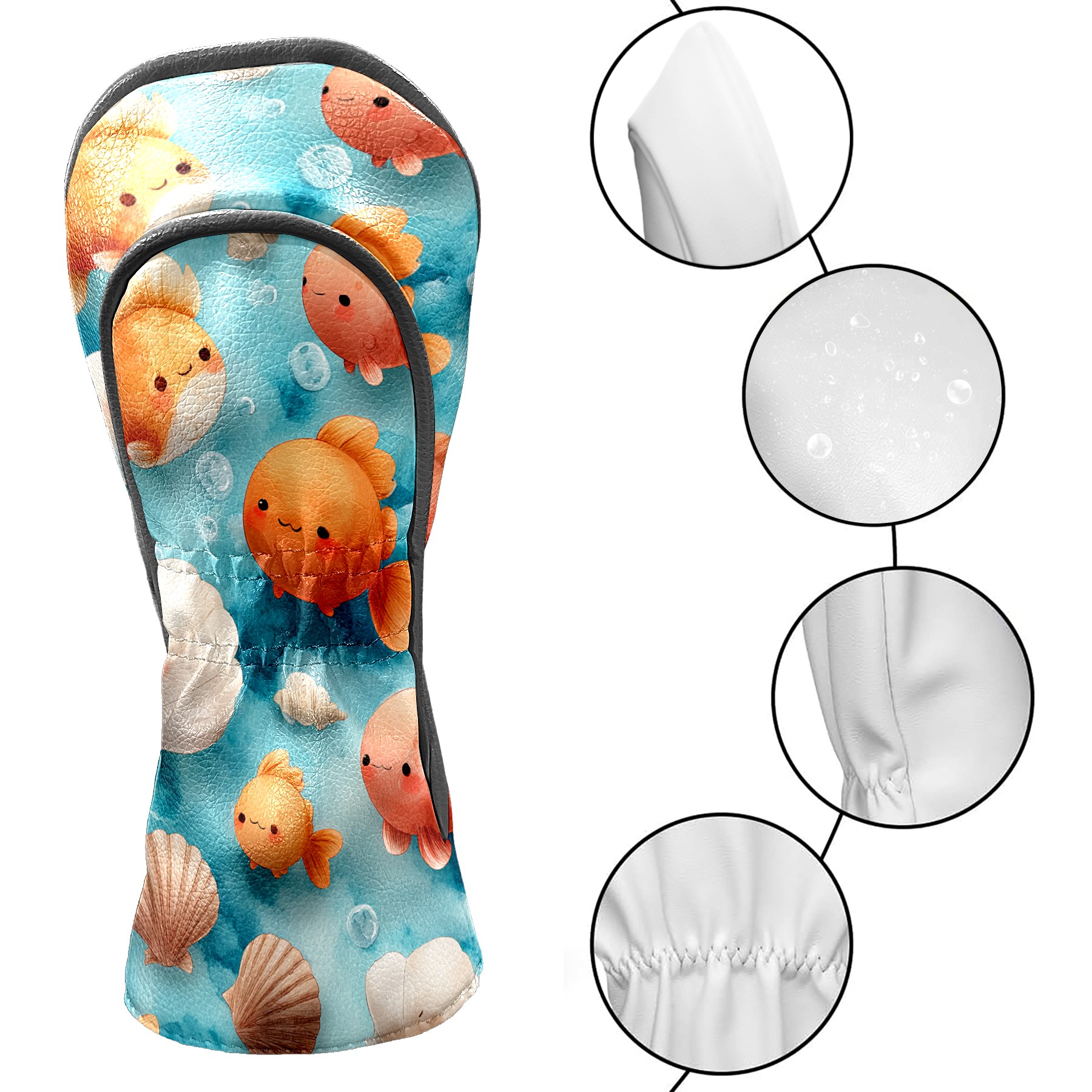 Golf Club Head Covers Blue Background Goldfish Shells Design for Driver & Hybrid, Waterproof PU Leather with Plush Velvet Lining, Scratch Protection & Secure Fit, Ideal Golf Gift for Men Women