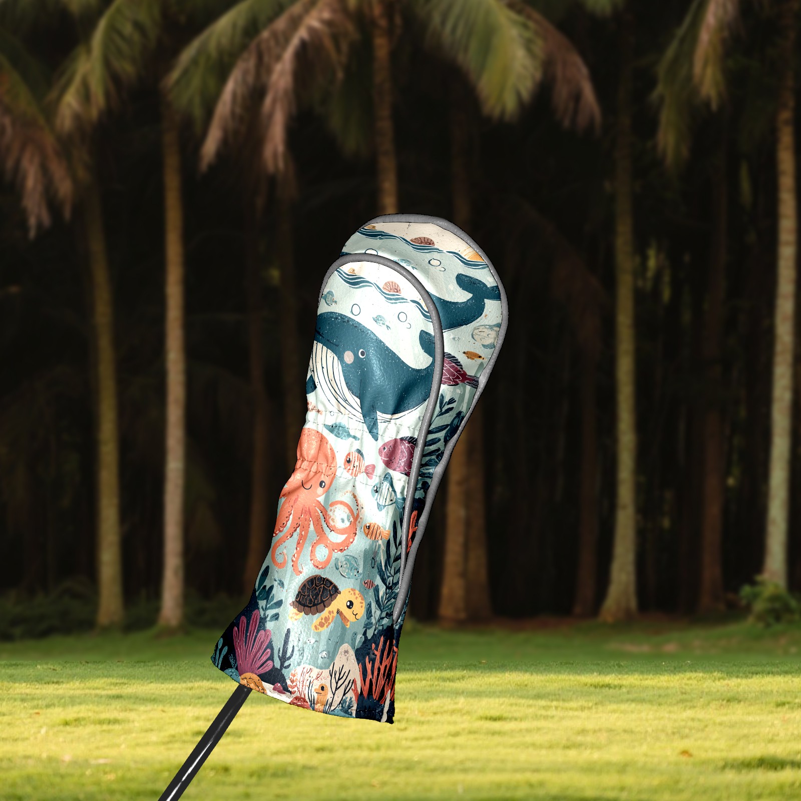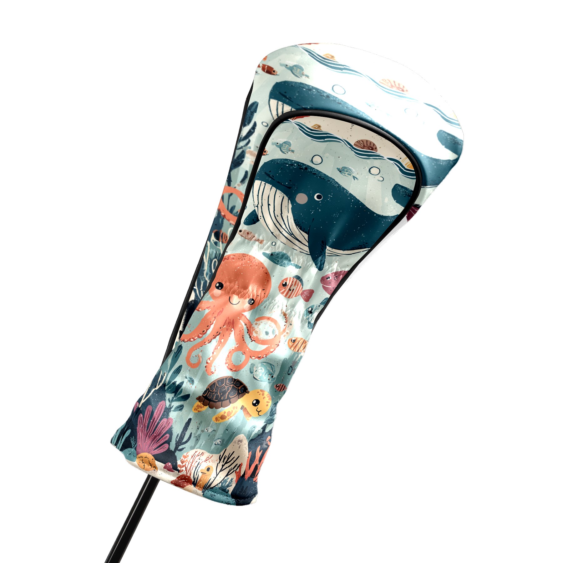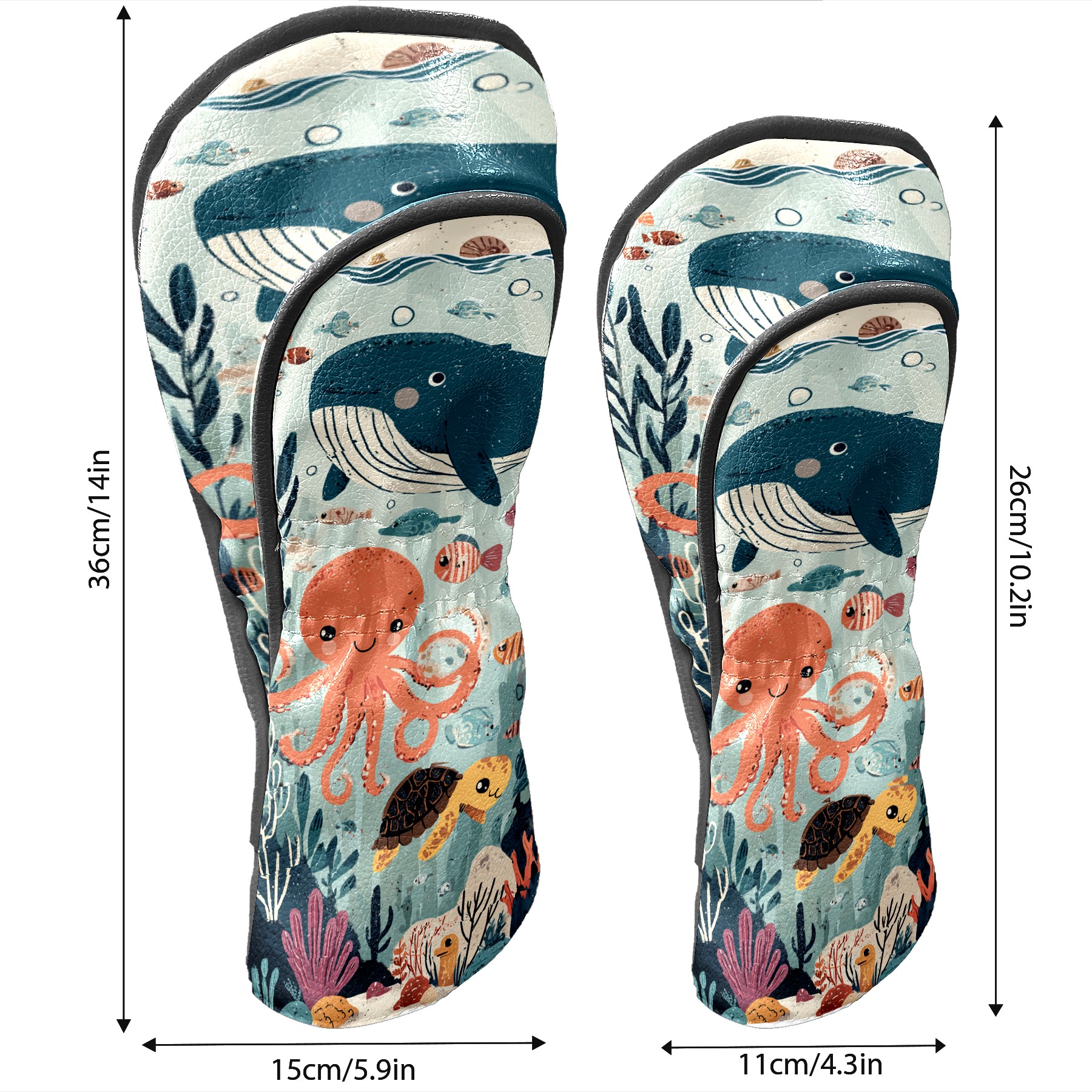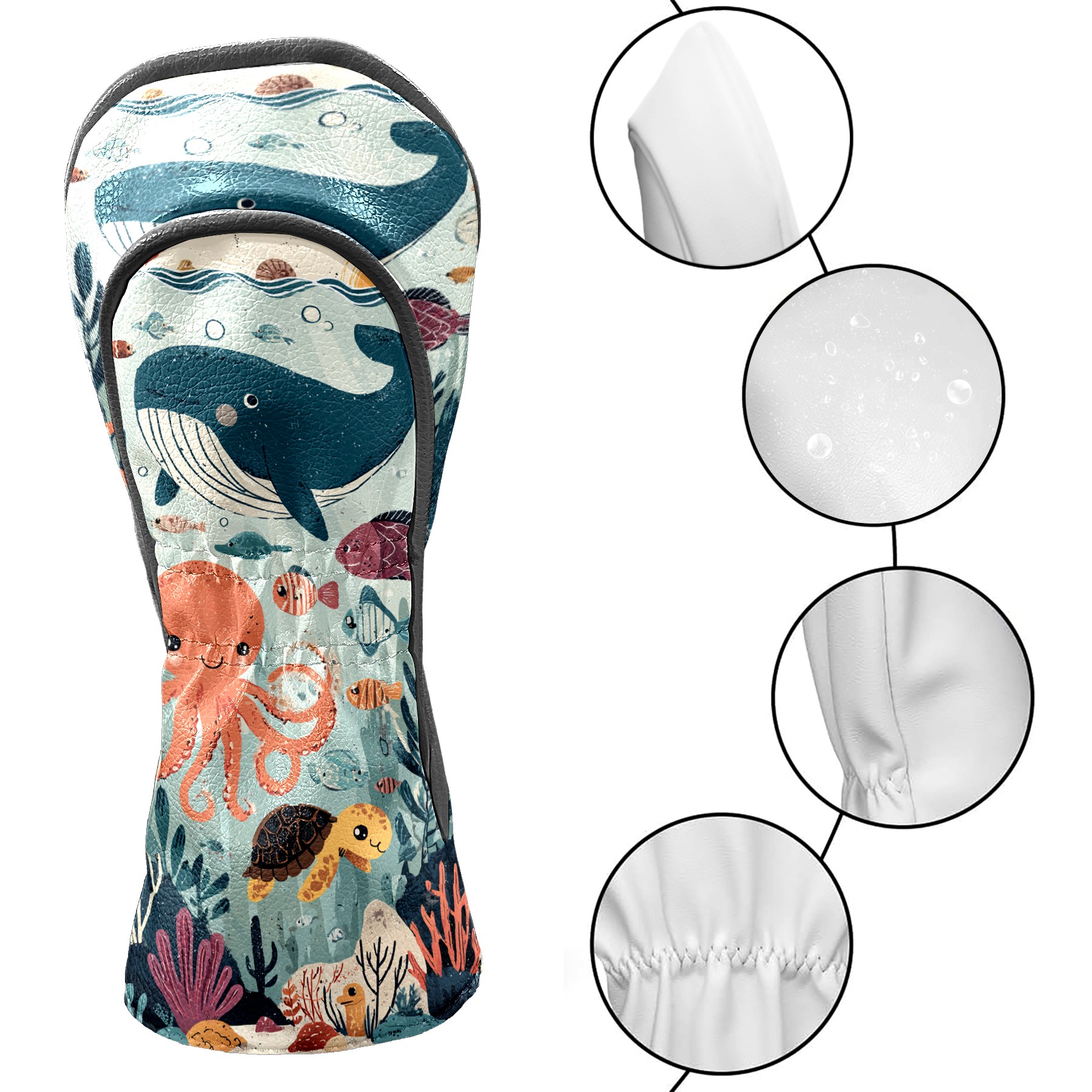 Golf Club Head Covers Blue Ocean Whale Octopus Design for Driver & Hybrid, Waterproof PU Leather with Plush Velvet Lining, Scratch Protection & Secure Fit, Ideal Golf Gift for Men Women
