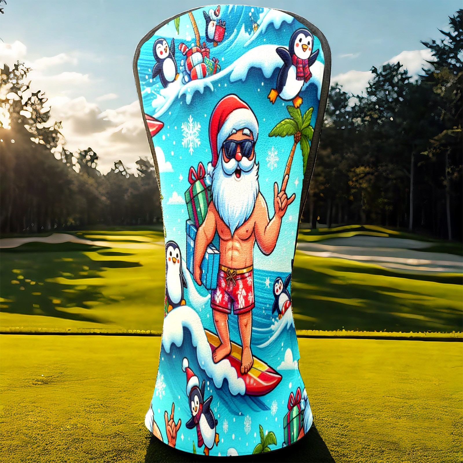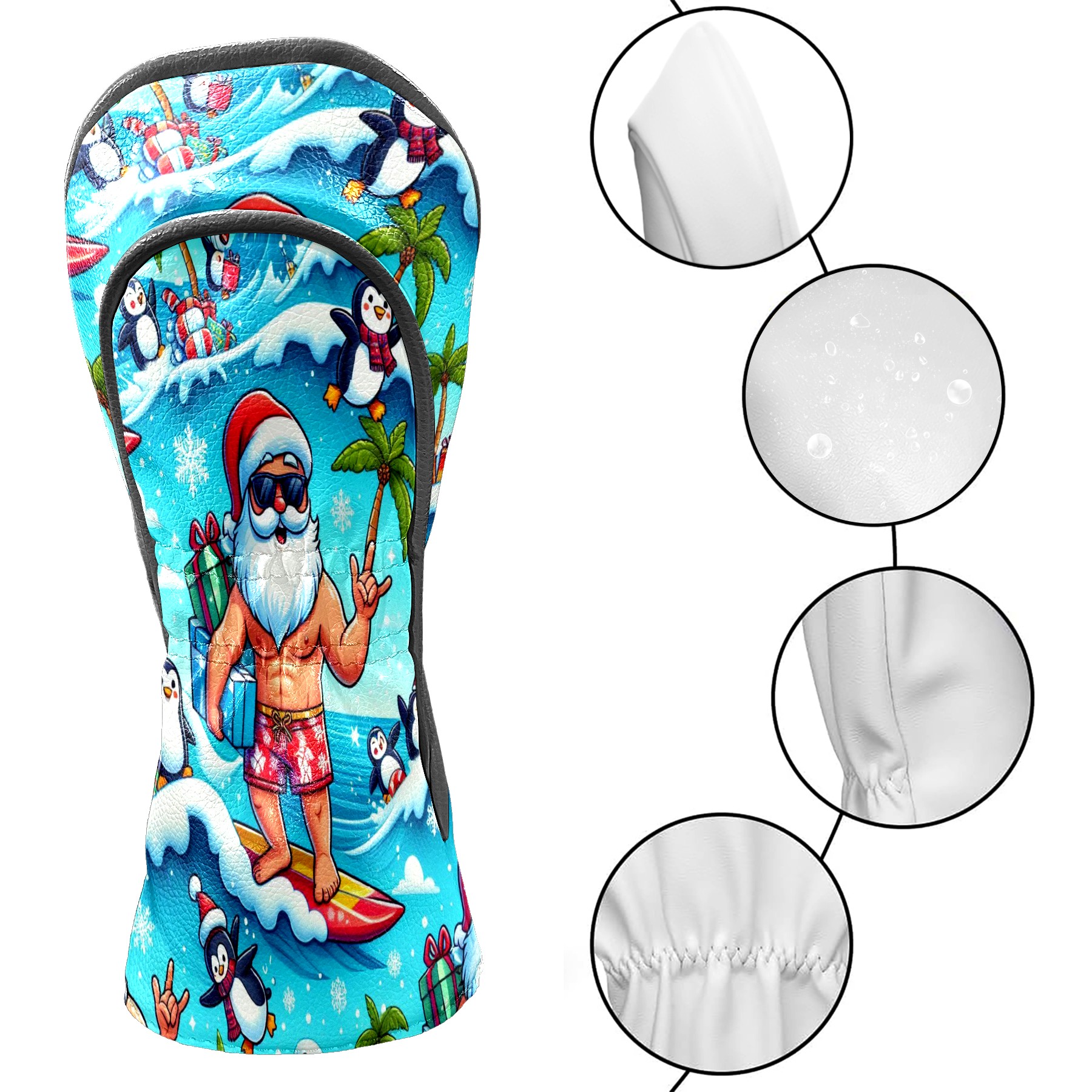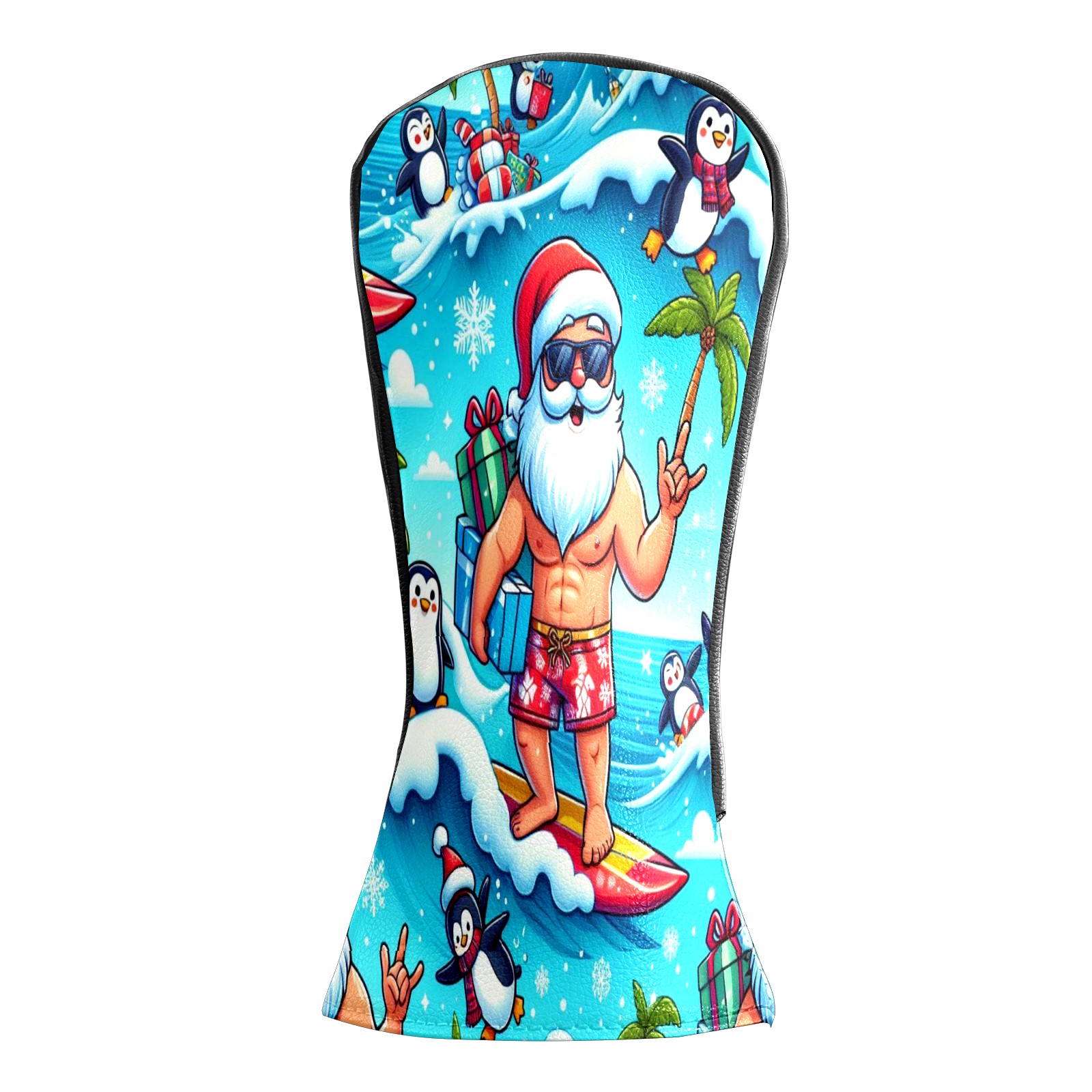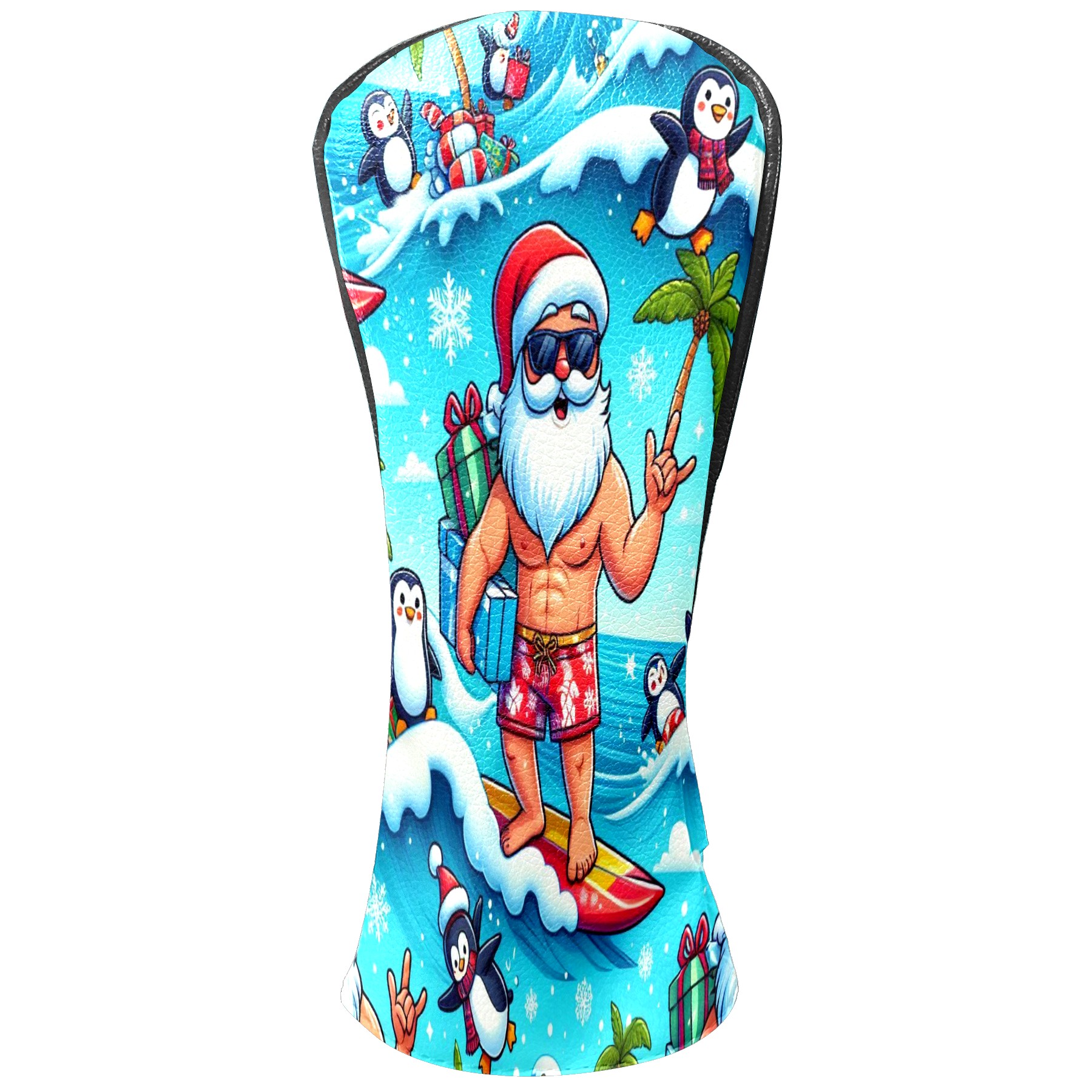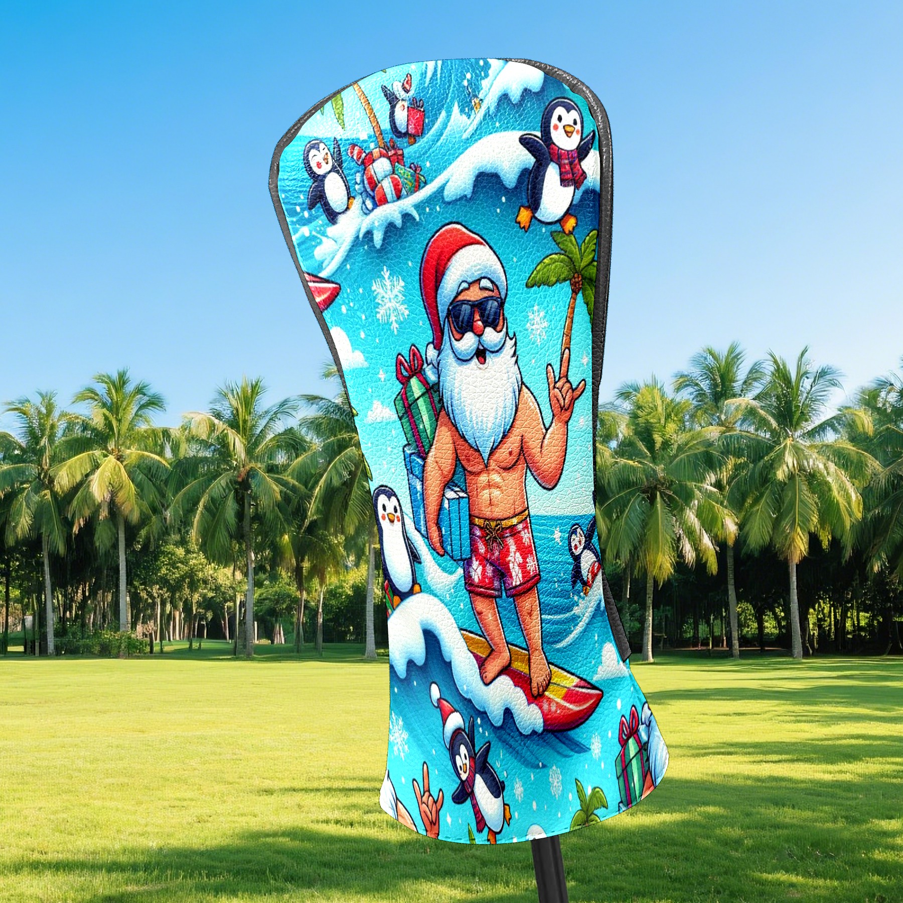 Golf Club Head Covers Santa & Penguins Surfing Ocean Design for Driver & Hybrid, Waterproof PU Leather with Plush Velvet Lining, Scratch Protection & Secure Fit, Ideal Golf Gift for Men Women