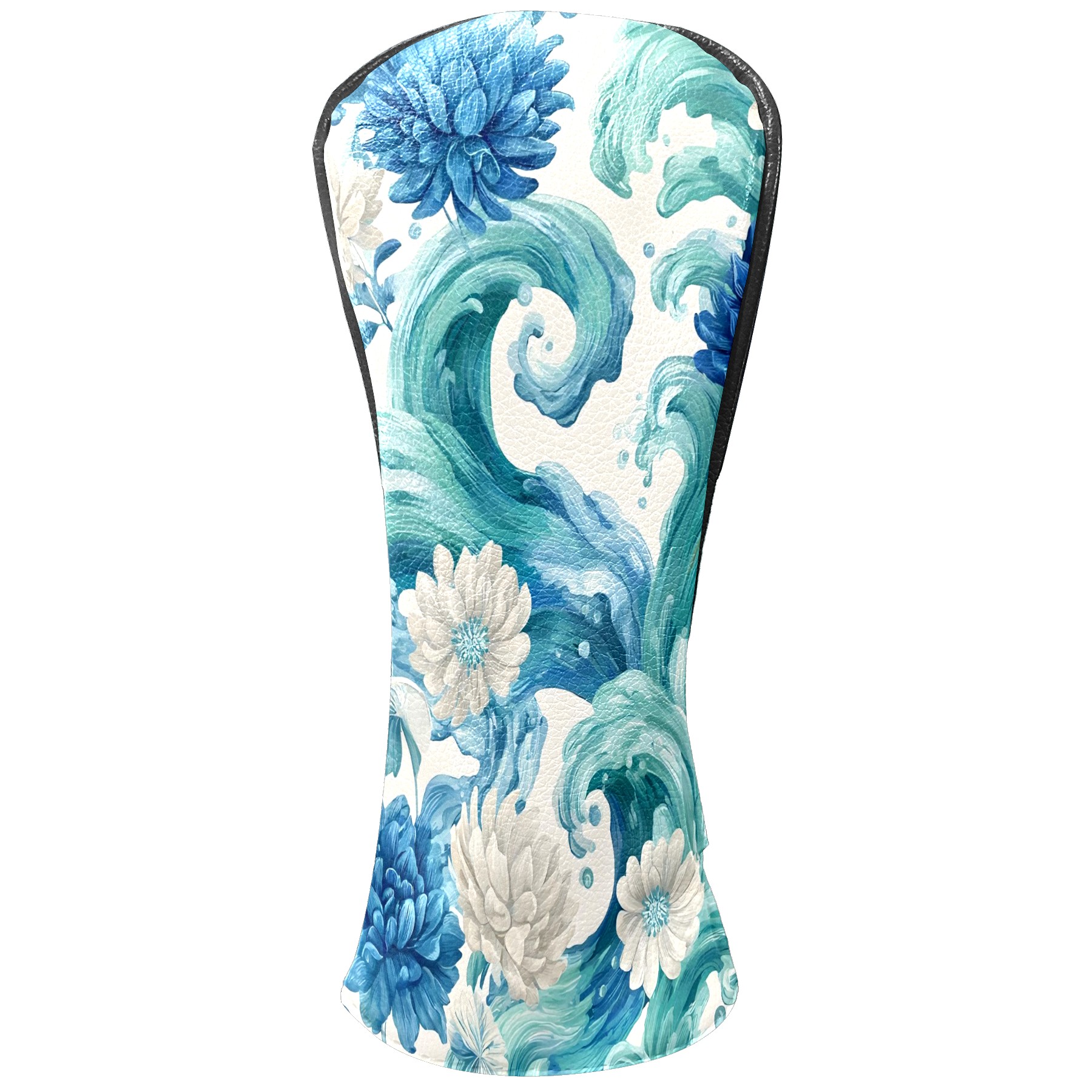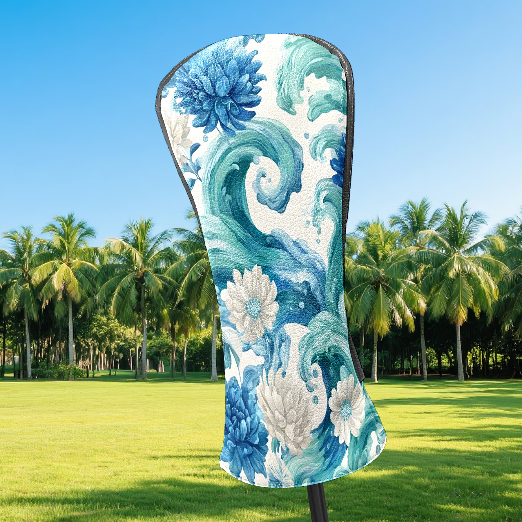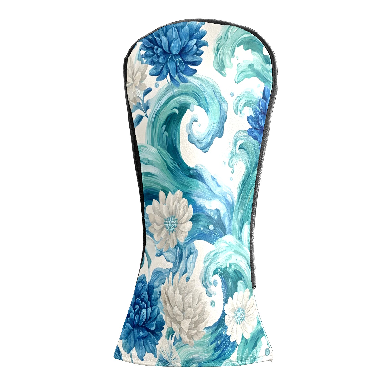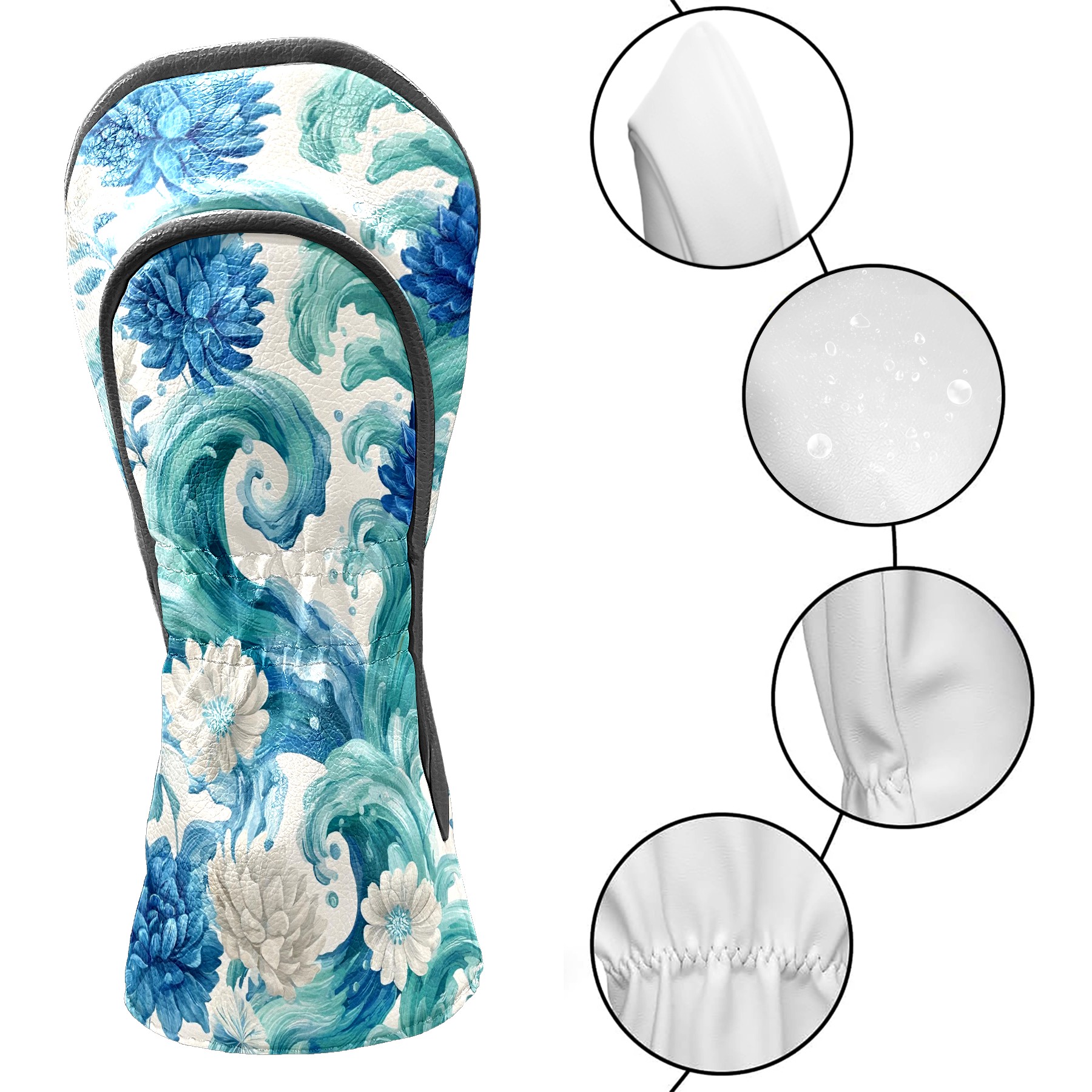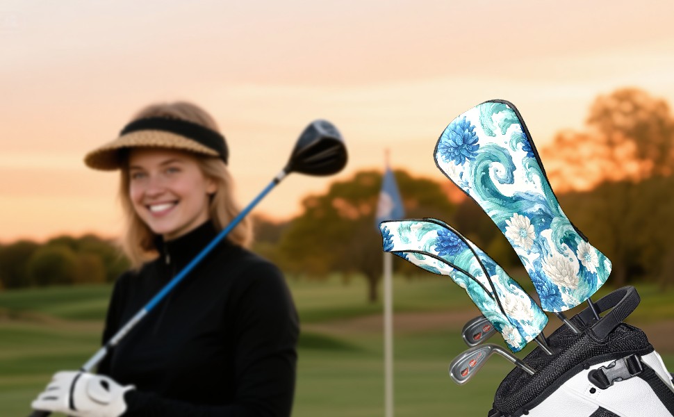 Golf Club Head Covers Blue White Waves & Flowers Design for Driver & Hybrid, Waterproof PU Leather with Plush Velvet Lining, Scratch Protection & Secure Fit, Ideal Golf Gift for Men Women