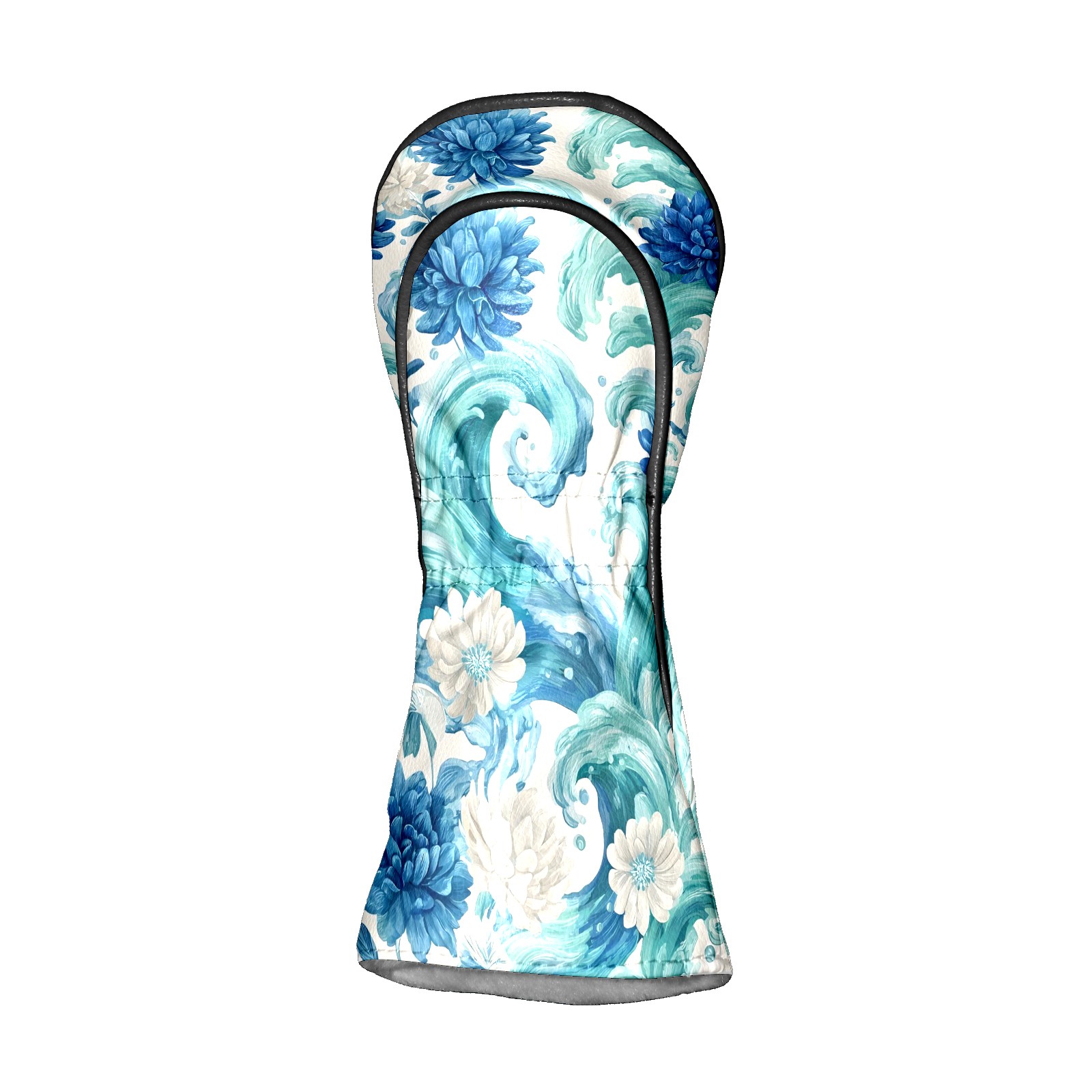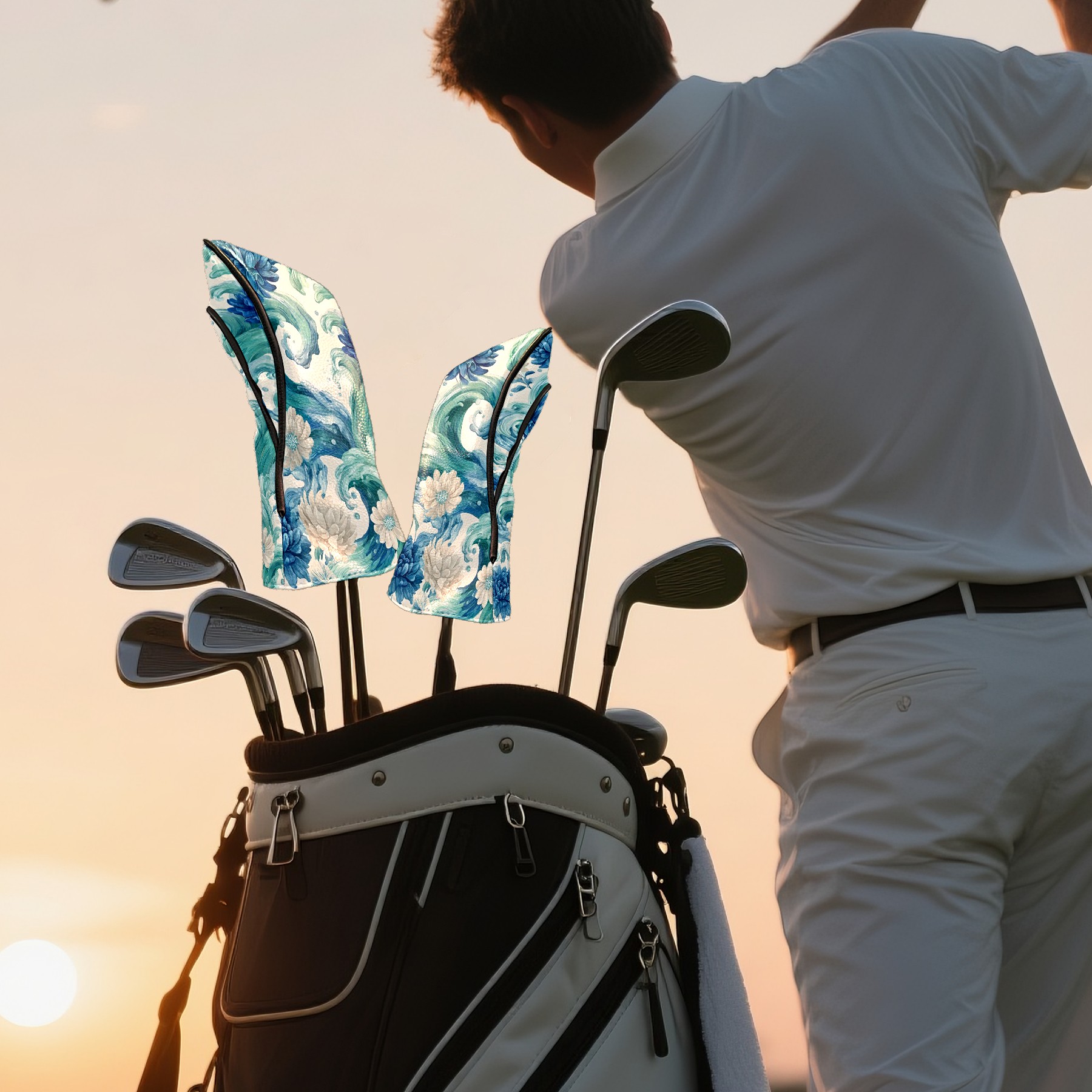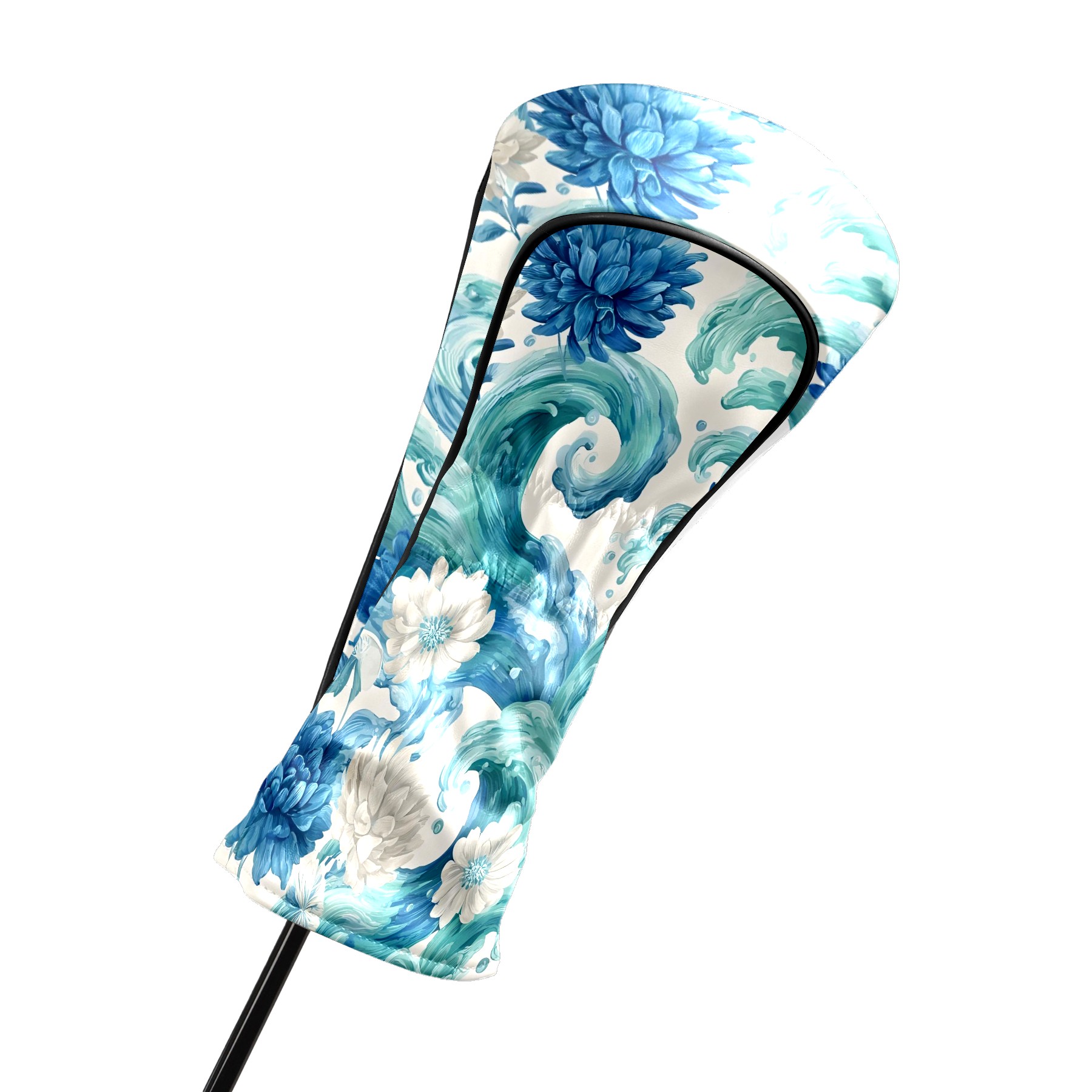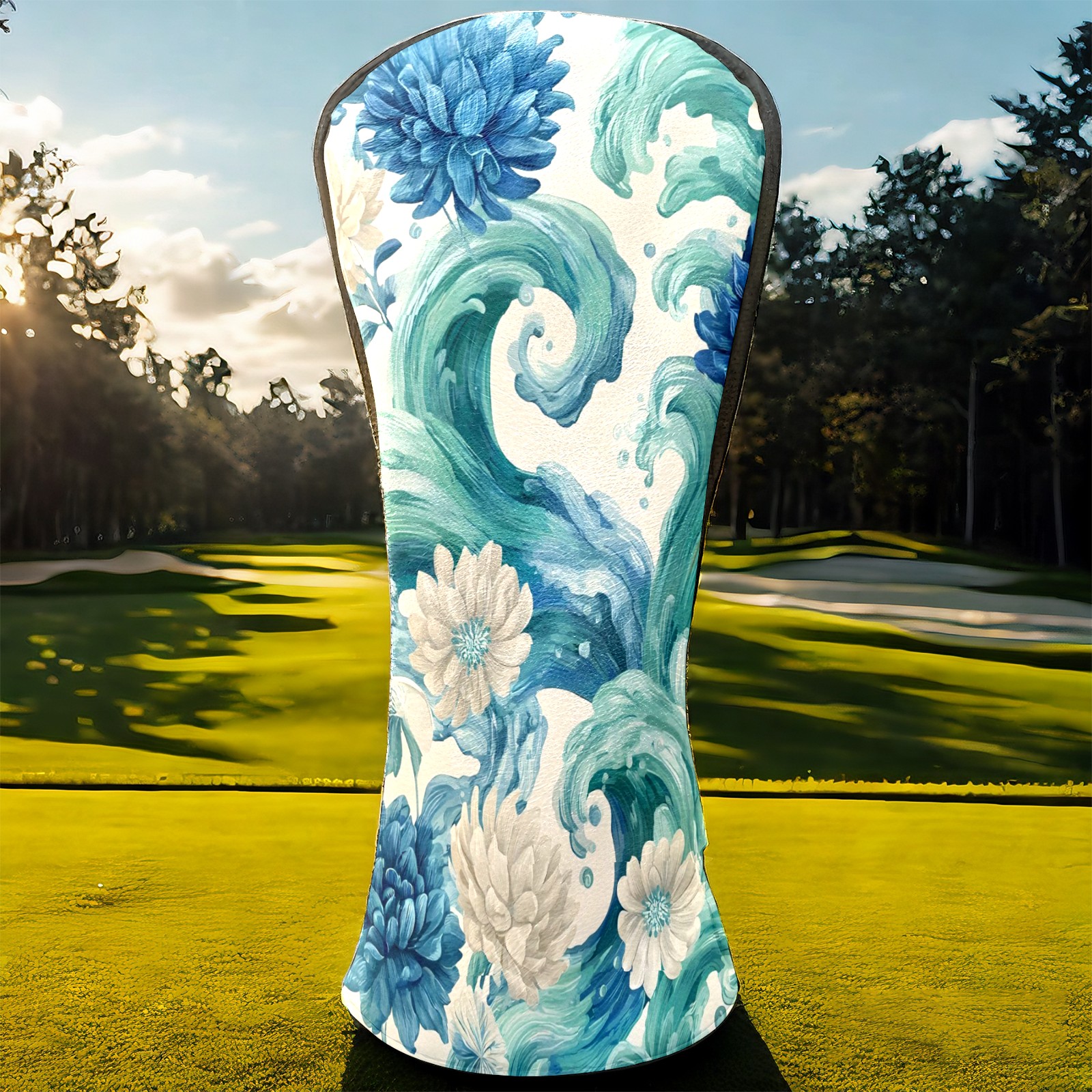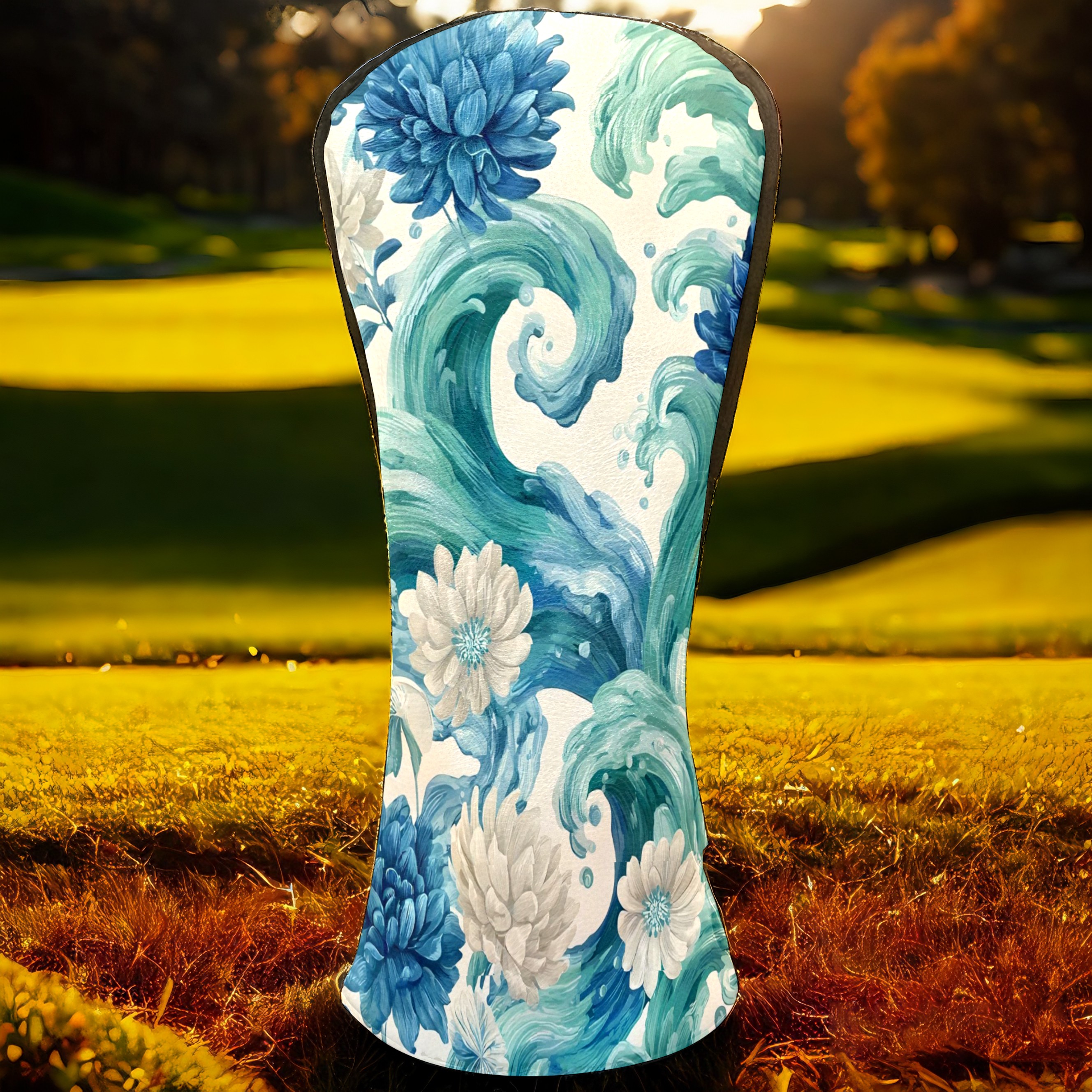 Golf Club Head Covers Blue White Waves & Flowers Design for Driver & Hybrid, Waterproof PU Leather with Plush Velvet Lining, Scratch Protection & Secure Fit, Ideal Golf Gift for Men Women