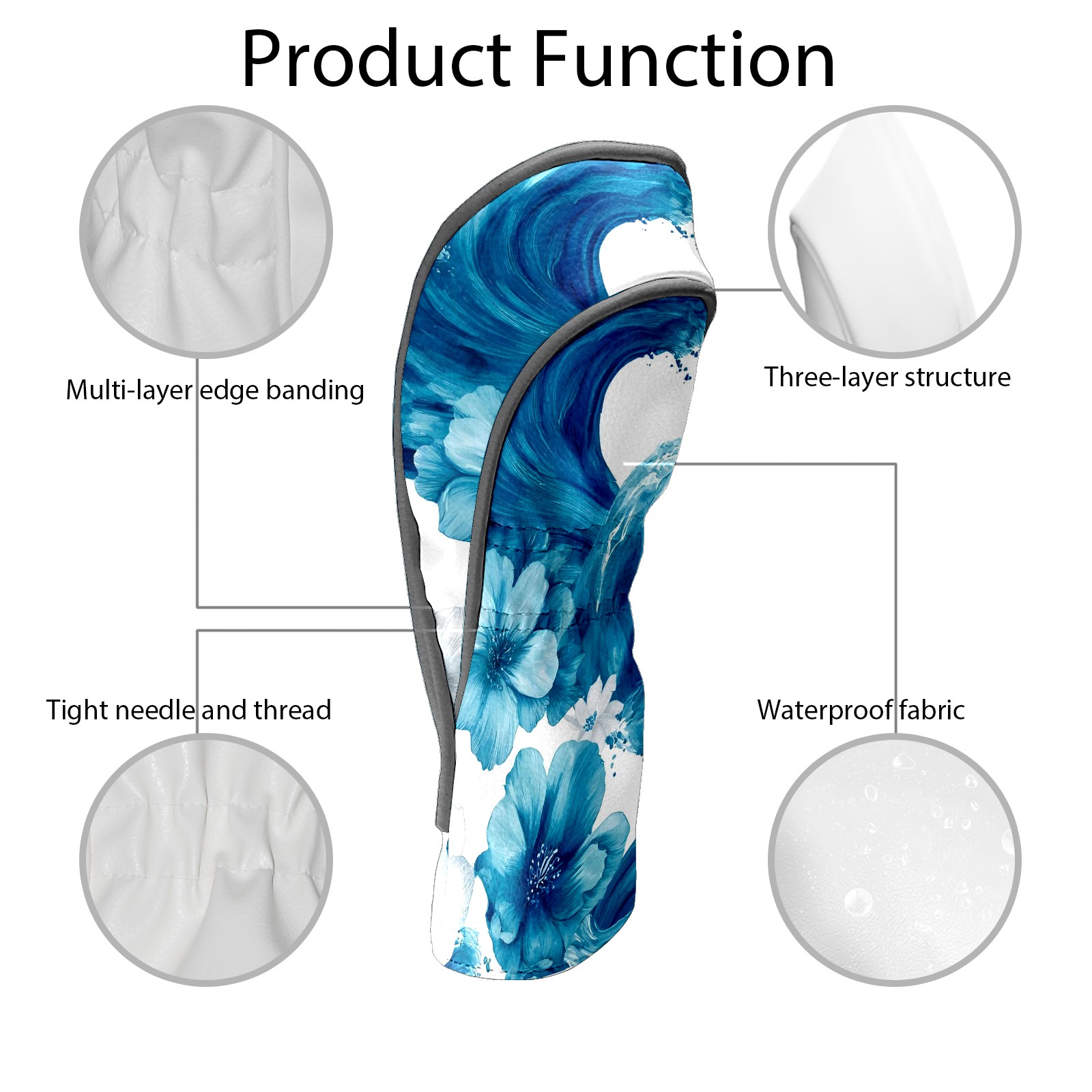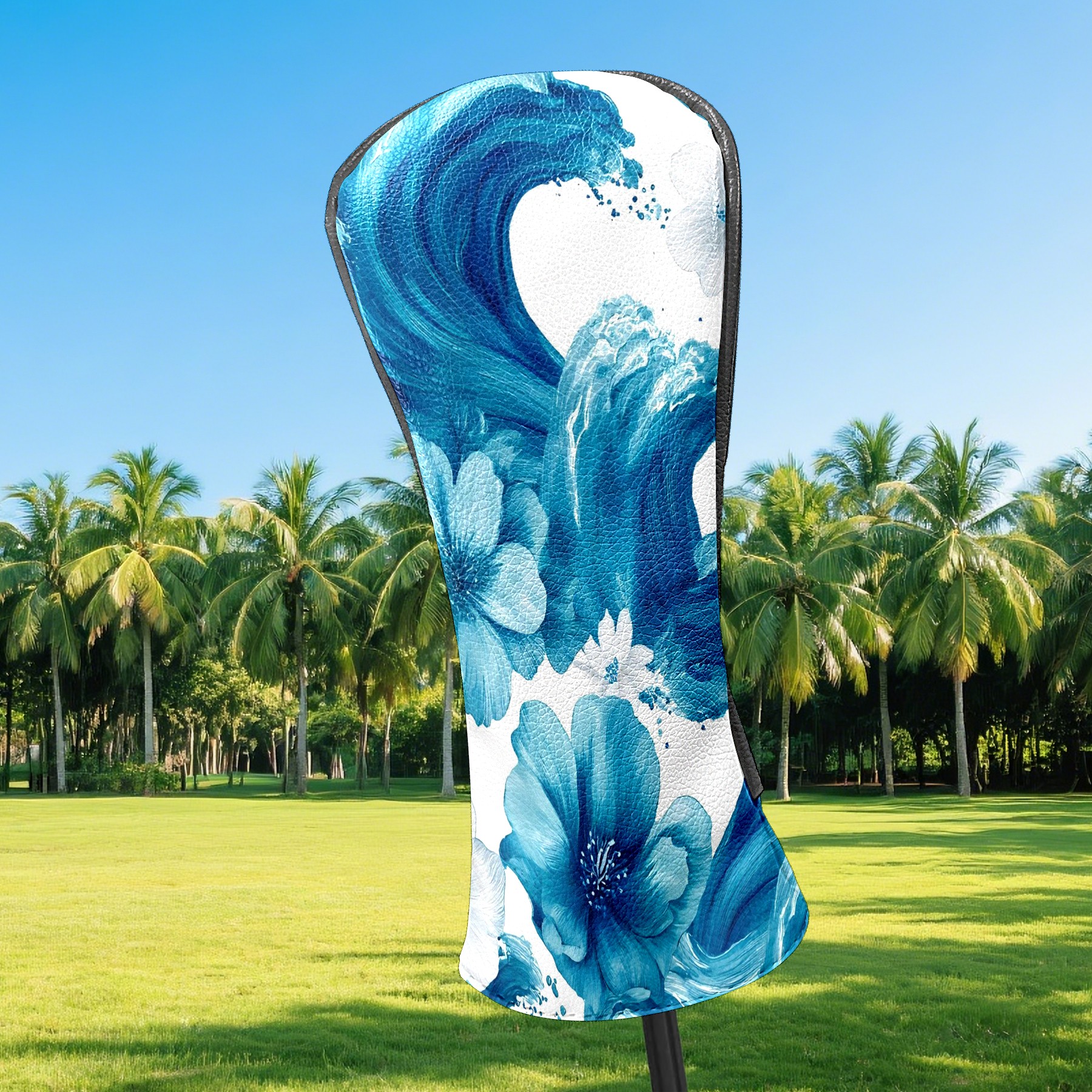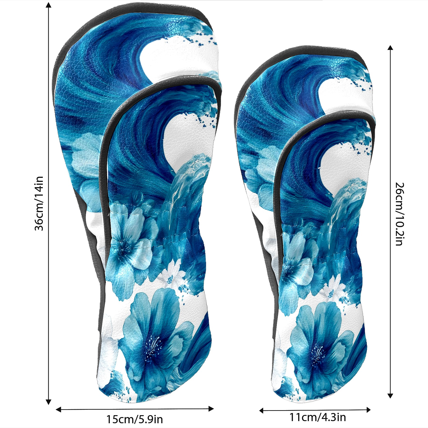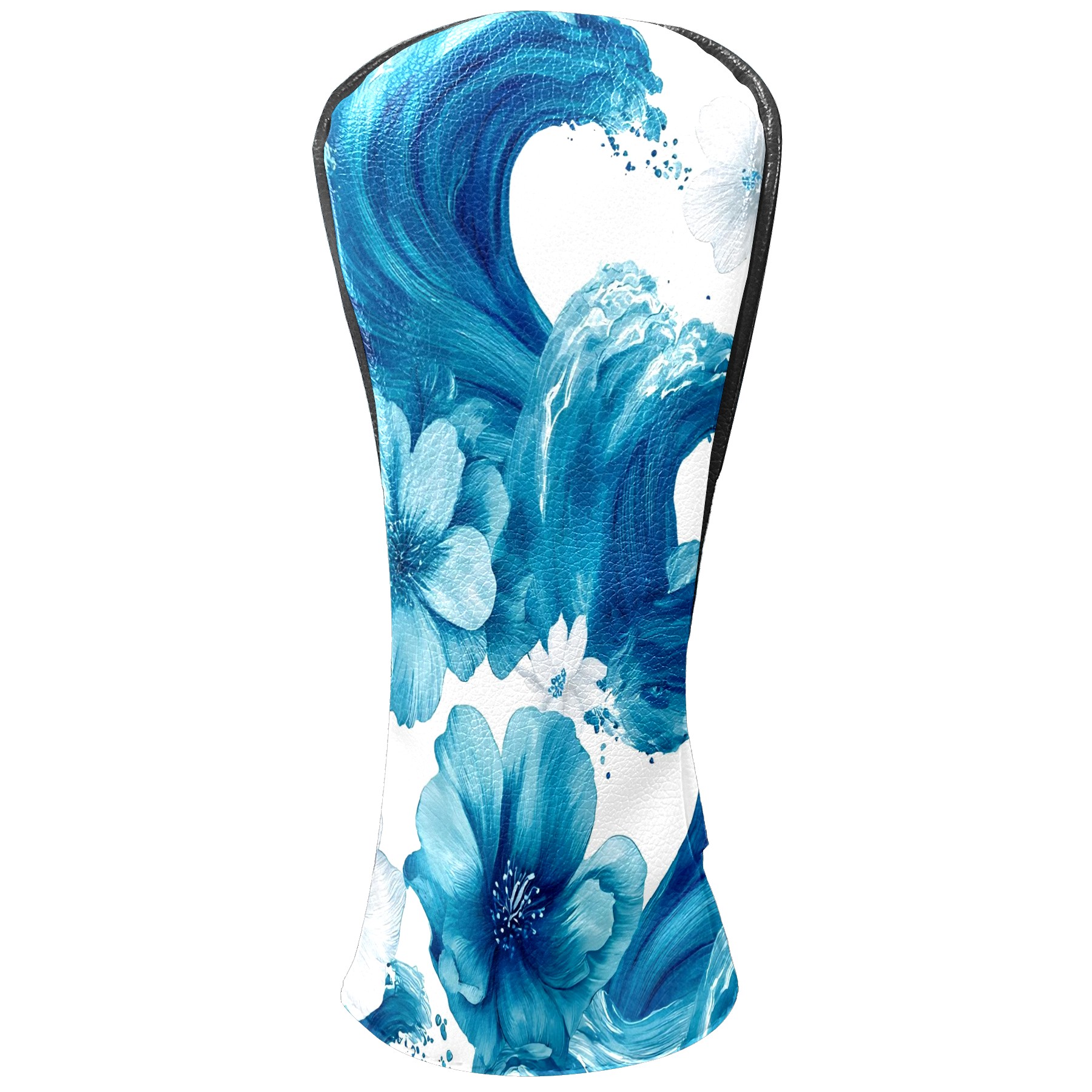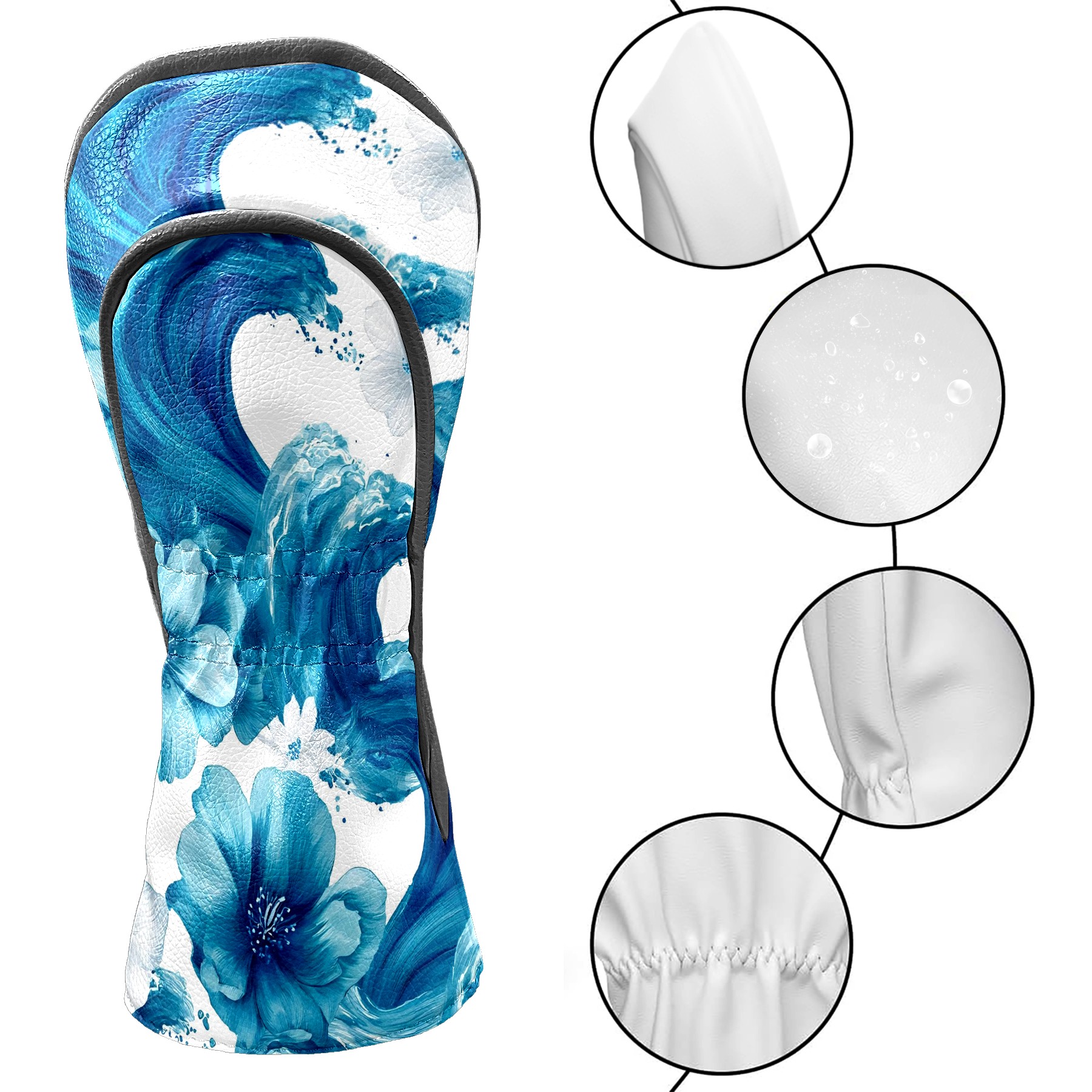 Golf Club Head Covers Blue White Dynamic Waves & Flowers Design for Driver & Hybrid, Waterproof PU Leather with Plush Velvet Lining, Scratch Protection & Secure Fit, Ideal Golf Gift for Men Women