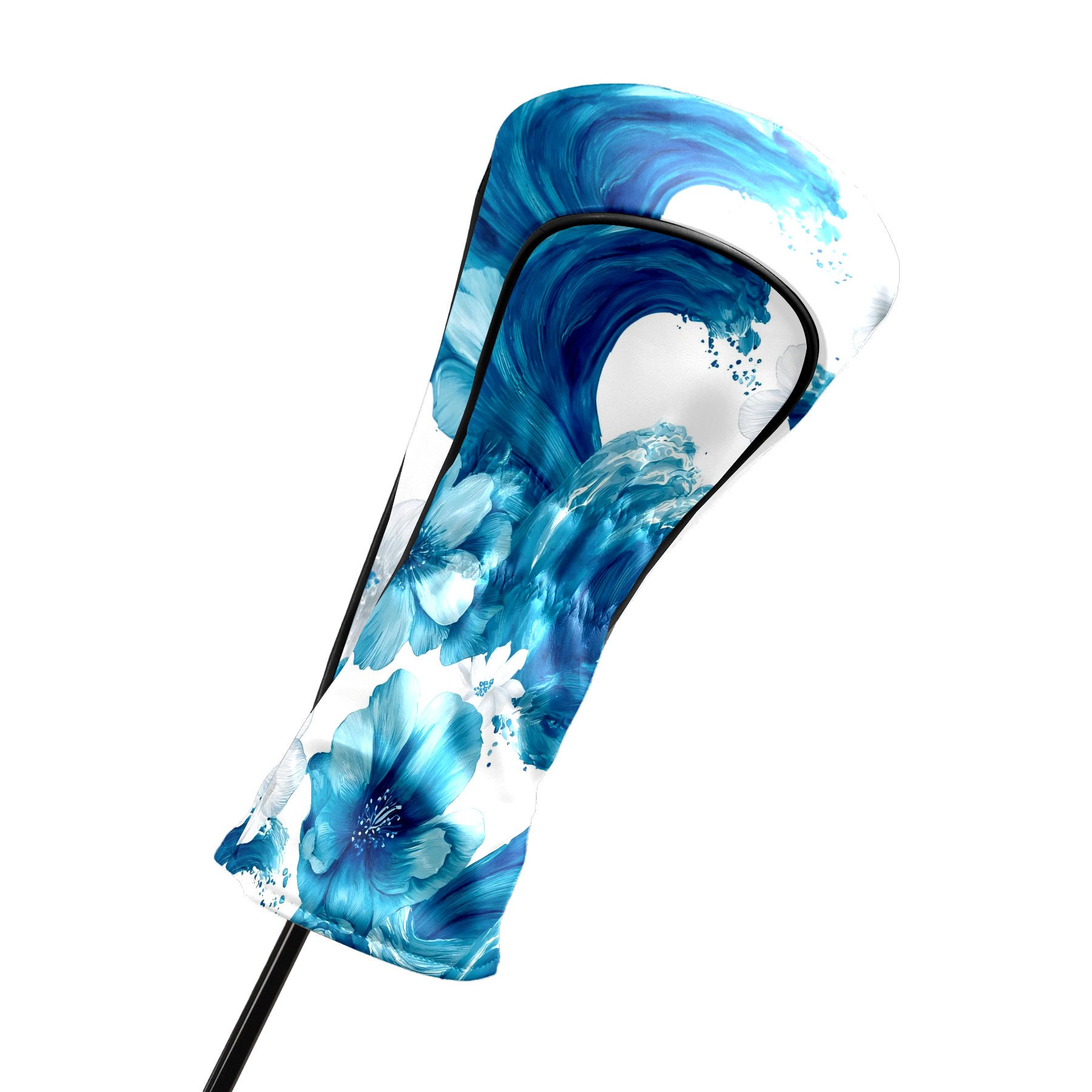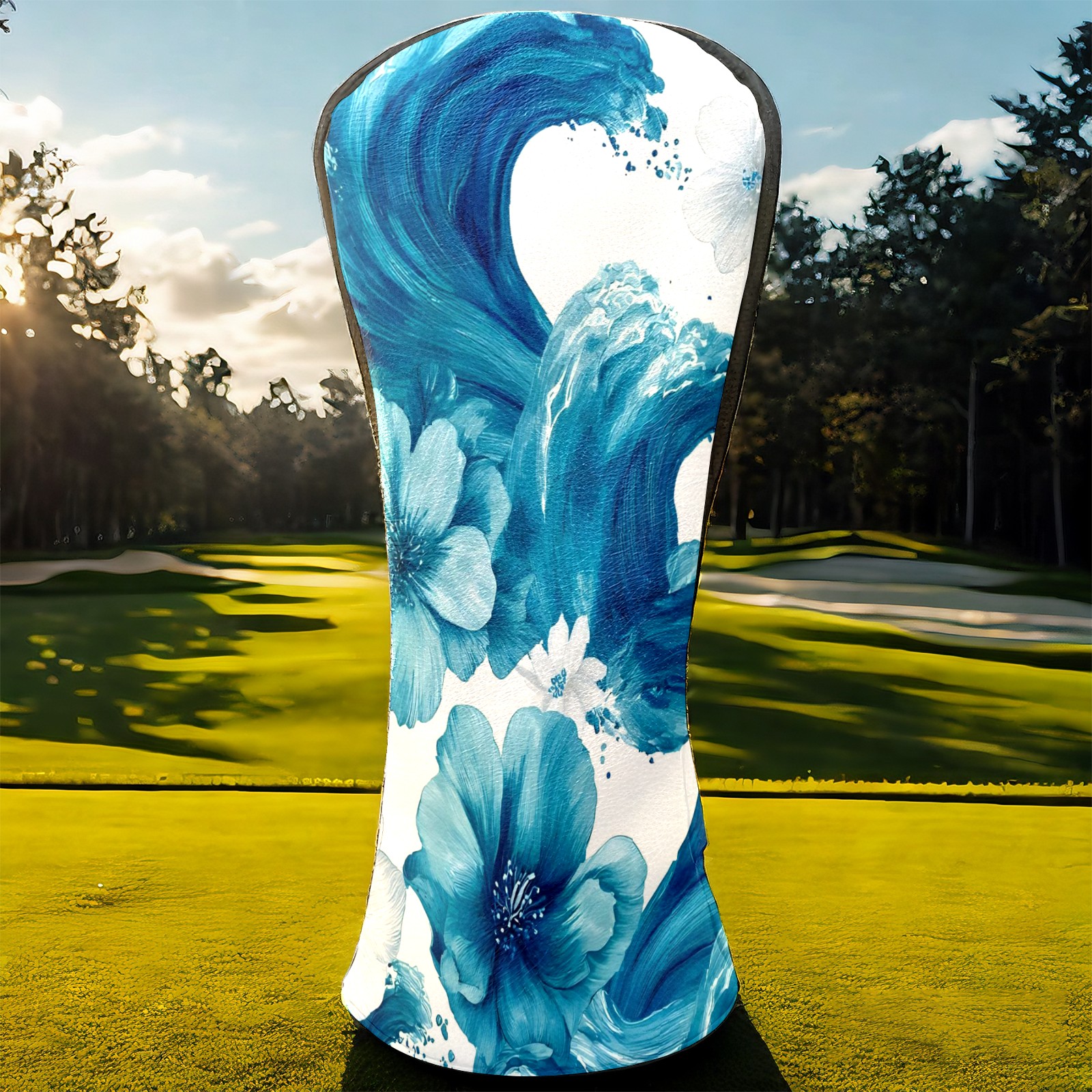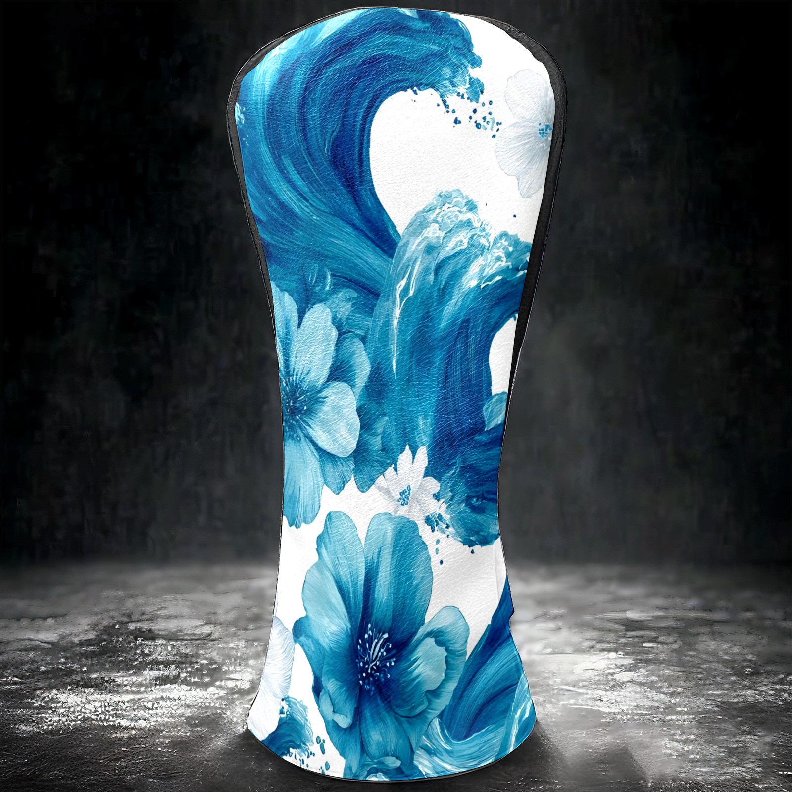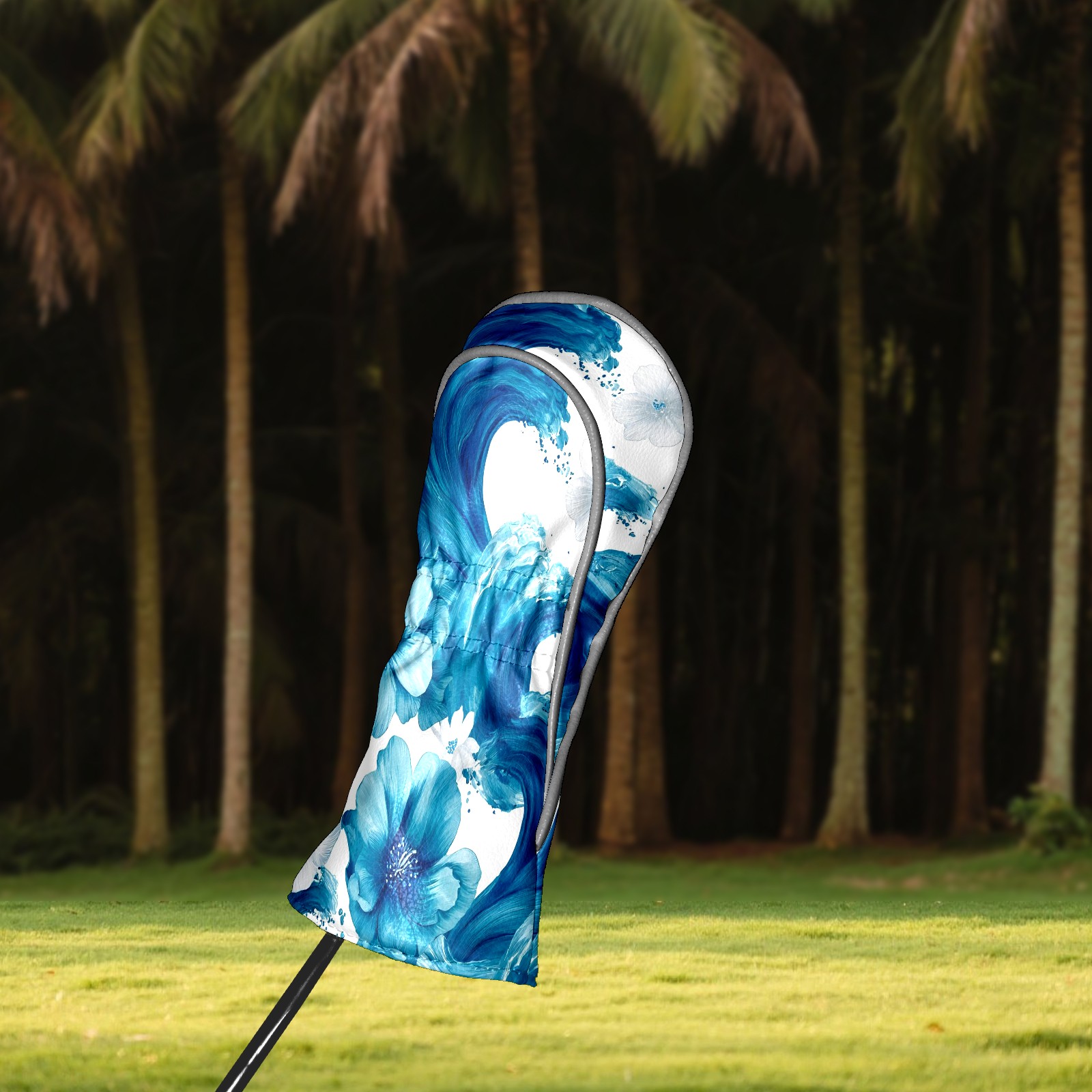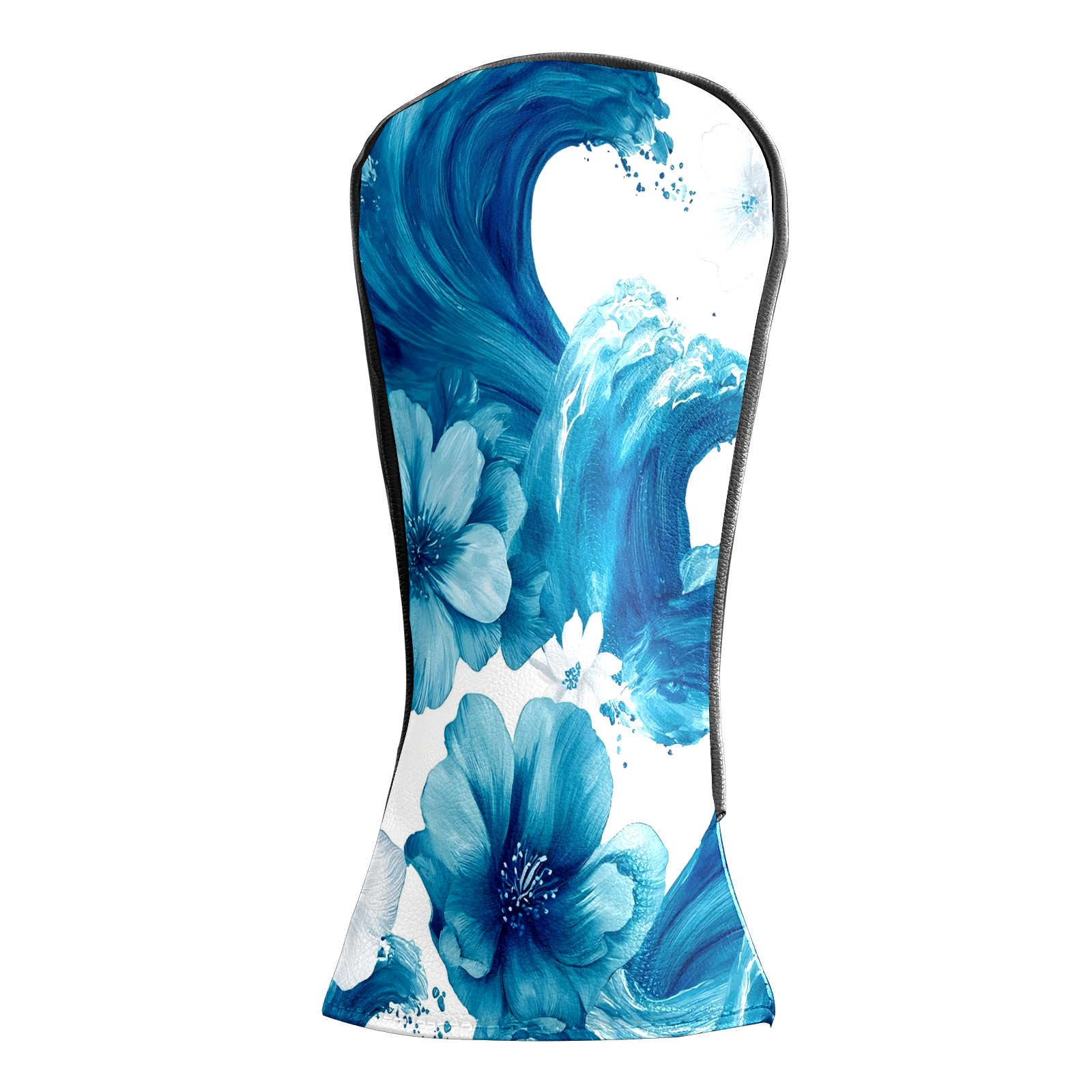 Golf Club Head Covers Blue White Dynamic Waves & Flowers Design for Driver & Hybrid, Waterproof PU Leather with Plush Velvet Lining, Scratch Protection & Secure Fit, Ideal Golf Gift for Men Women