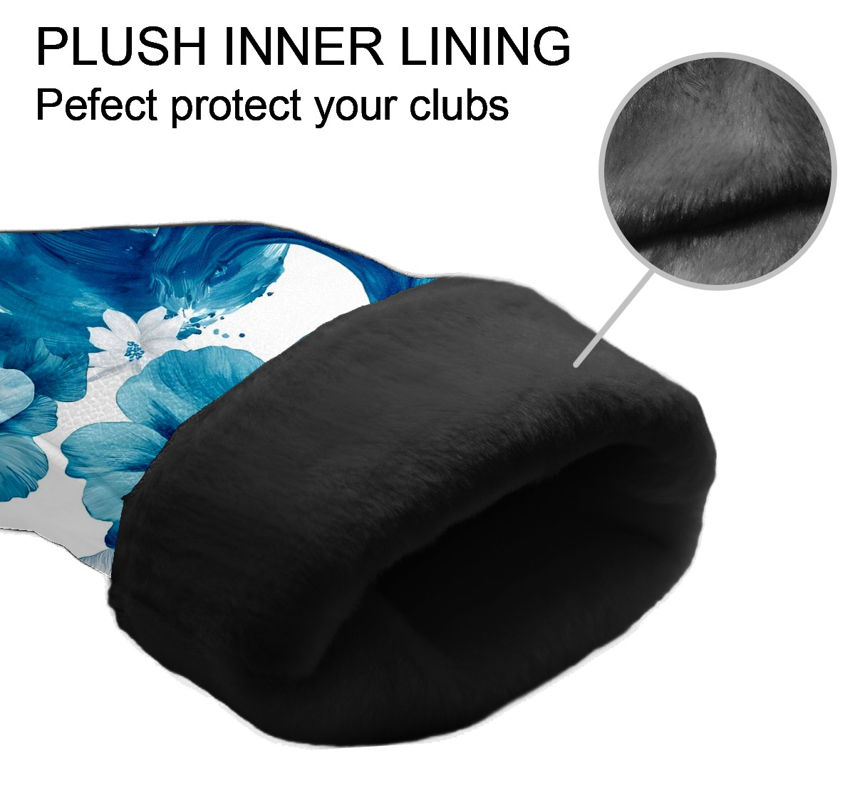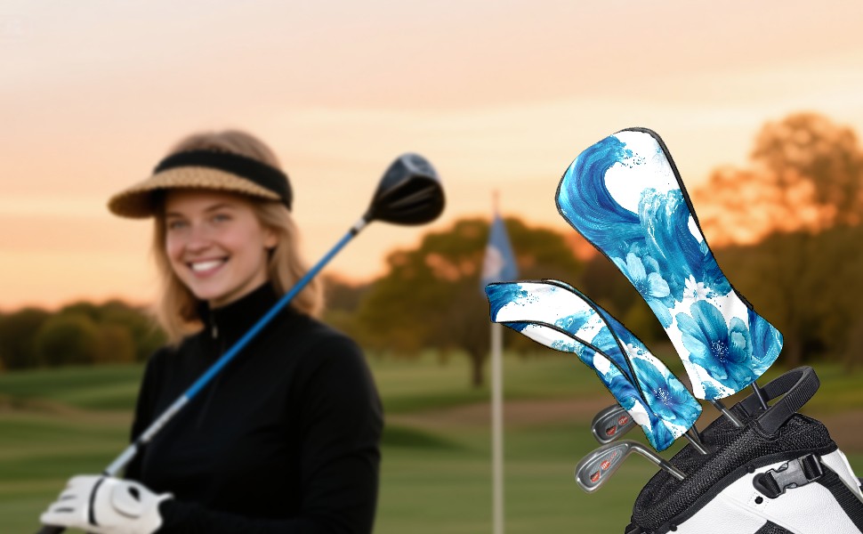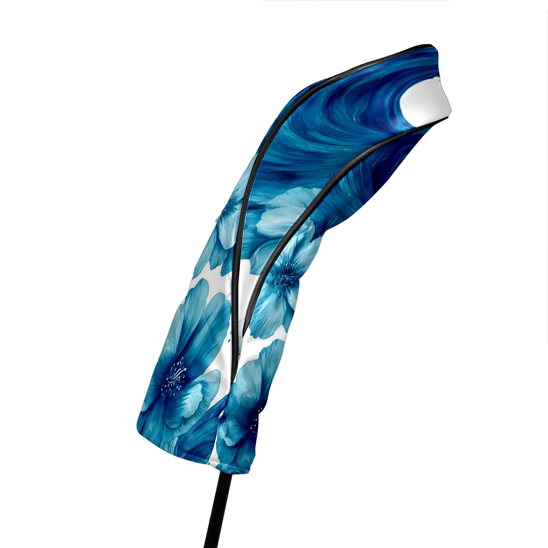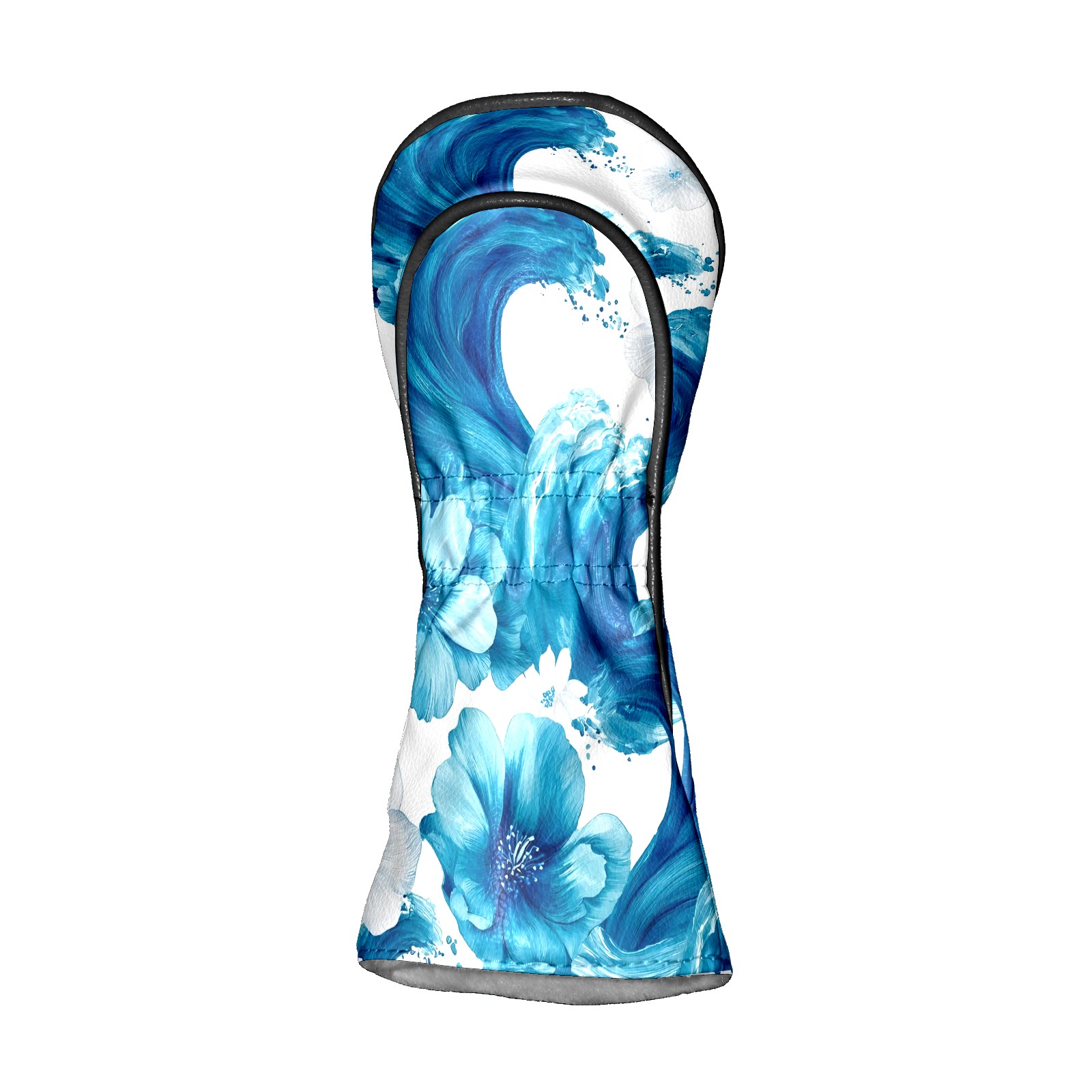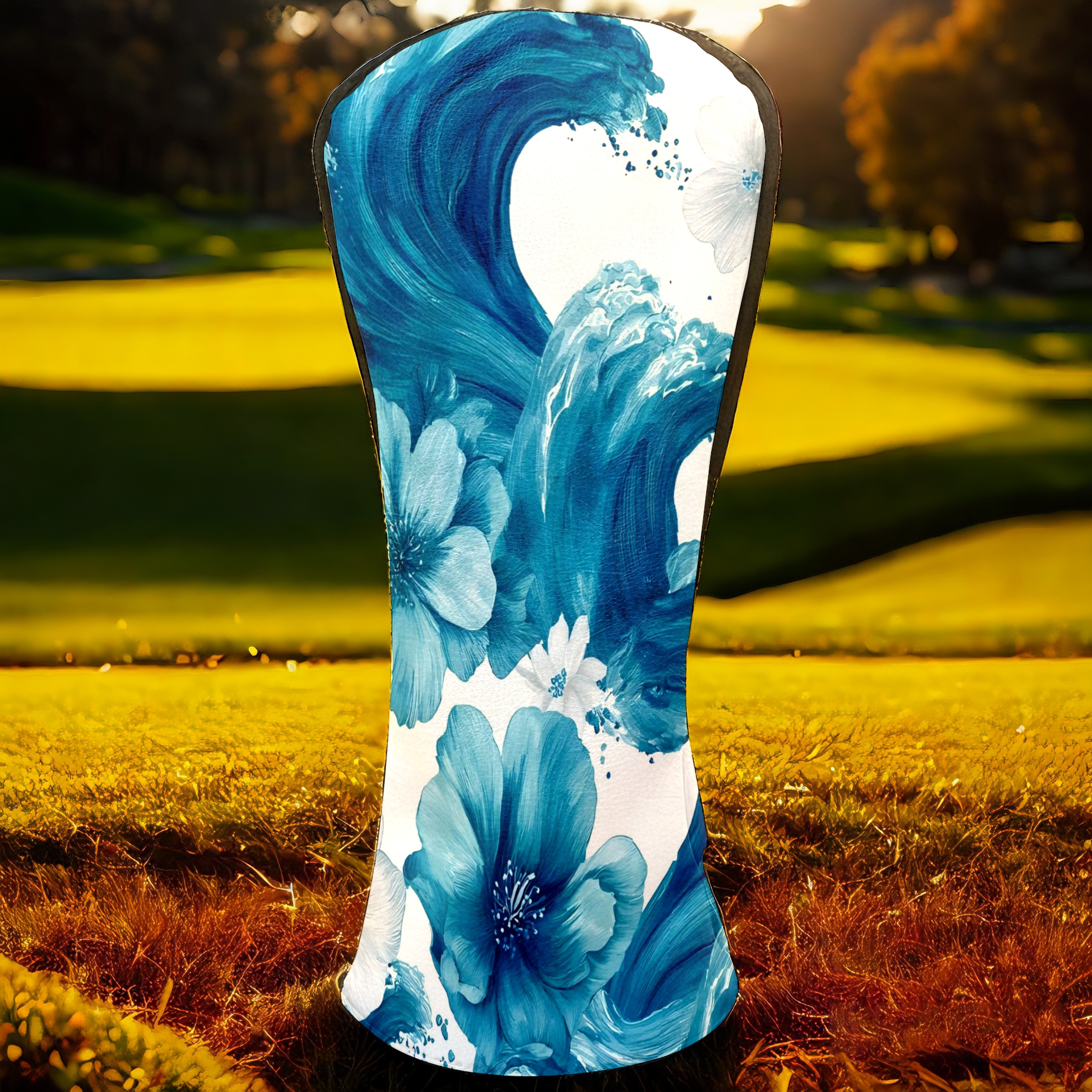 Golf Club Head Covers Blue White Dynamic Waves & Flowers Design for Driver & Hybrid, Waterproof PU Leather with Plush Velvet Lining, Scratch Protection & Secure Fit, Ideal Golf Gift for Men Women