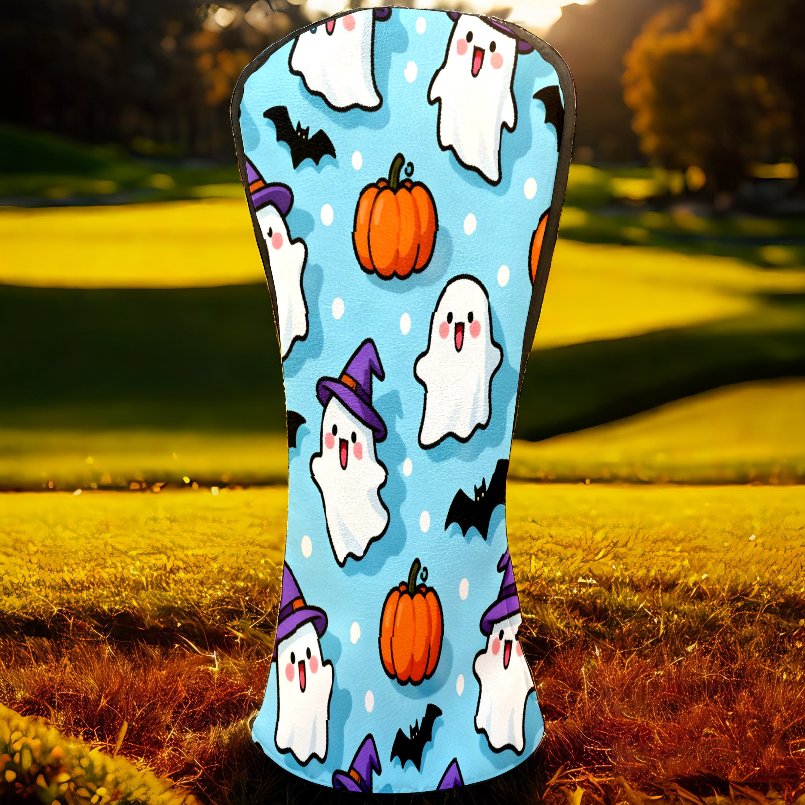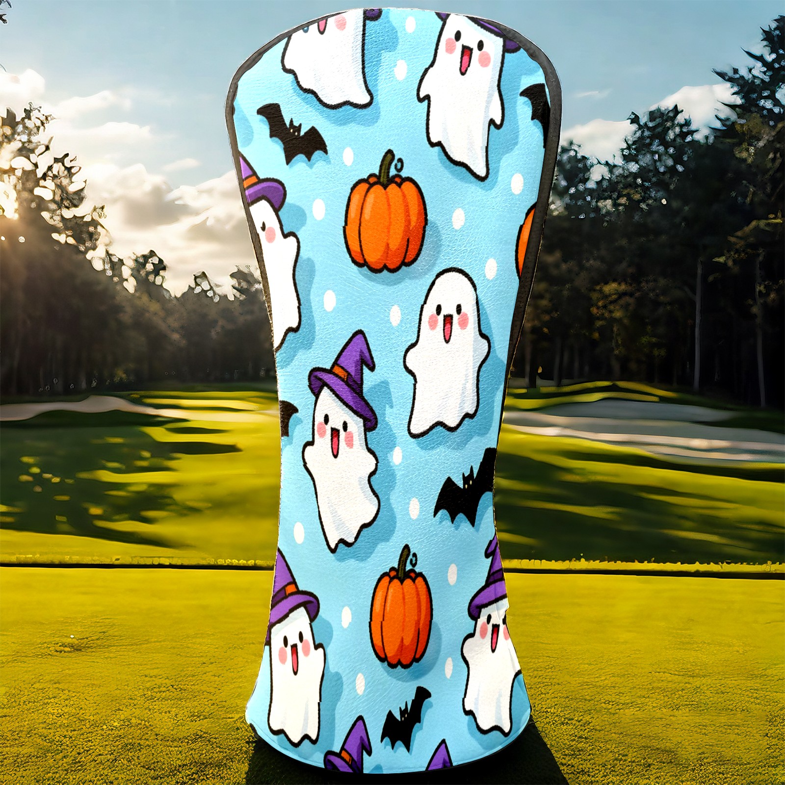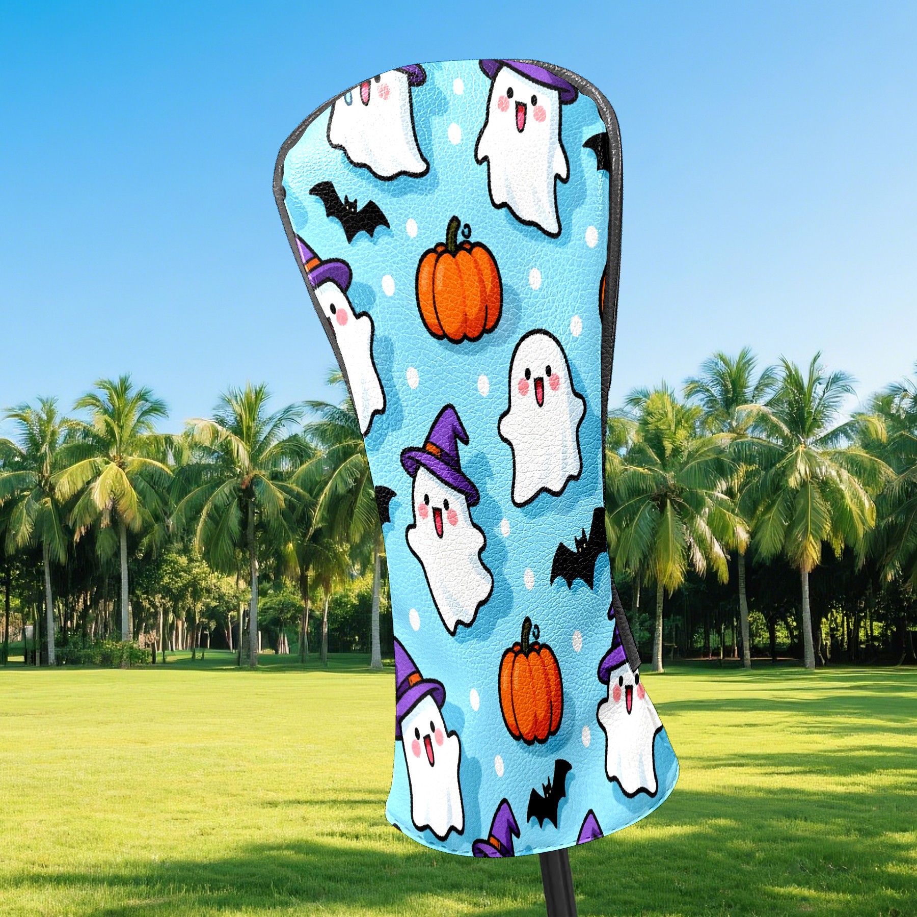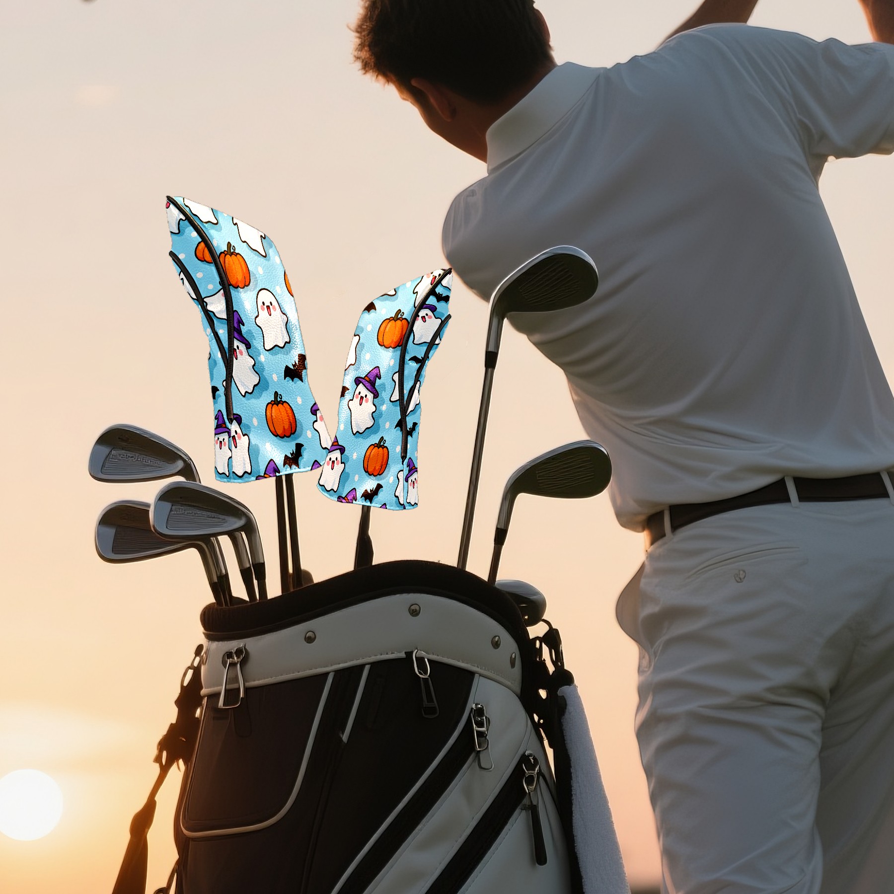 Golf Club Head Covers Light Blue Halloween Ghosts Pumpkins Design for Driver & Hybrid, Waterproof PU Leather with Plush Velvet Lining, Scratch Protection & Secure Fit, Ideal Golf Gift for Men Women