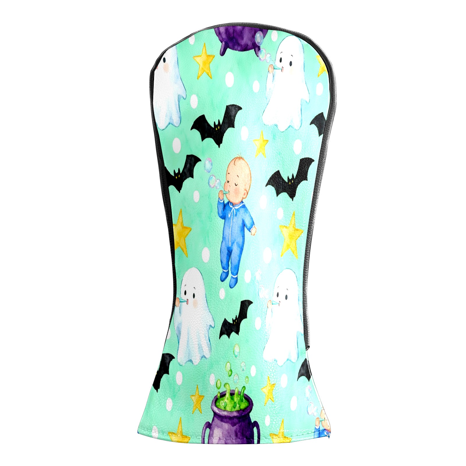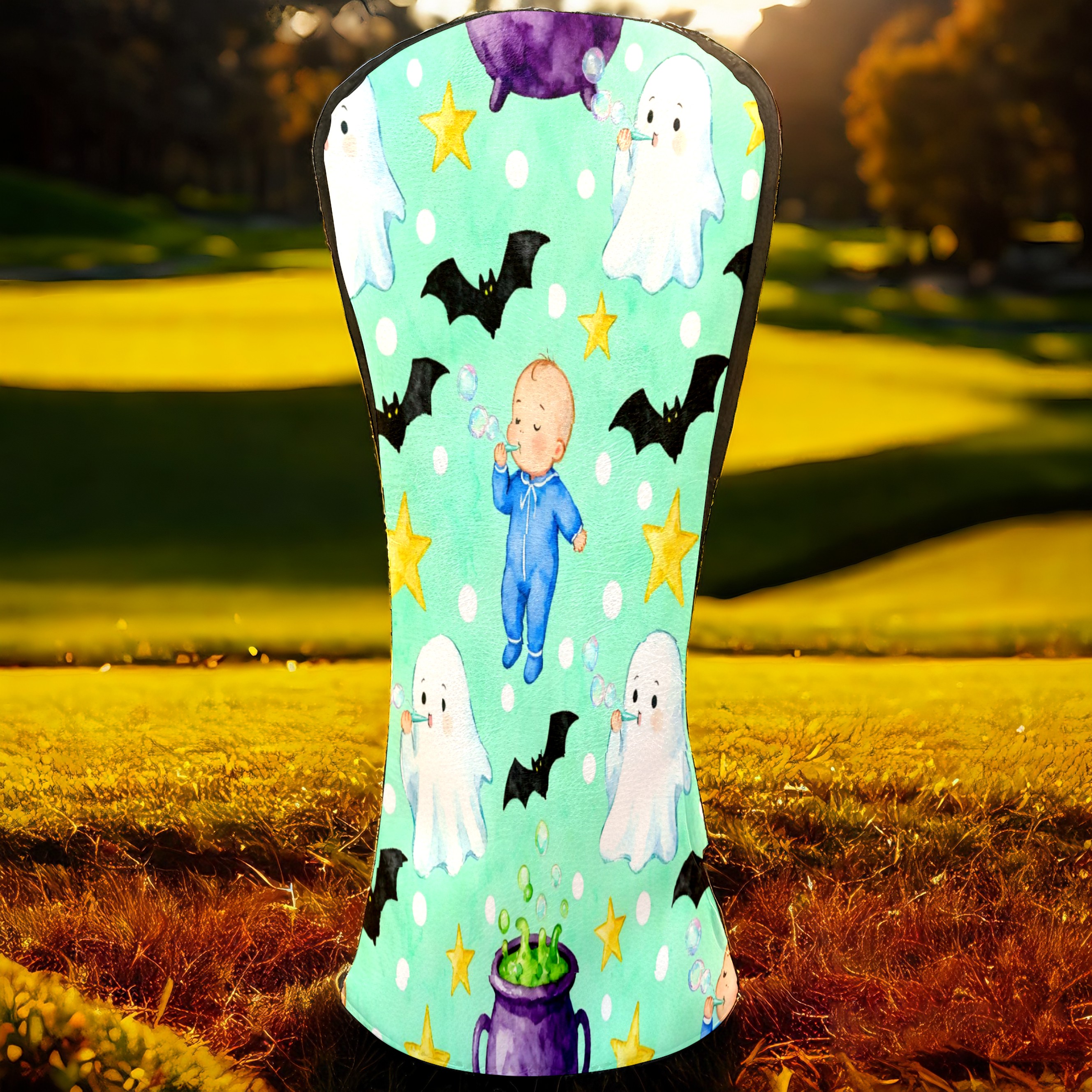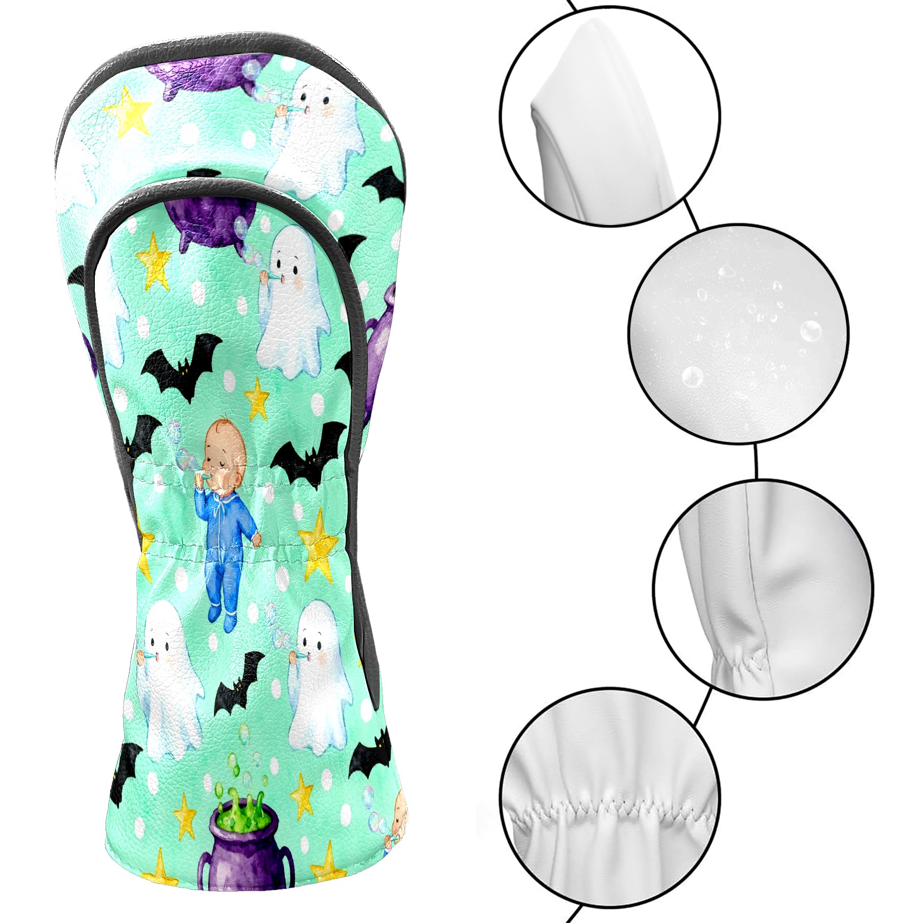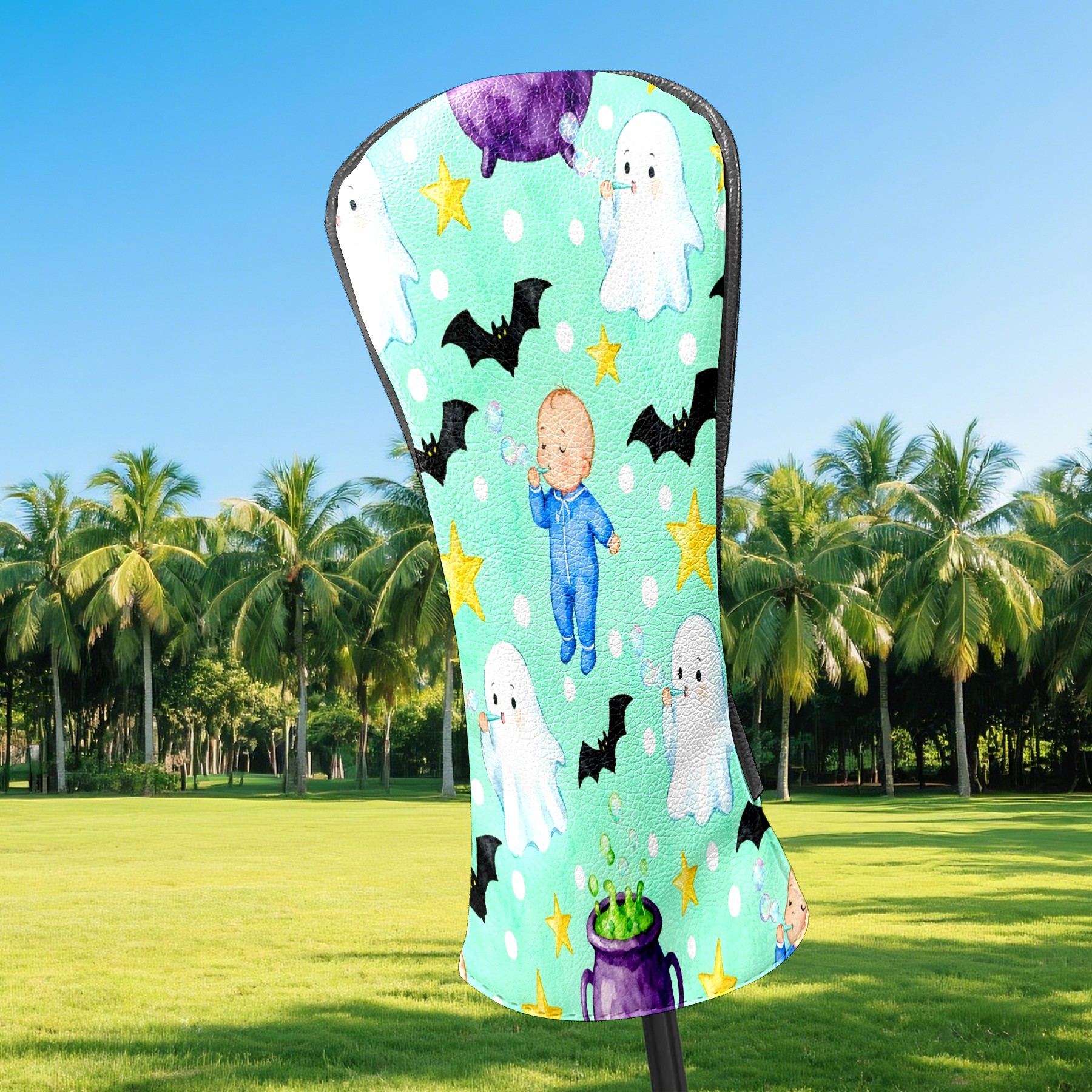 Golf Club Head Covers Mint Green Halloween Ghosts & Baby Design for Driver & Hybrid, Waterproof PU Leather with Plush Velvet Lining, Scratch Protection & Secure Fit, Ideal Golf Gift for Men Women
