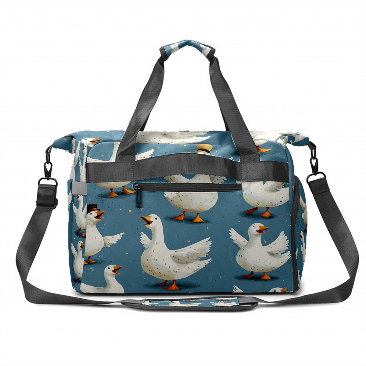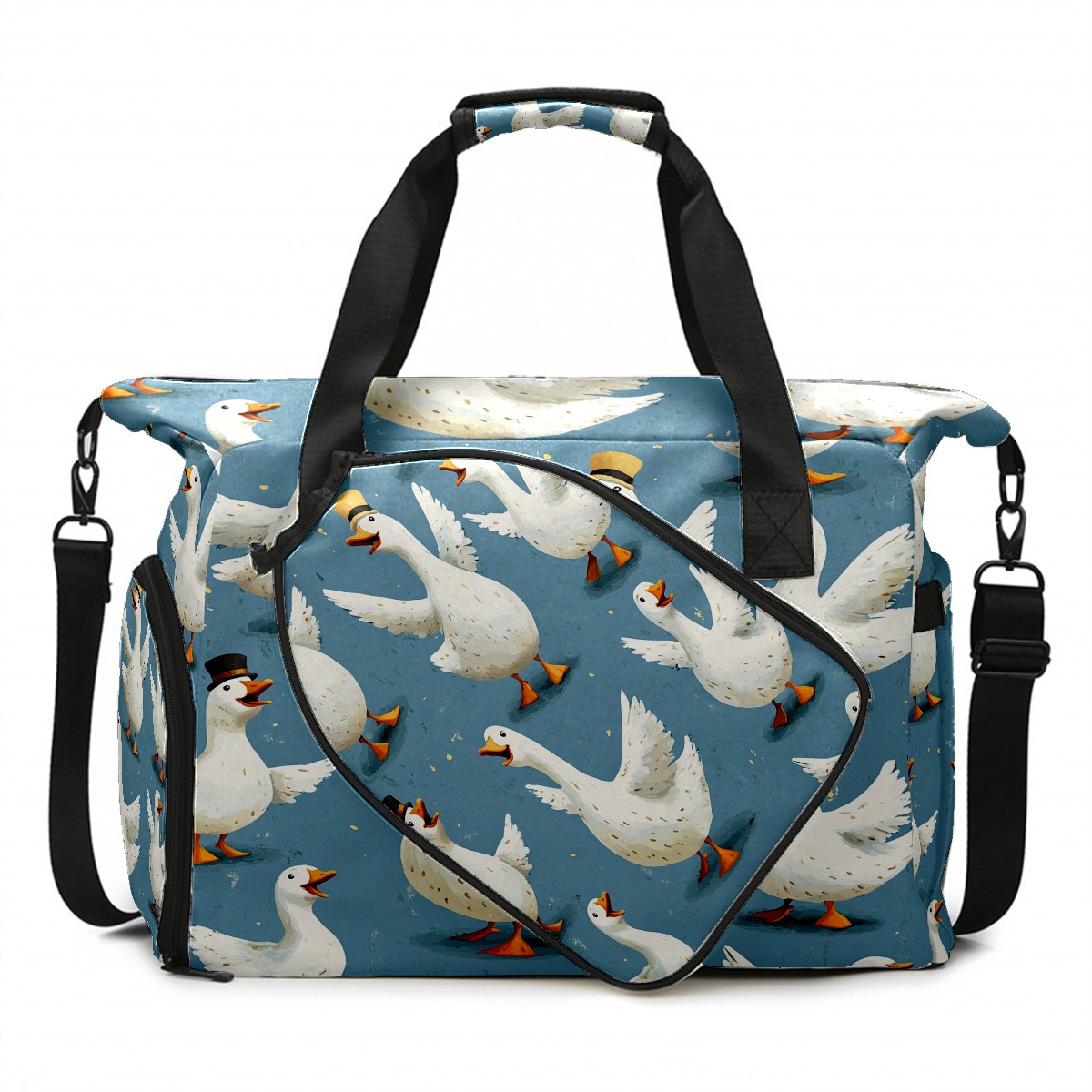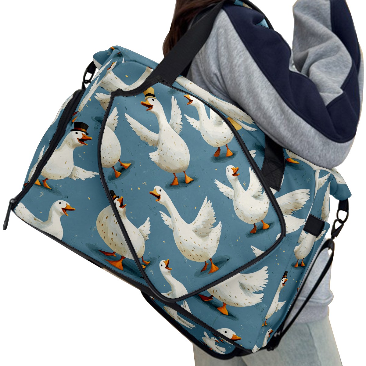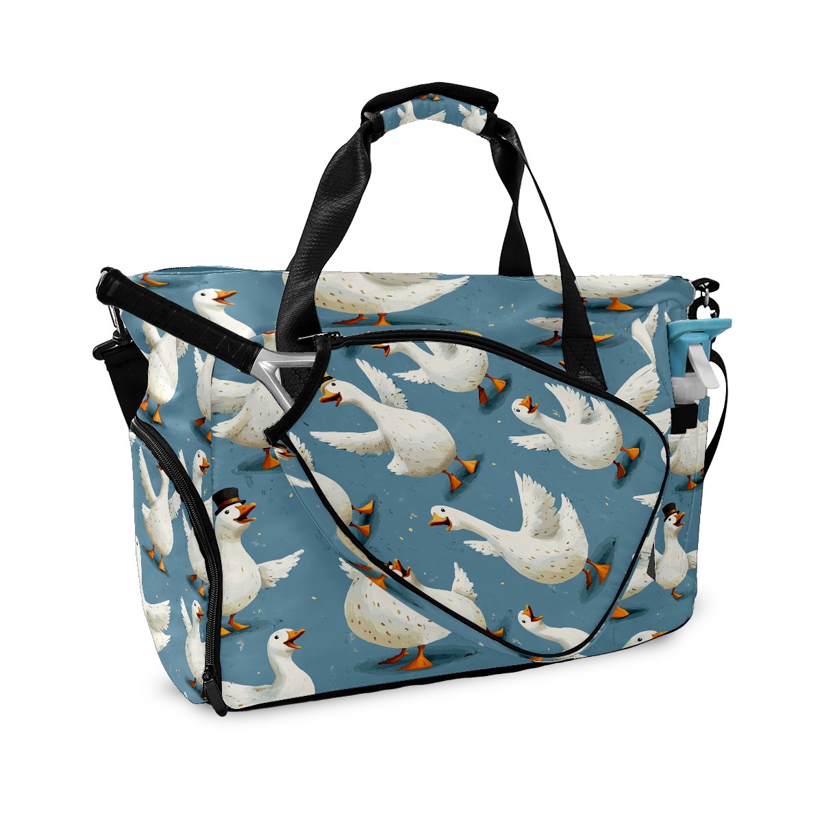 Large Gym Bag with Shoe Compartment, Water-Resistant Duffle Bag for Men and Women, Blue Background Silly Geese Sports Tote for Workout Travel