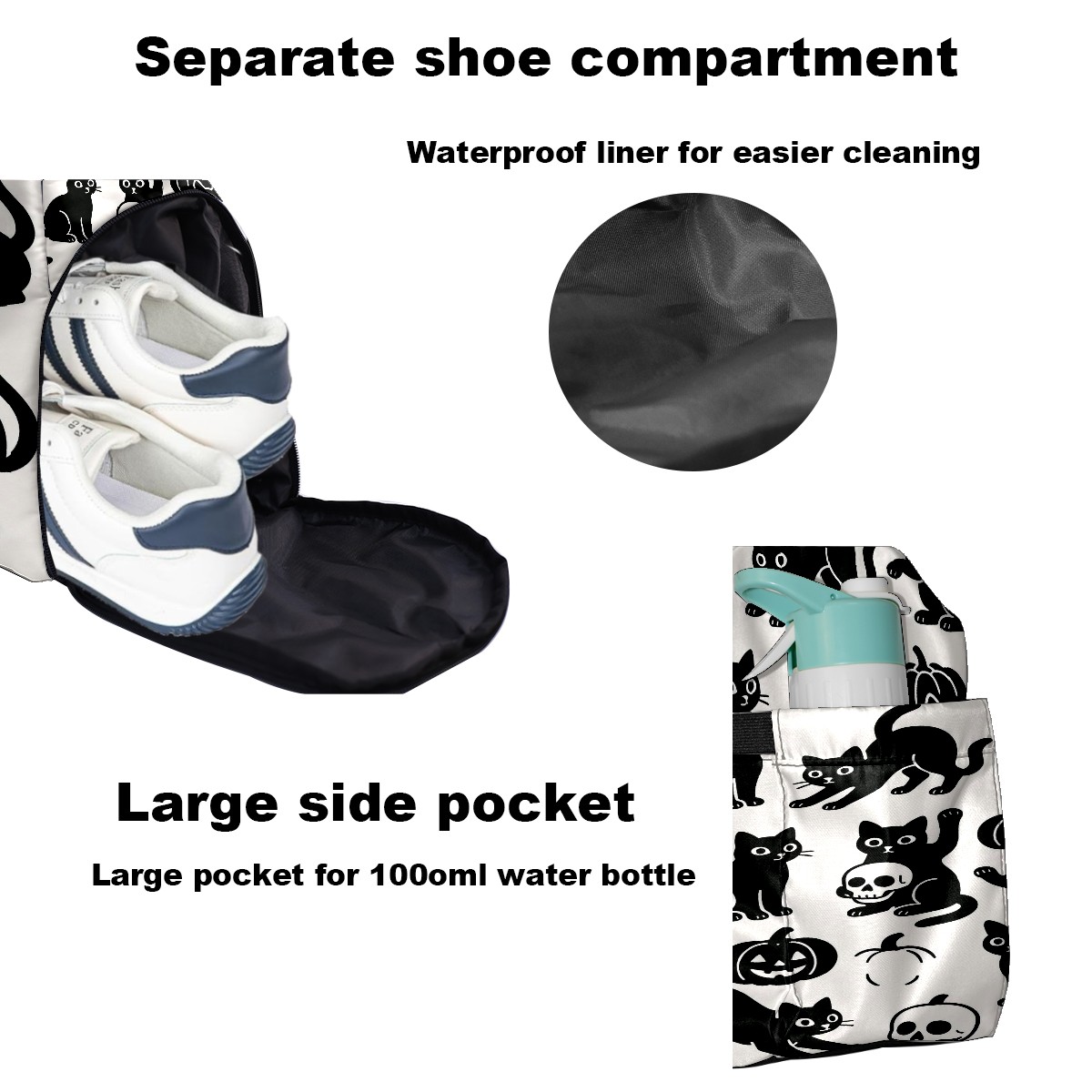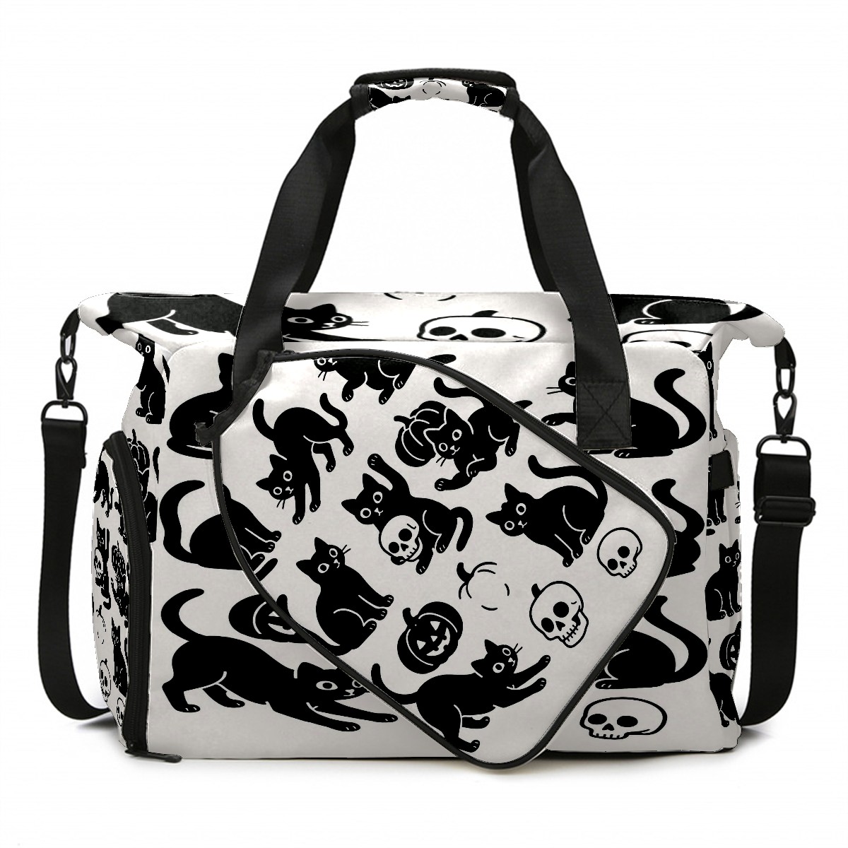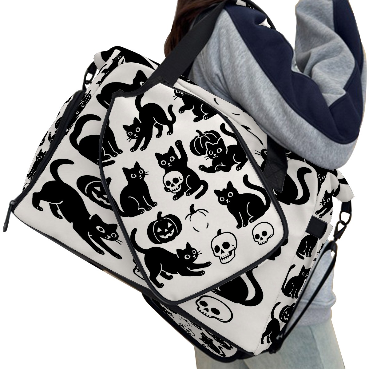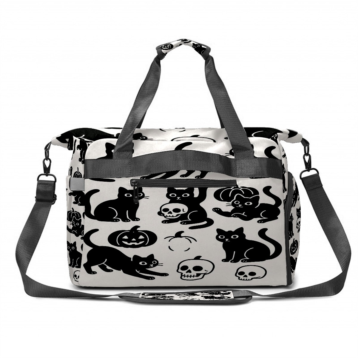Large Gym Bag with Shoe Compartment, Water-Resistant Duffle Bag for Men and Women, Halloween Black Cats Skulls Sports Tote for Workout Travel