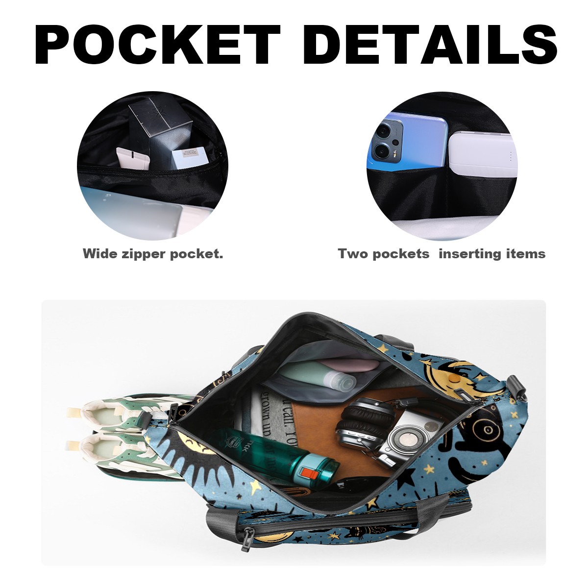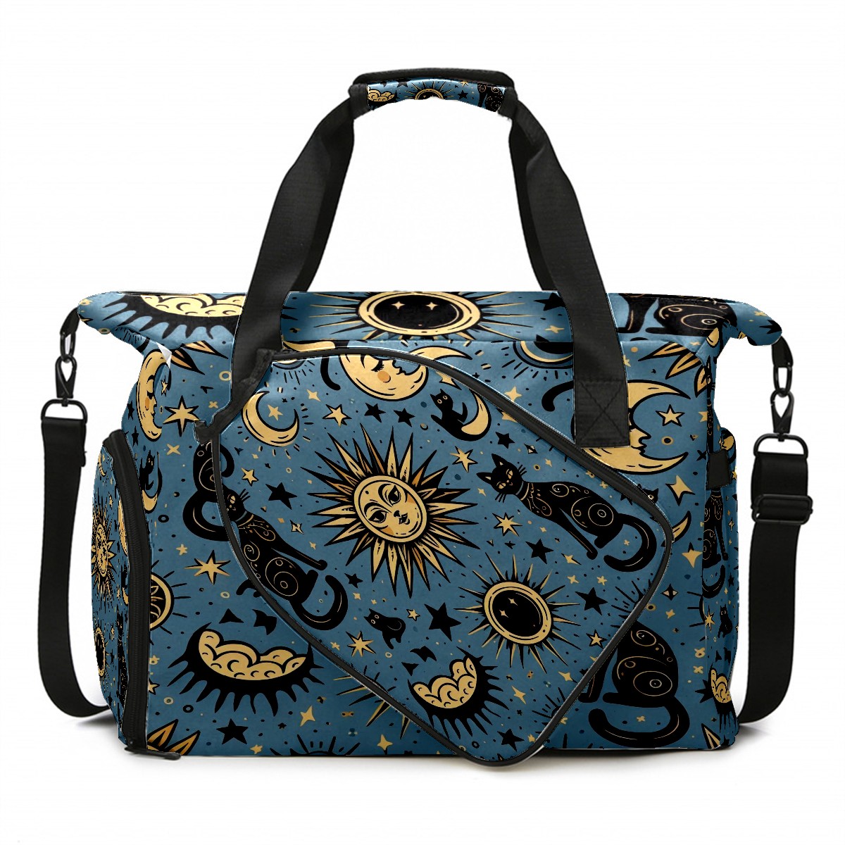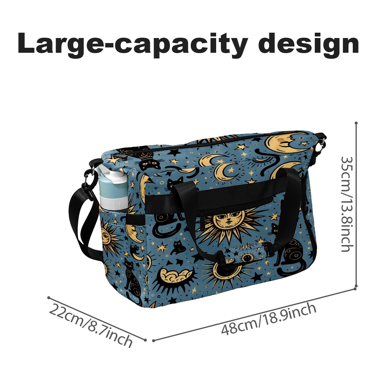 Large Gym Bag with Shoe Compartment, Water-Resistant Duffle Bag for Men and Women, Celestial Moon Star Black Cats Sports Tote for Workout Travel