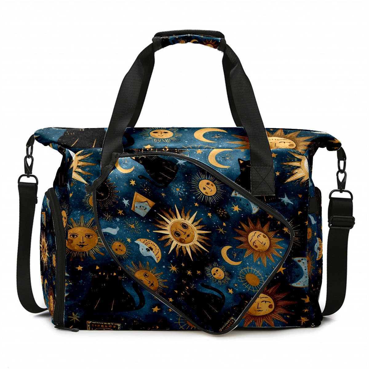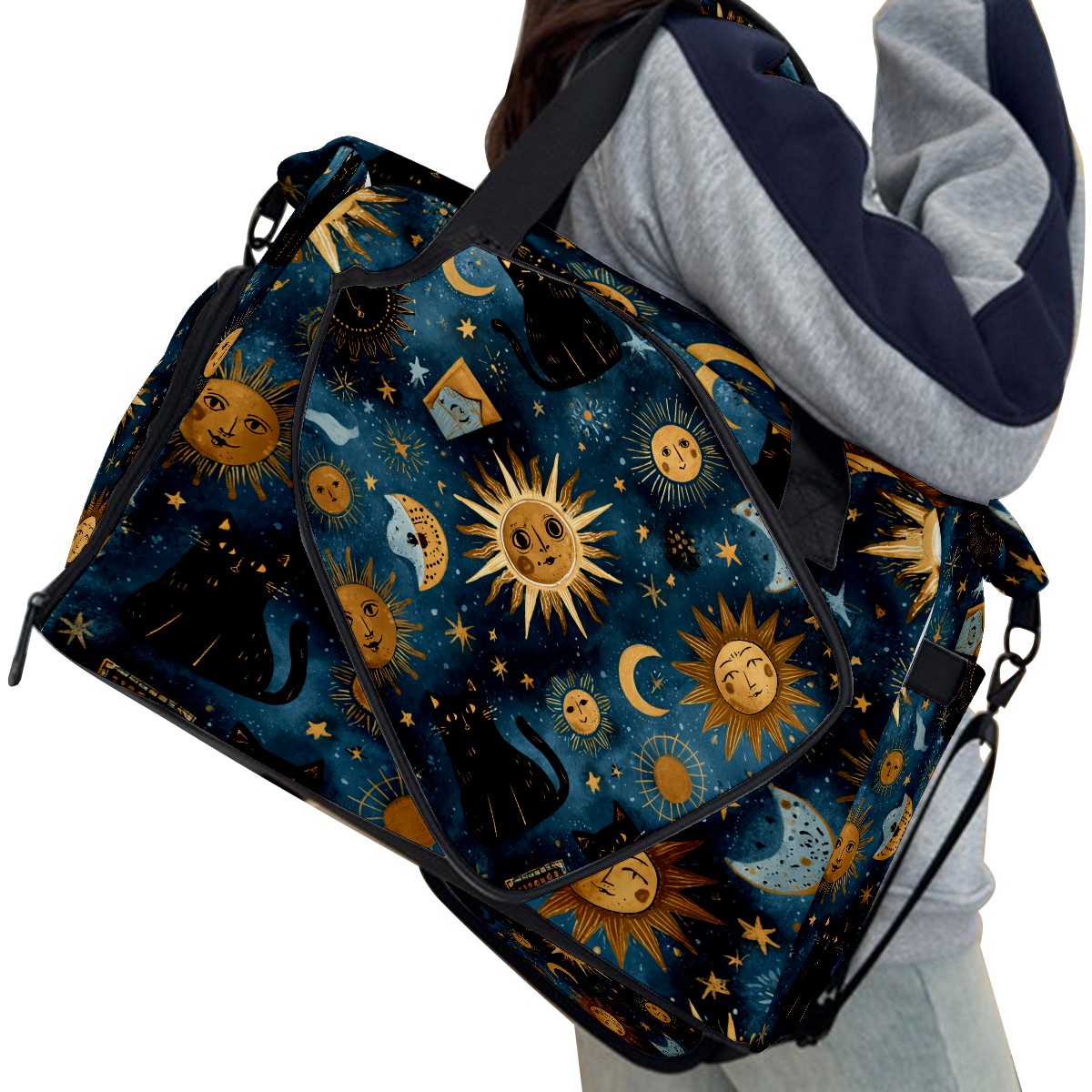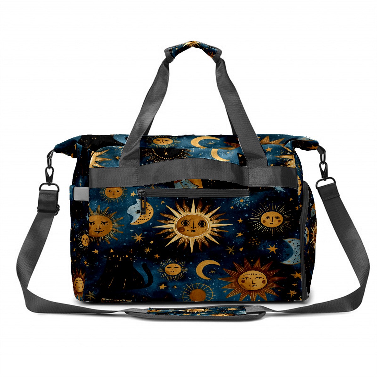 Large Gym Bag with Shoe Compartment, Water-Resistant Duffle Bag for Men and Women, Dark Blue Sun Moon Black Cats Sports Tote for Workout Travel