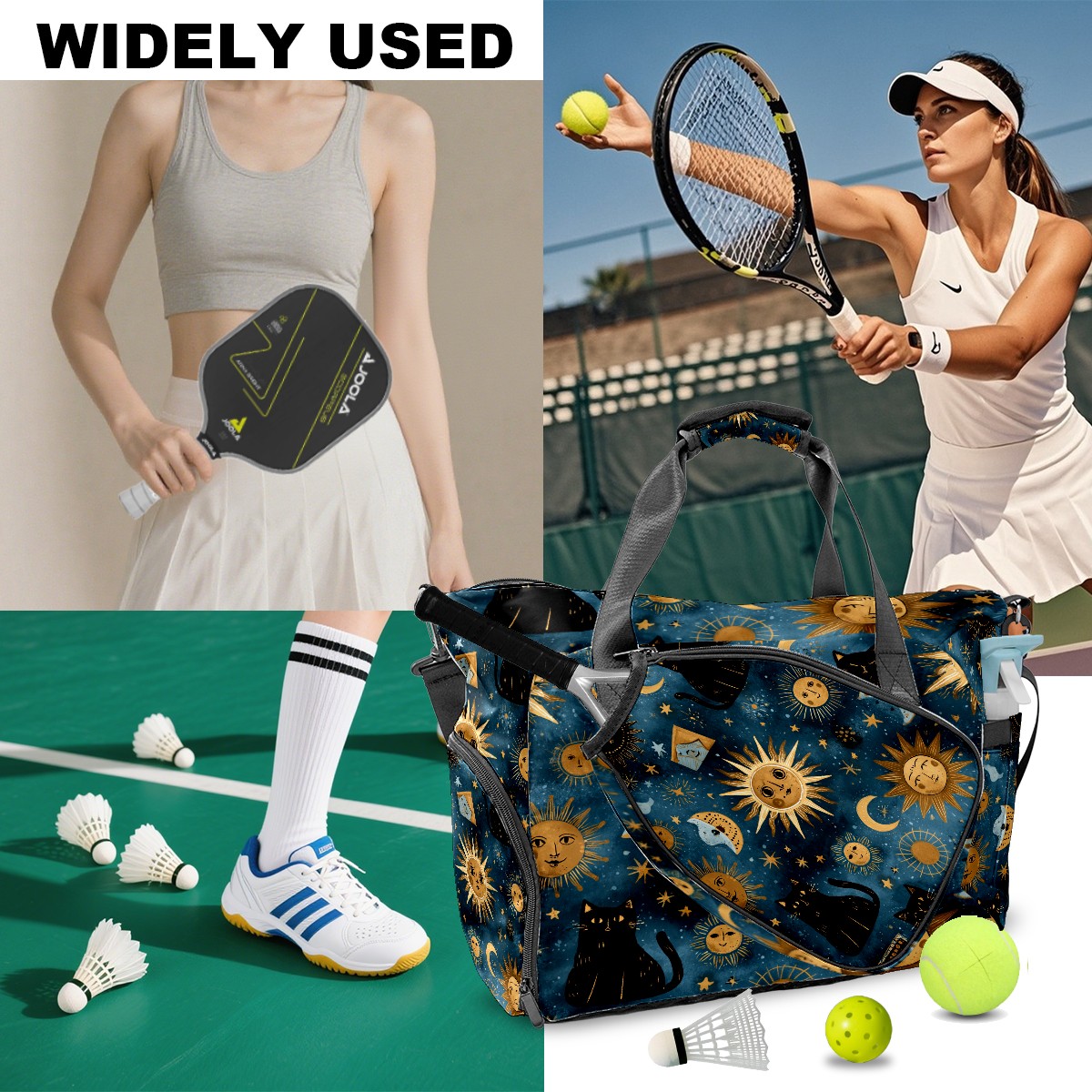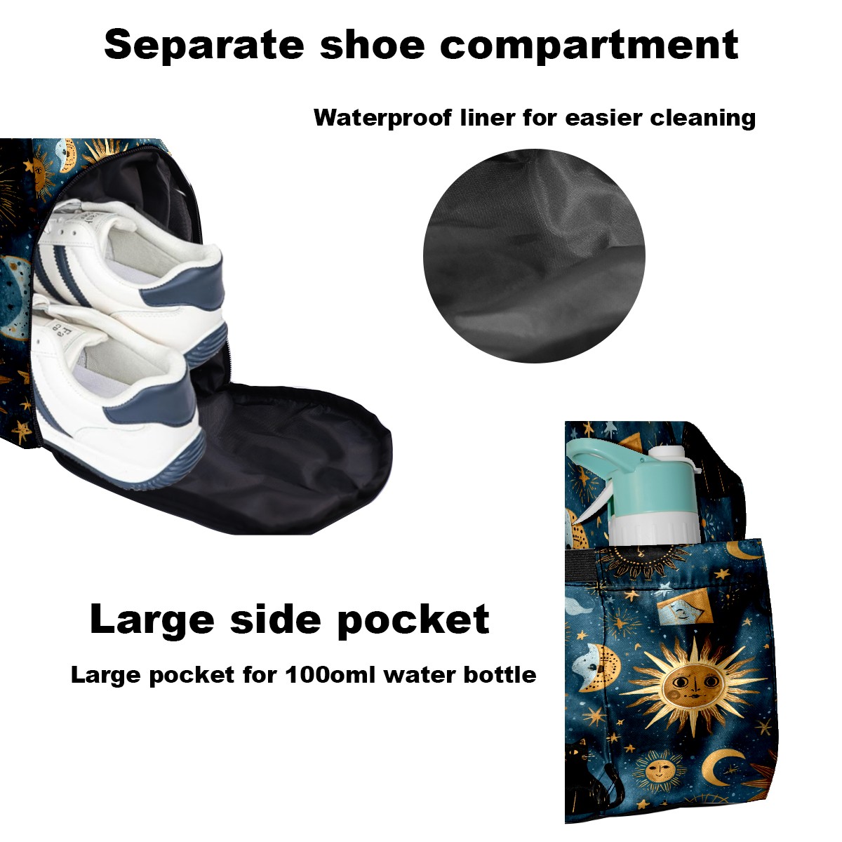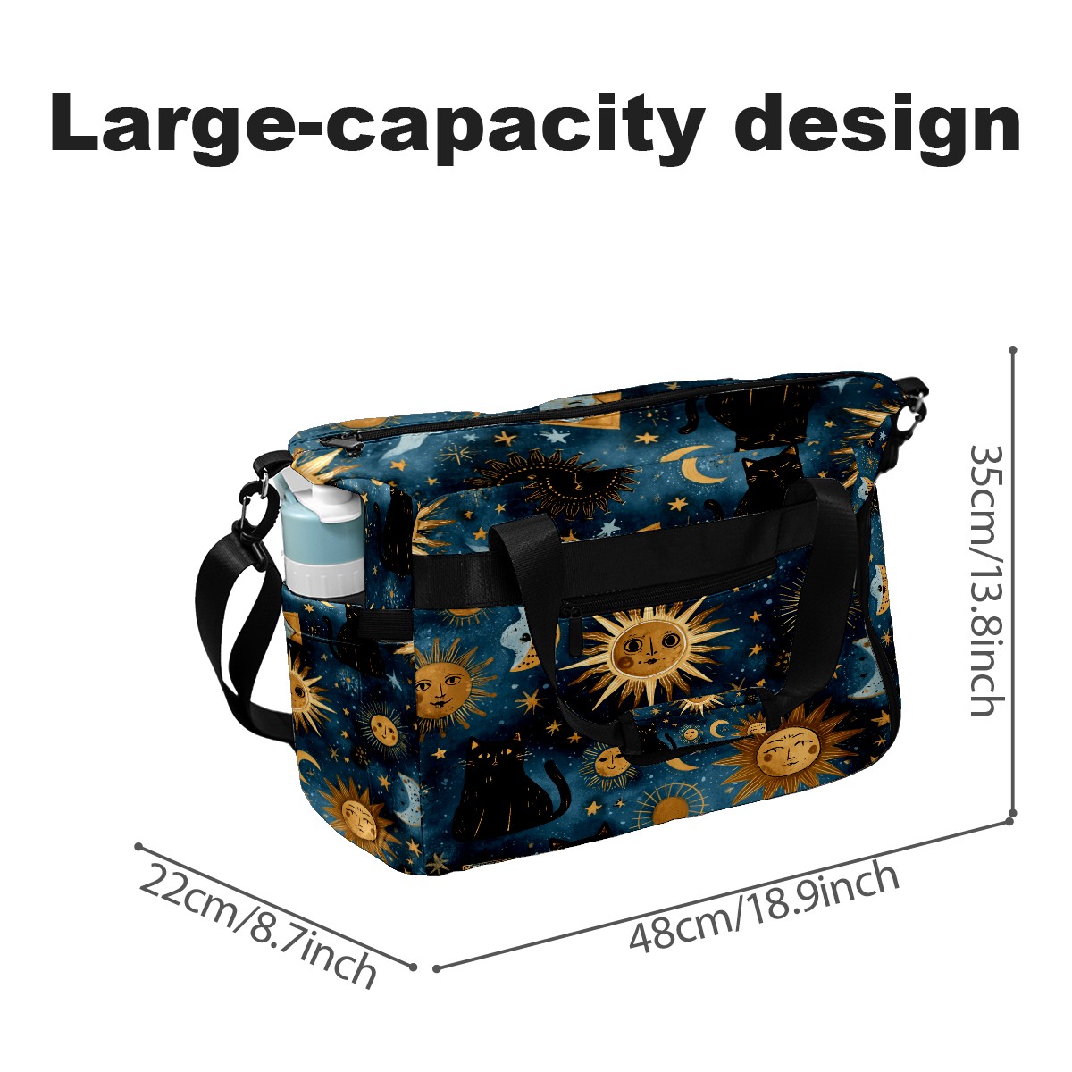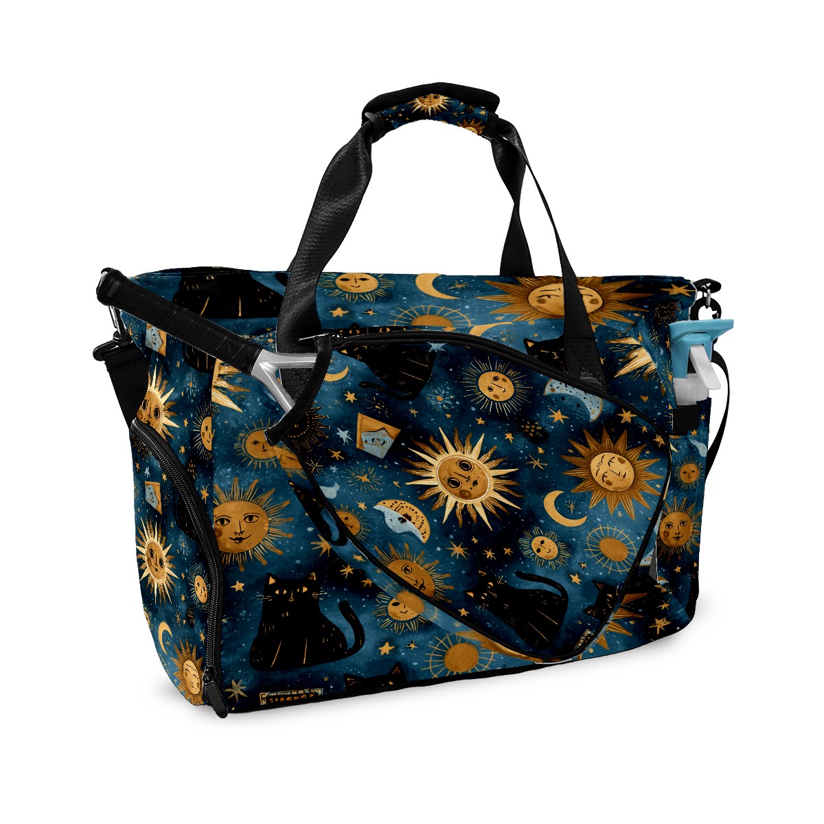 Large Gym Bag with Shoe Compartment, Water-Resistant Duffle Bag for Men and Women, Dark Blue Sun Moon Black Cats Sports Tote for Workout Travel