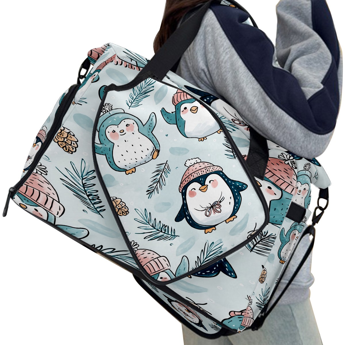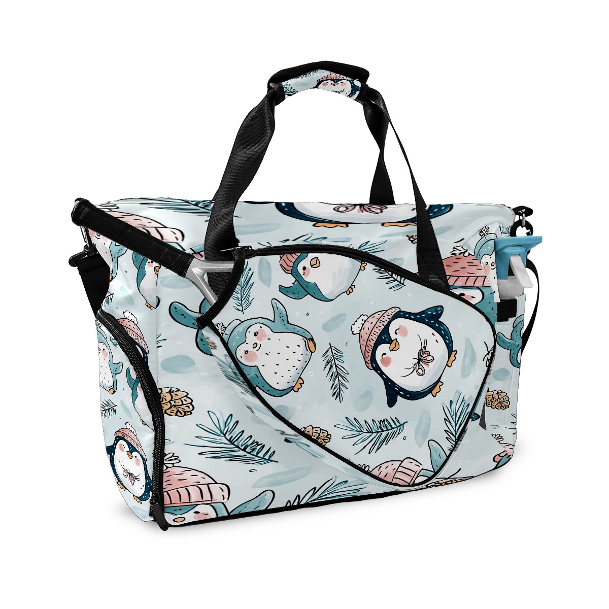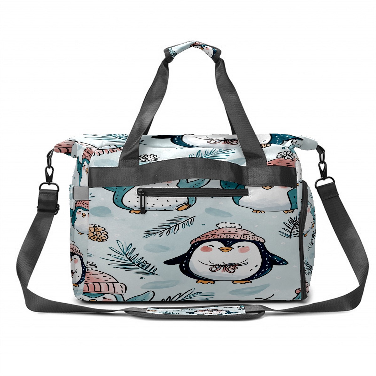 Large Gym Bag with Shoe Compartment, Water-Resistant Duffle Bag for Men and Women, Light Blue Hatted Penguins Sports Tote for Workout Travel