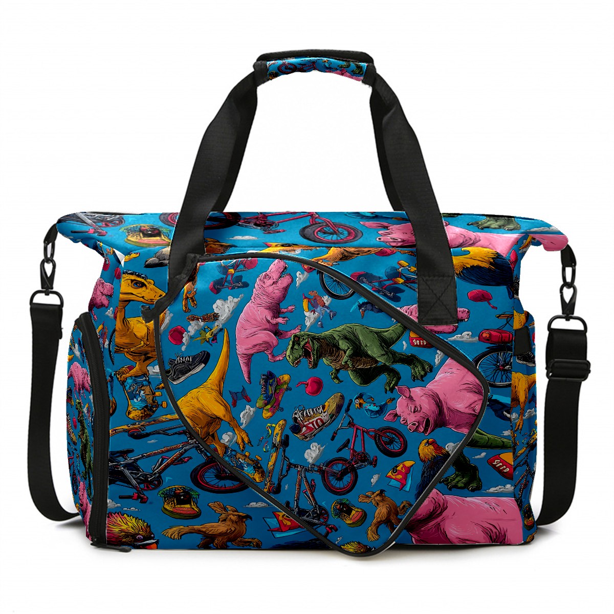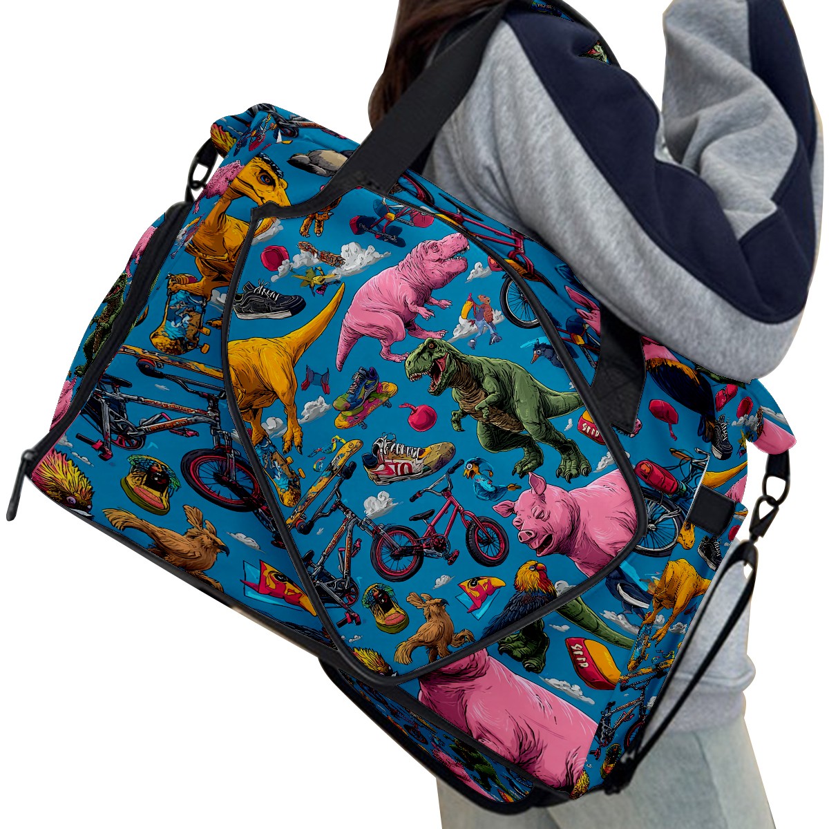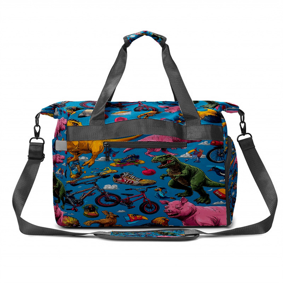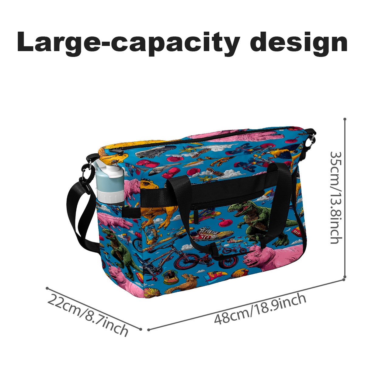 Large Gym Bag with Shoe Compartment, Water-Resistant Duffle Bag for Men and Women, Colorful Dinosaurs Blue Background Sports Tote for Workout Travel