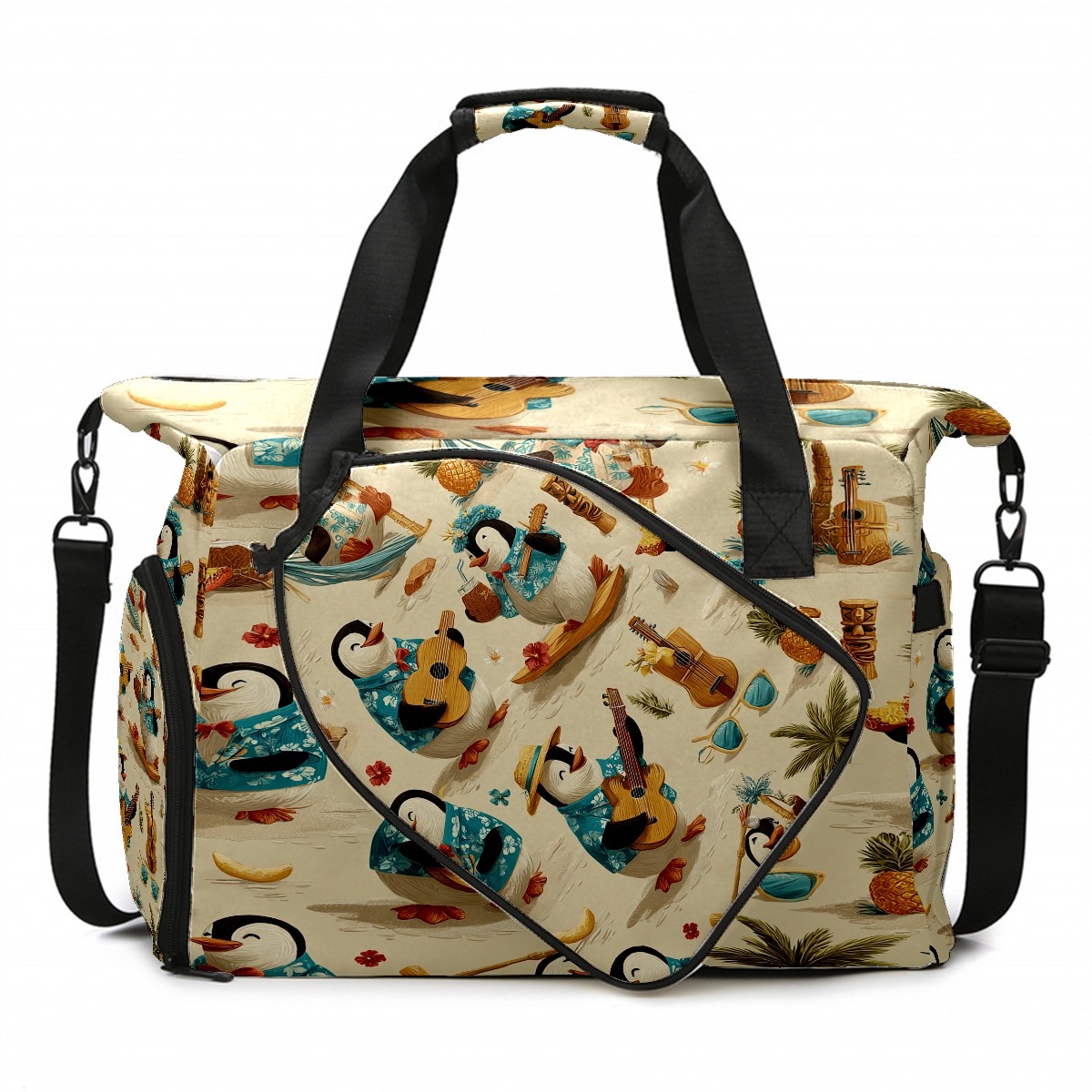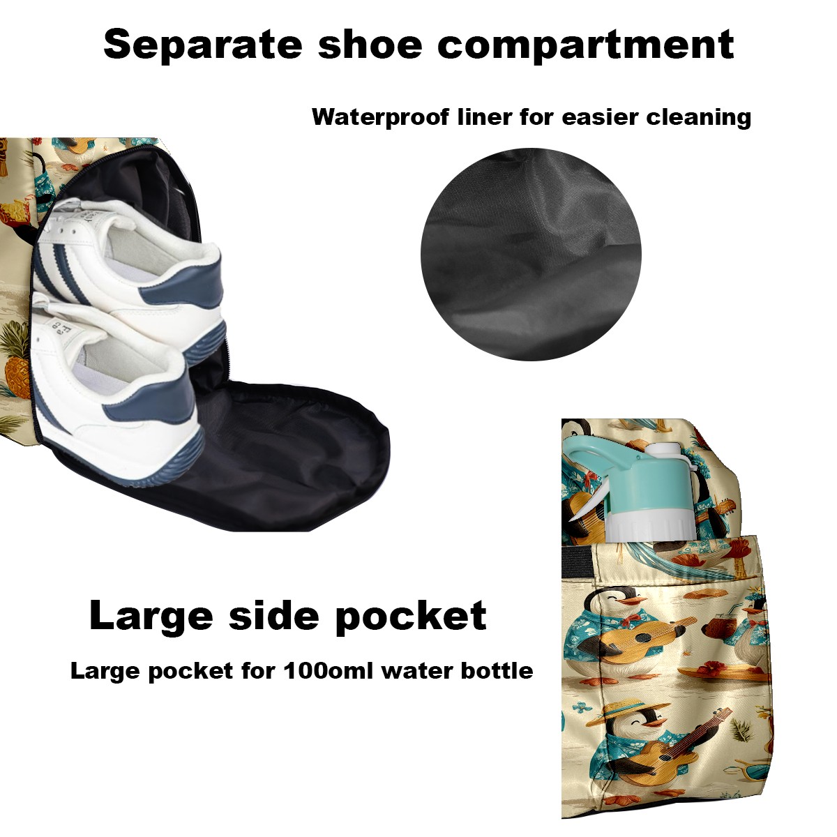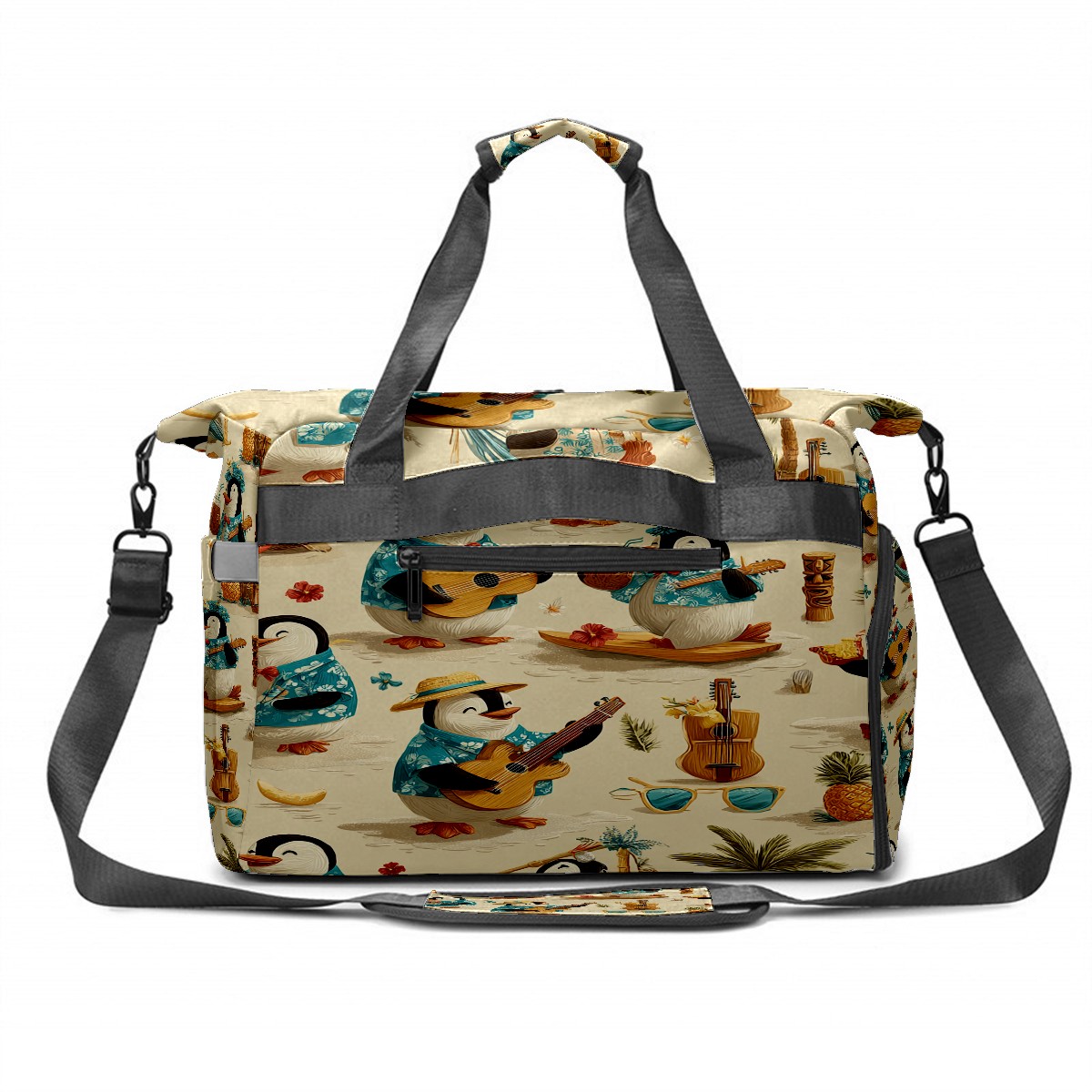Large Gym Bag with Shoe Compartment, Water-Resistant Duffle Bag for Men and Women, Penguins Playing Instruments Light Brown Sports Tote for Workout Travel