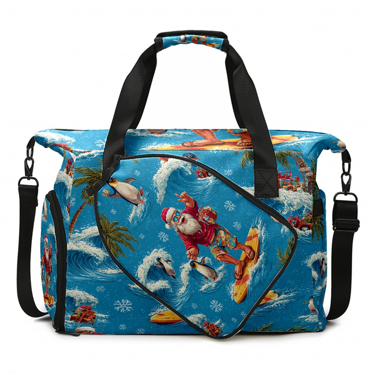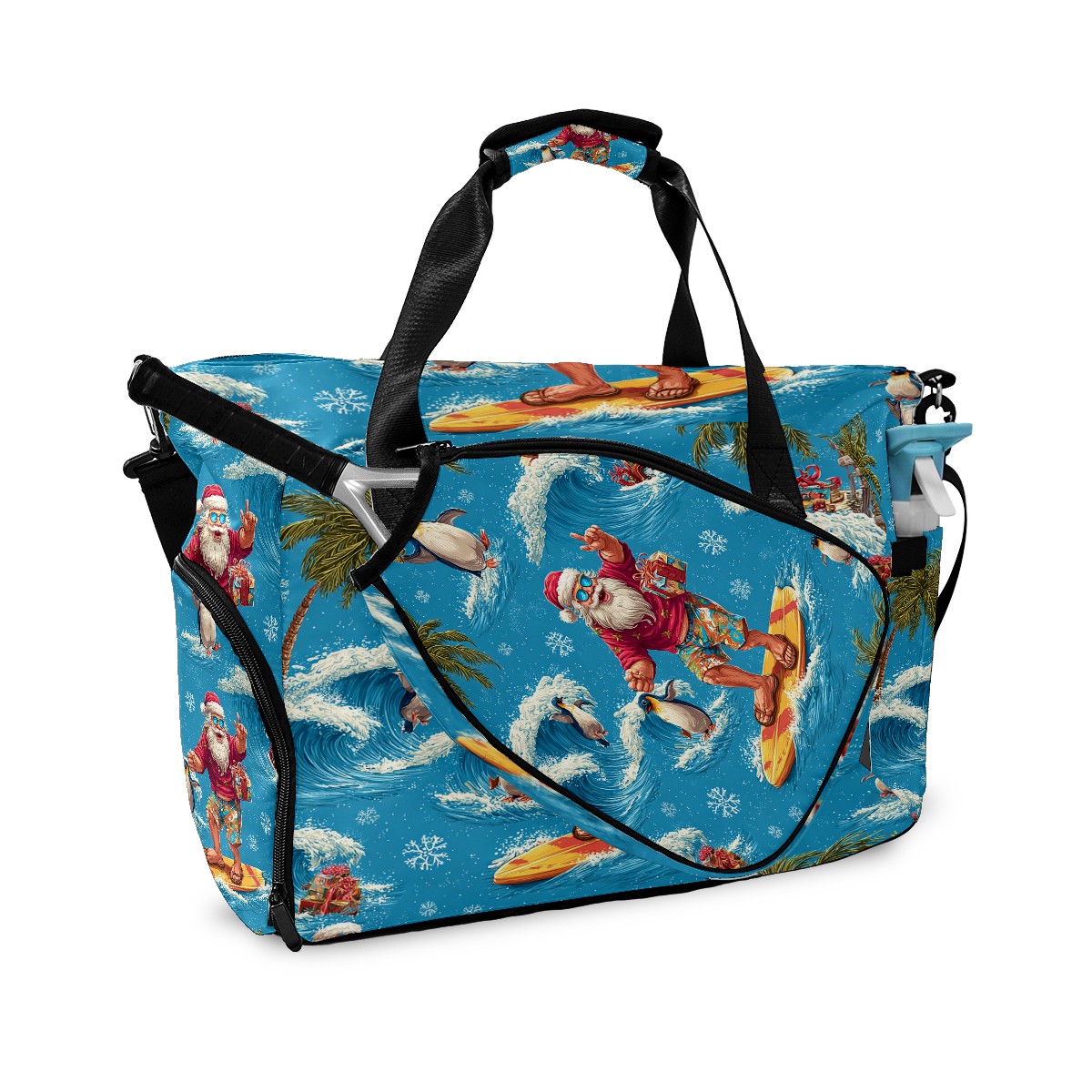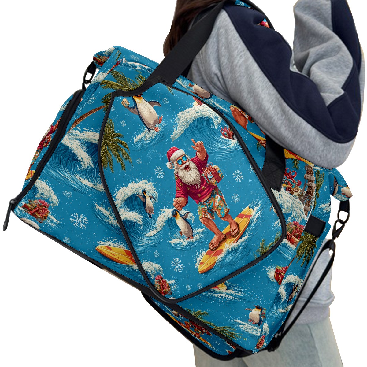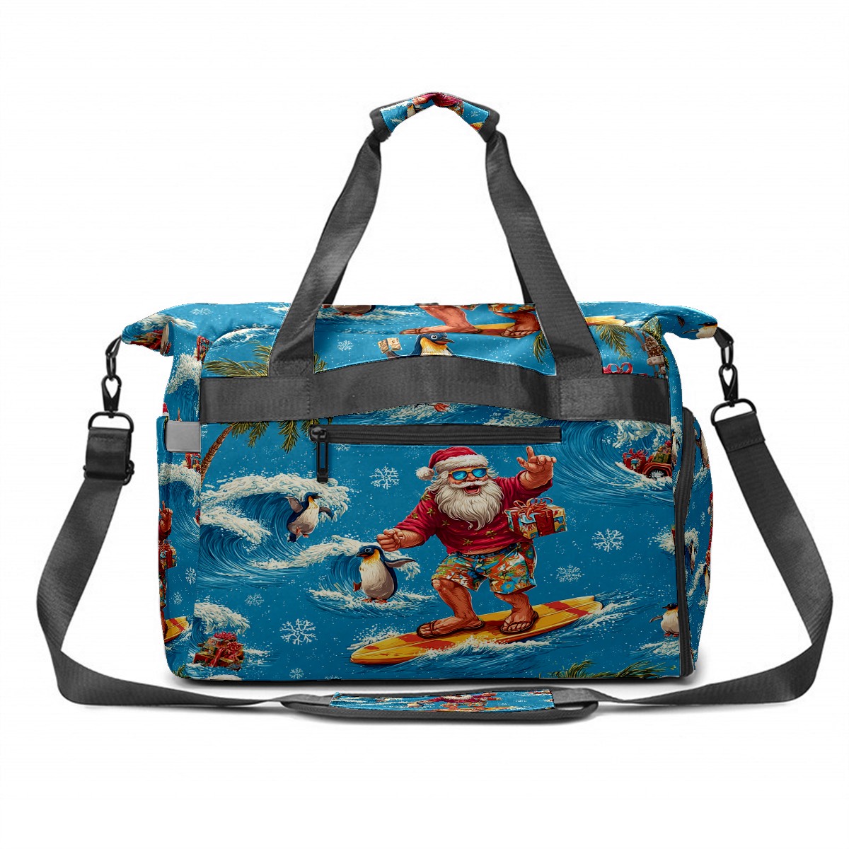 Large Gym Bag with Shoe Compartment, Water-Resistant Duffle Bag for Men and Women, Santa Penguin Surfing Blue Ocean Sports Tote for Workout Travel