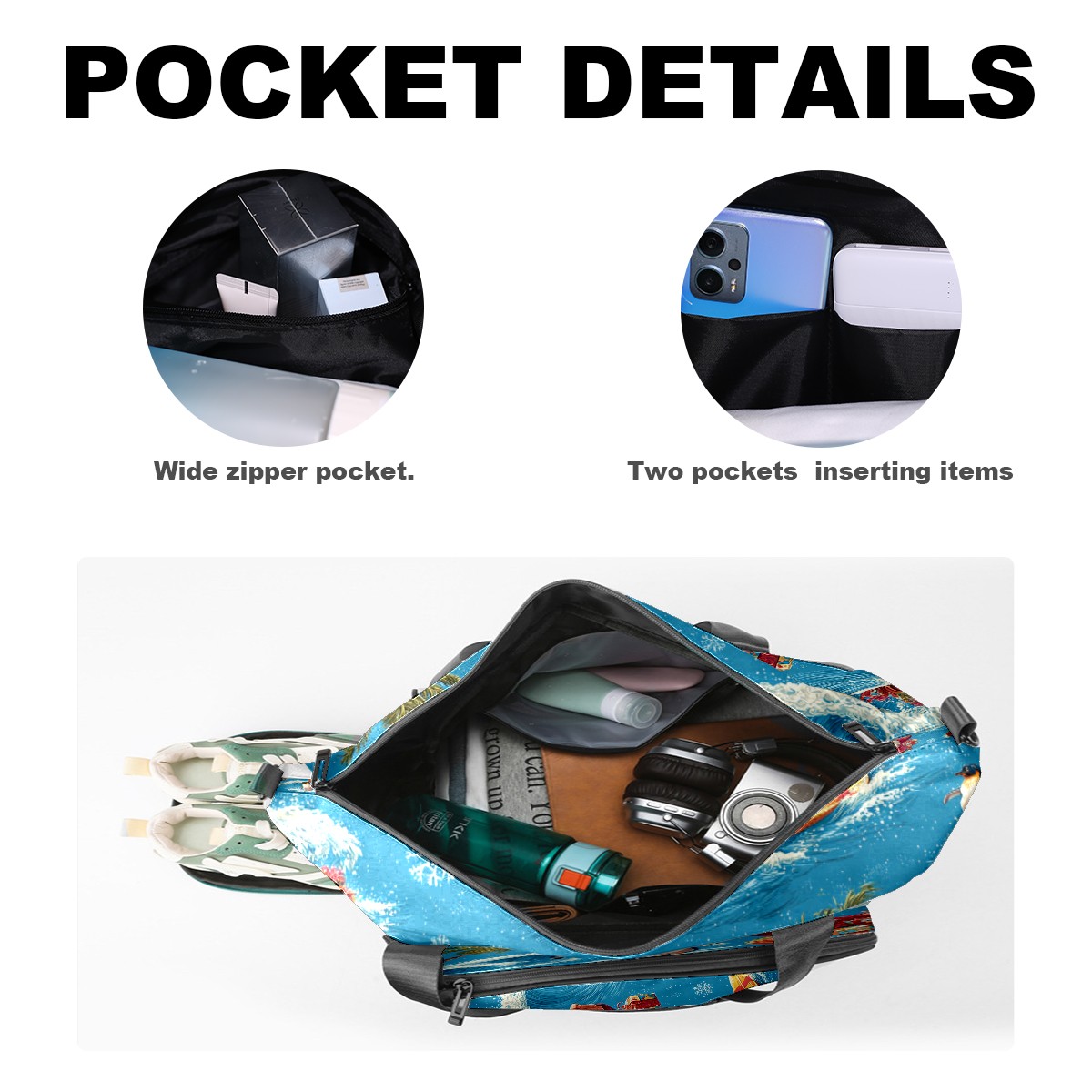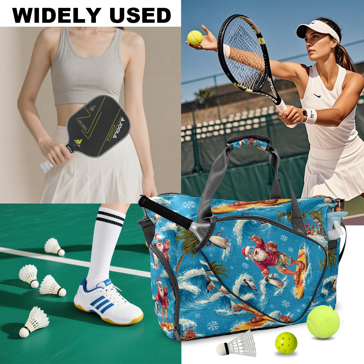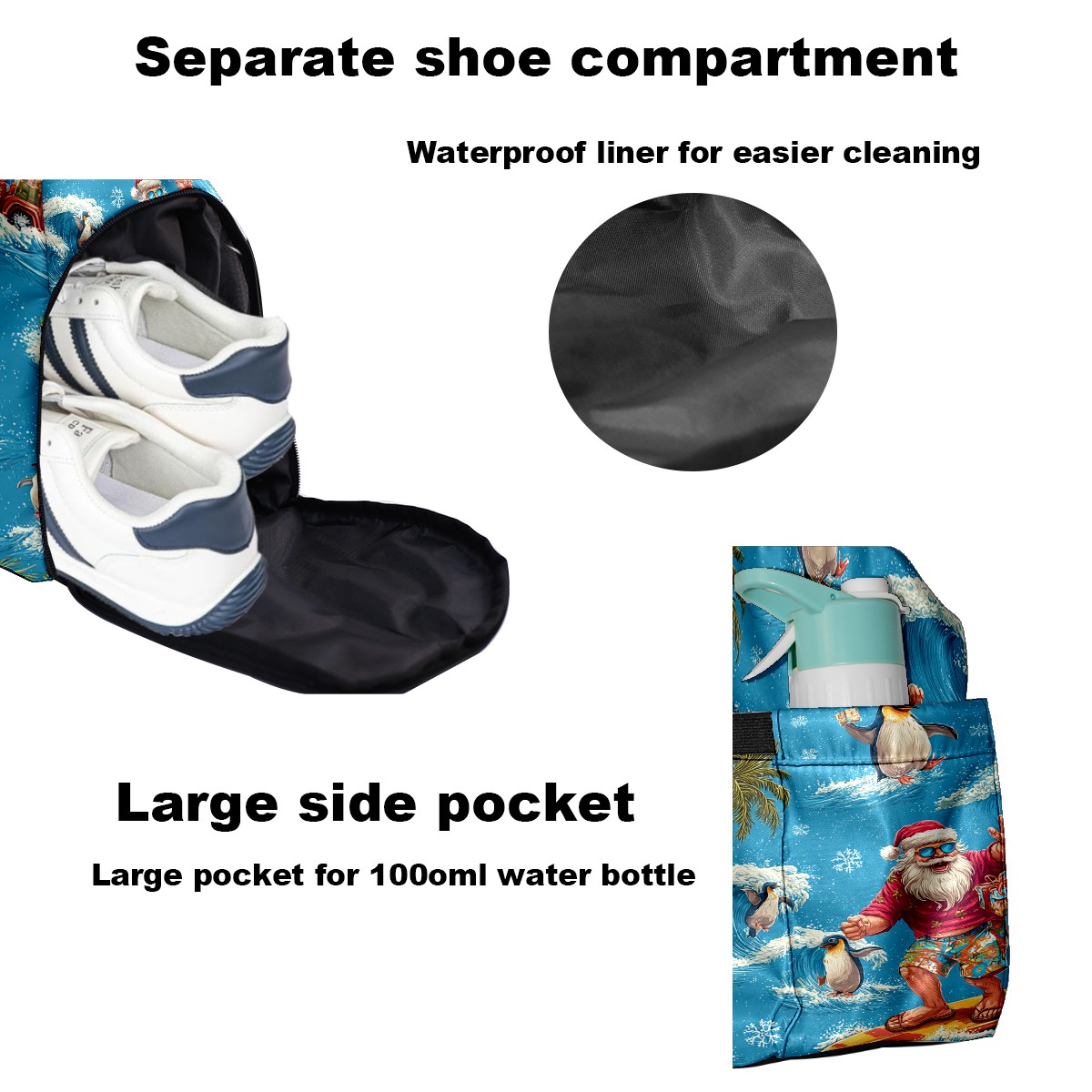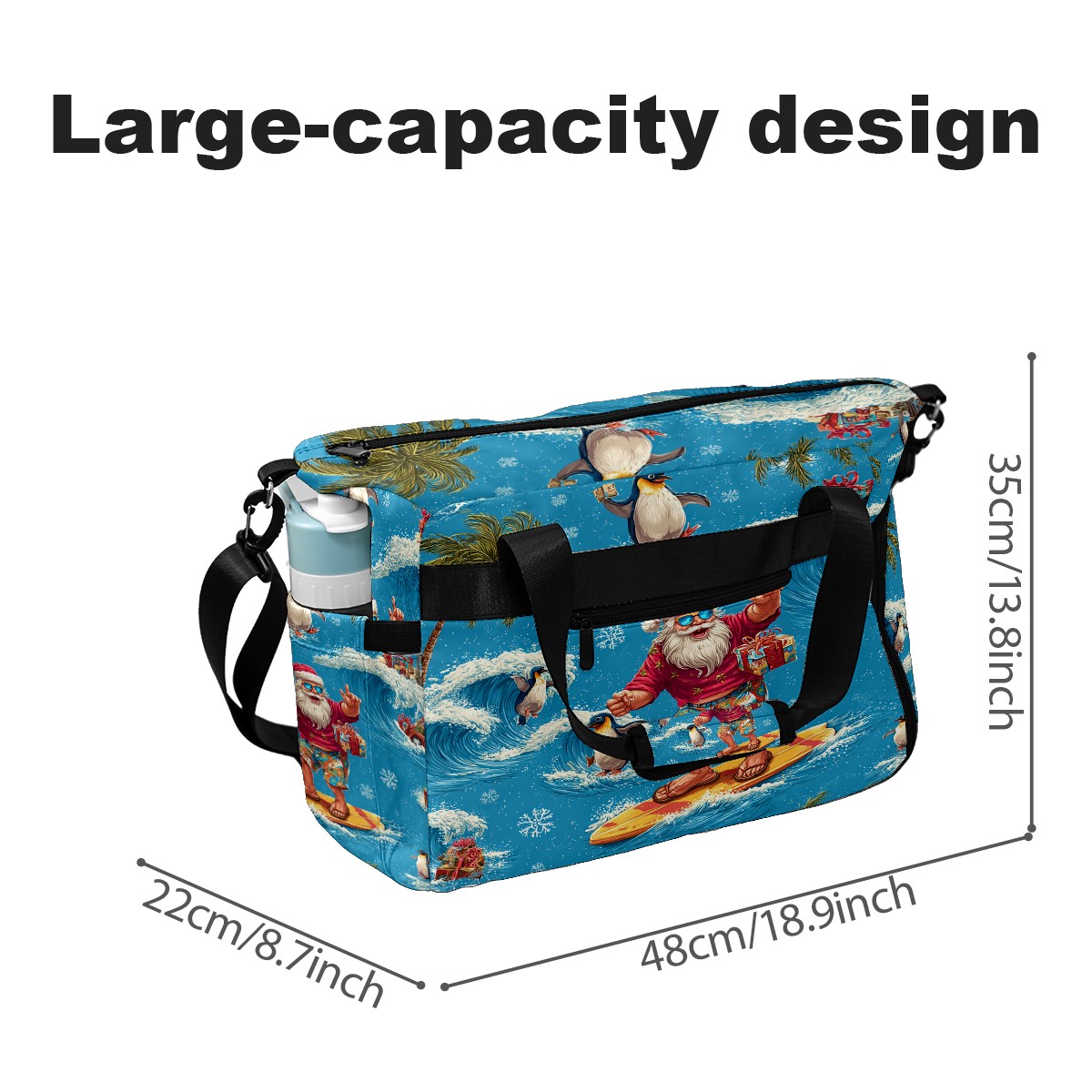 Large Gym Bag with Shoe Compartment, Water-Resistant Duffle Bag for Men and Women, Santa Penguin Surfing Blue Ocean Sports Tote for Workout Travel