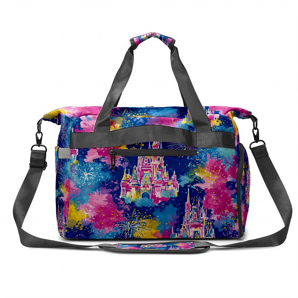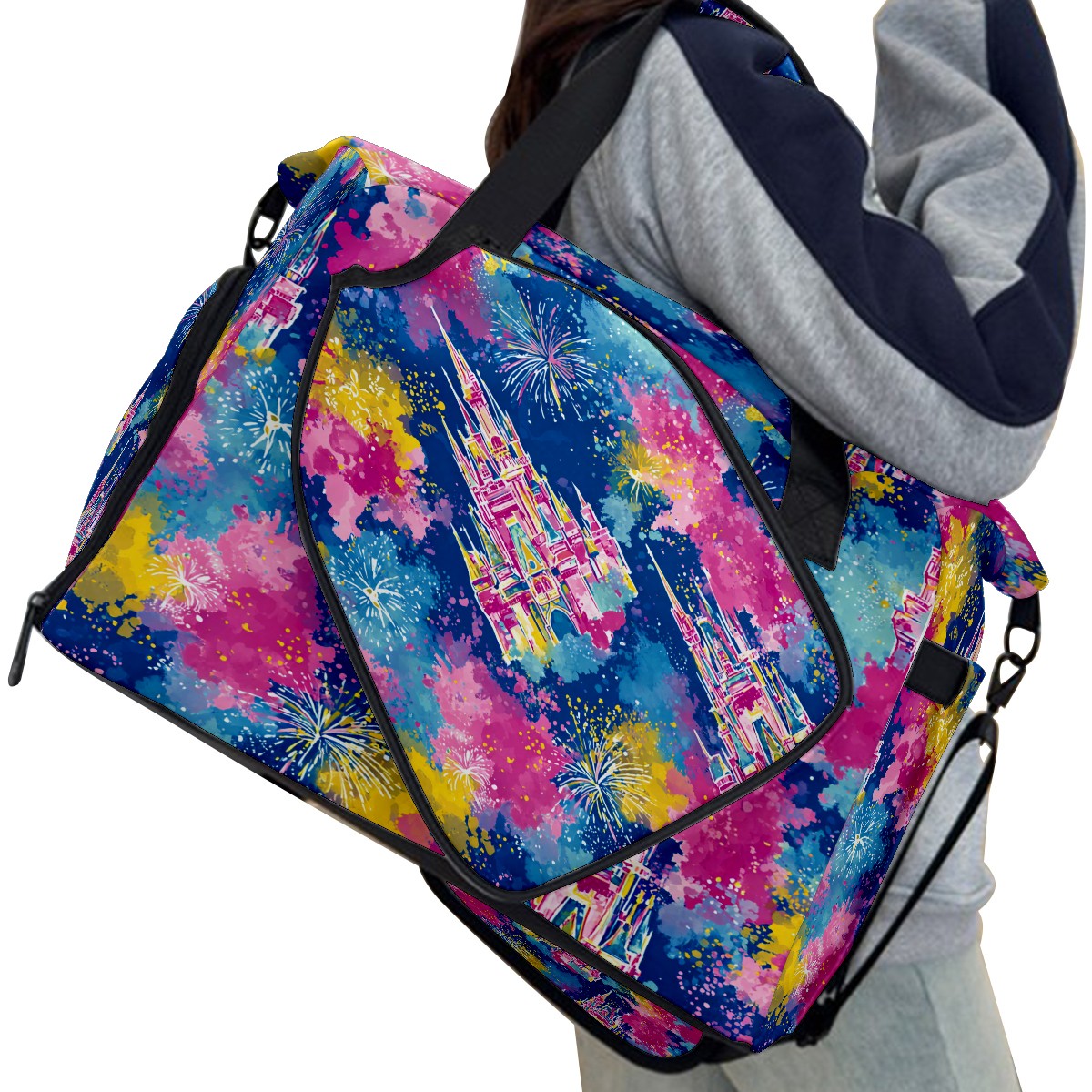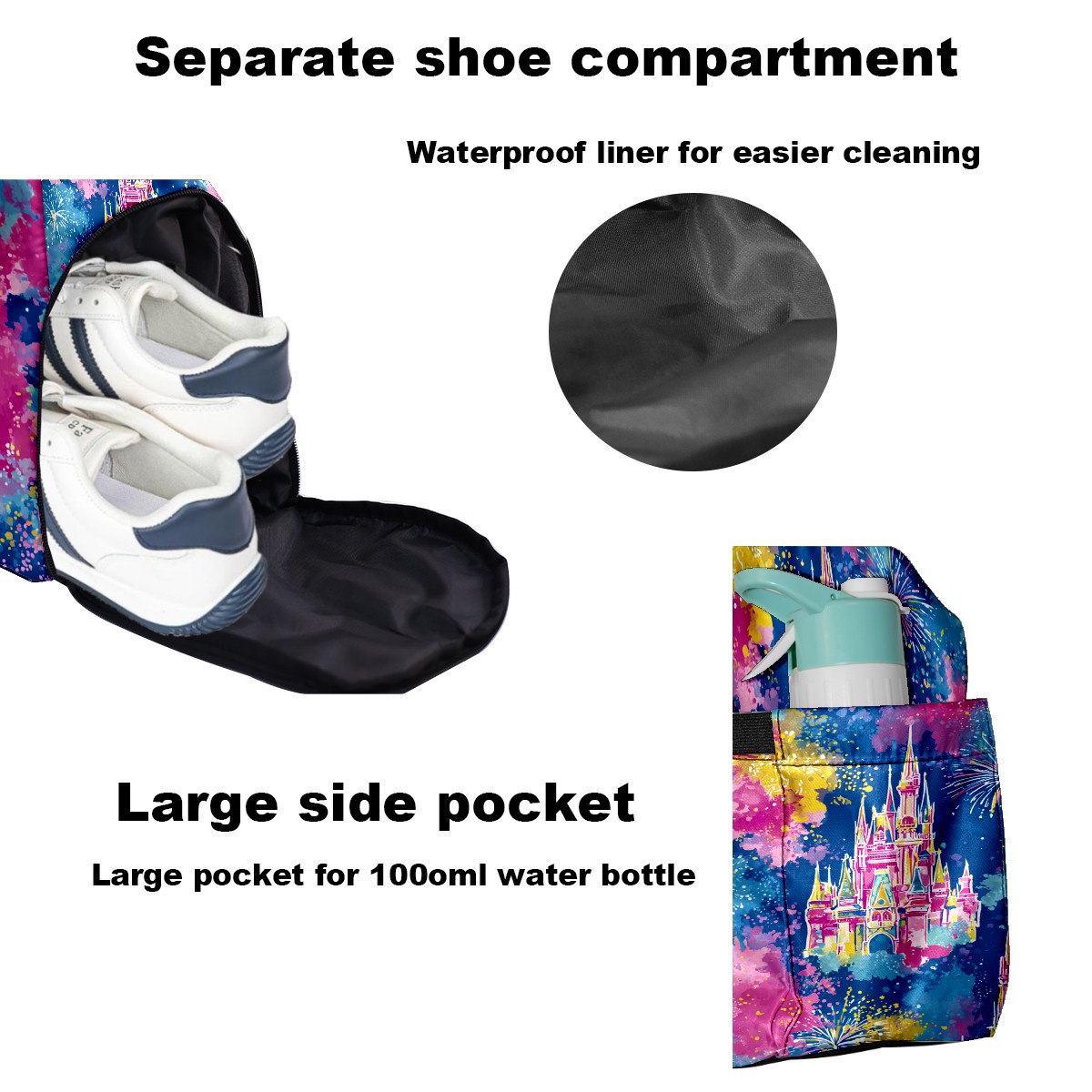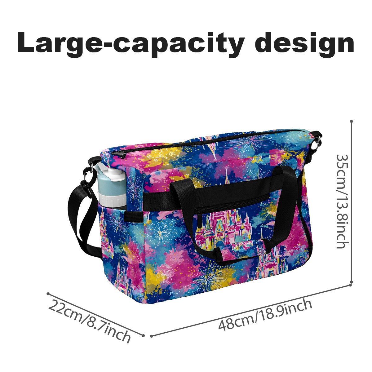Large Gym Bag with Shoe Compartment, Water-Resistant Duffle Bag for Men and Women, Colorful Castle Fireworks Sports Tote for Workout Travel