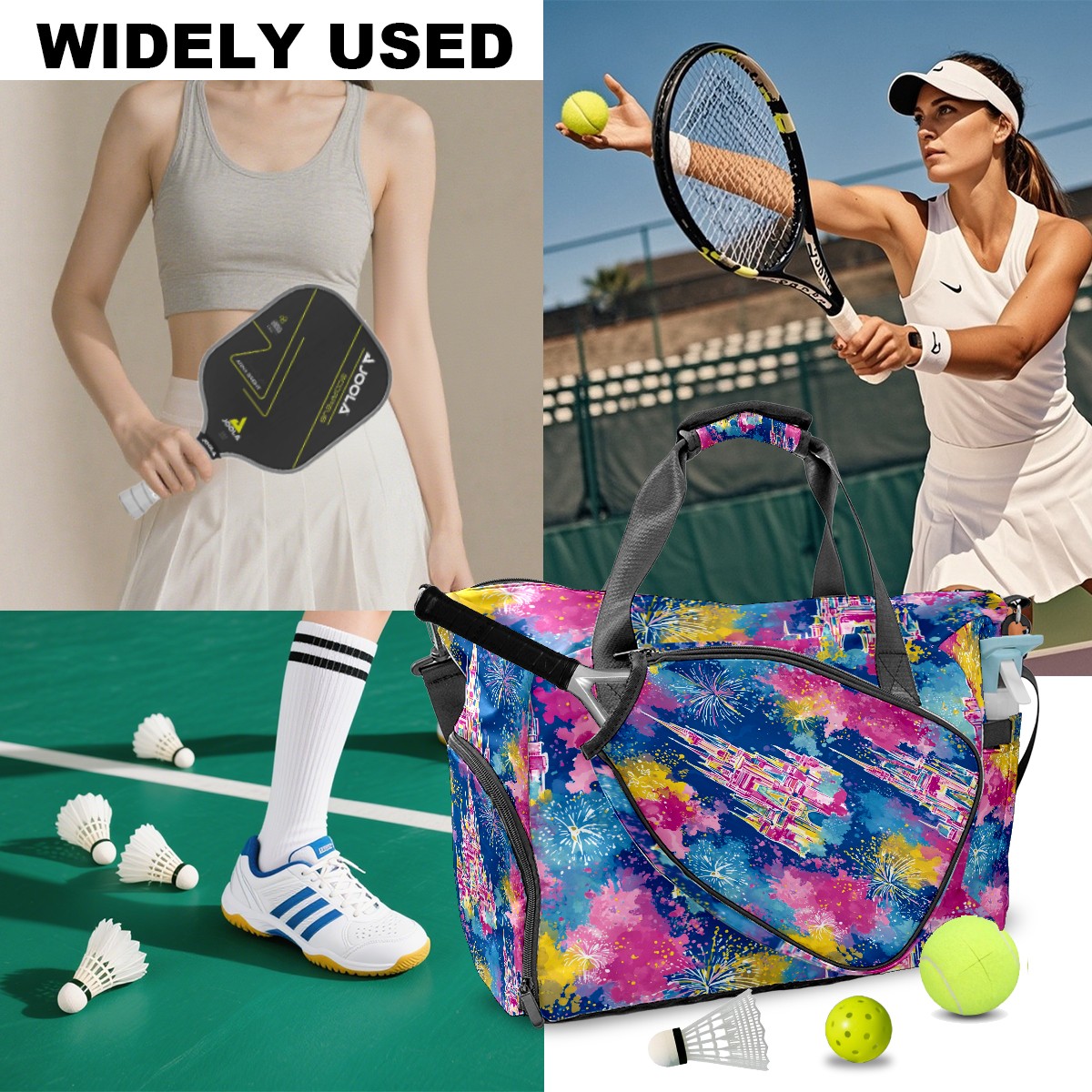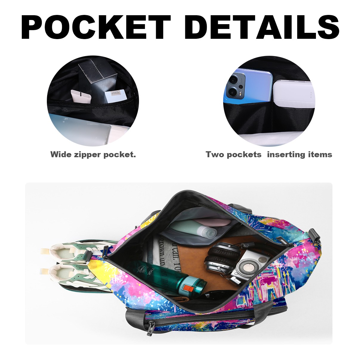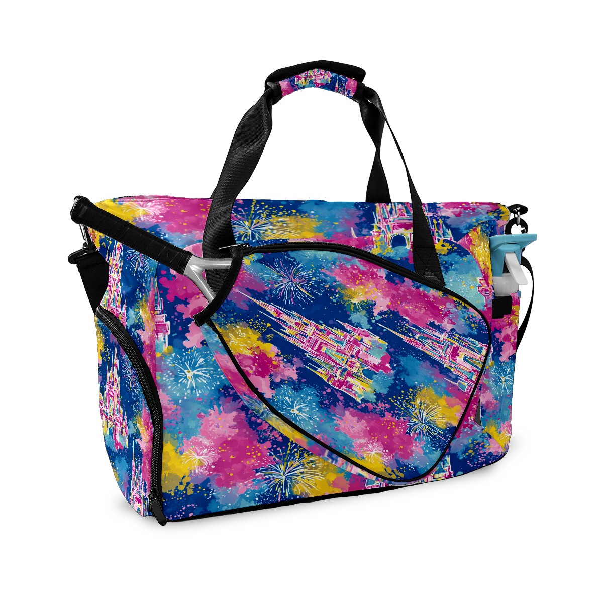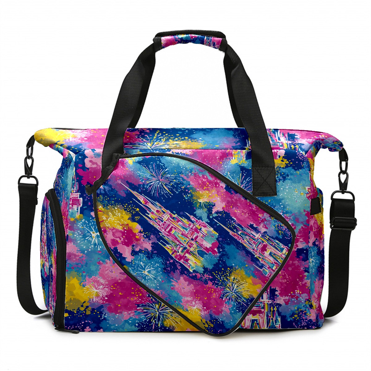 Large Gym Bag with Shoe Compartment, Water-Resistant Duffle Bag for Men and Women, Colorful Castle Fireworks Sports Tote for Workout Travel