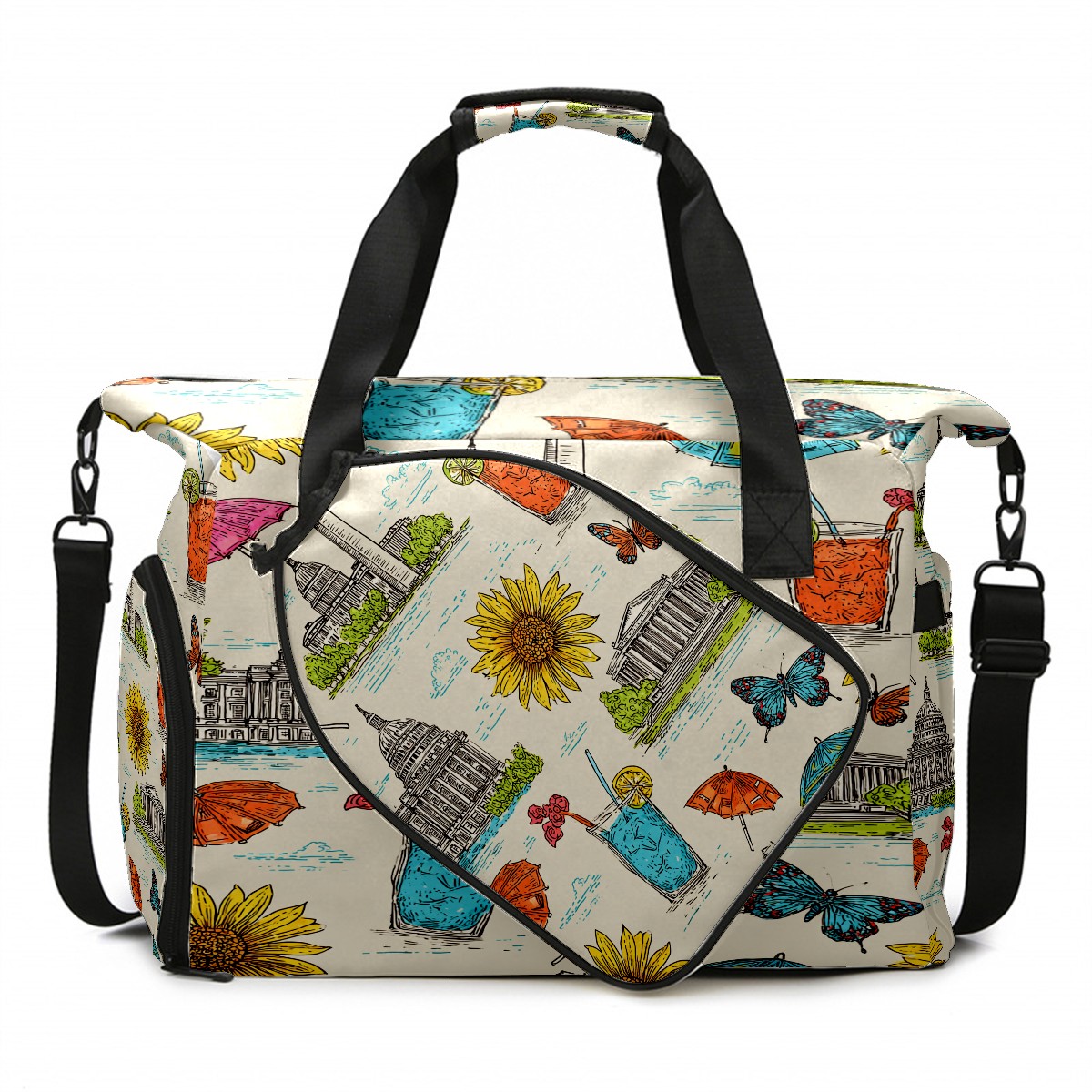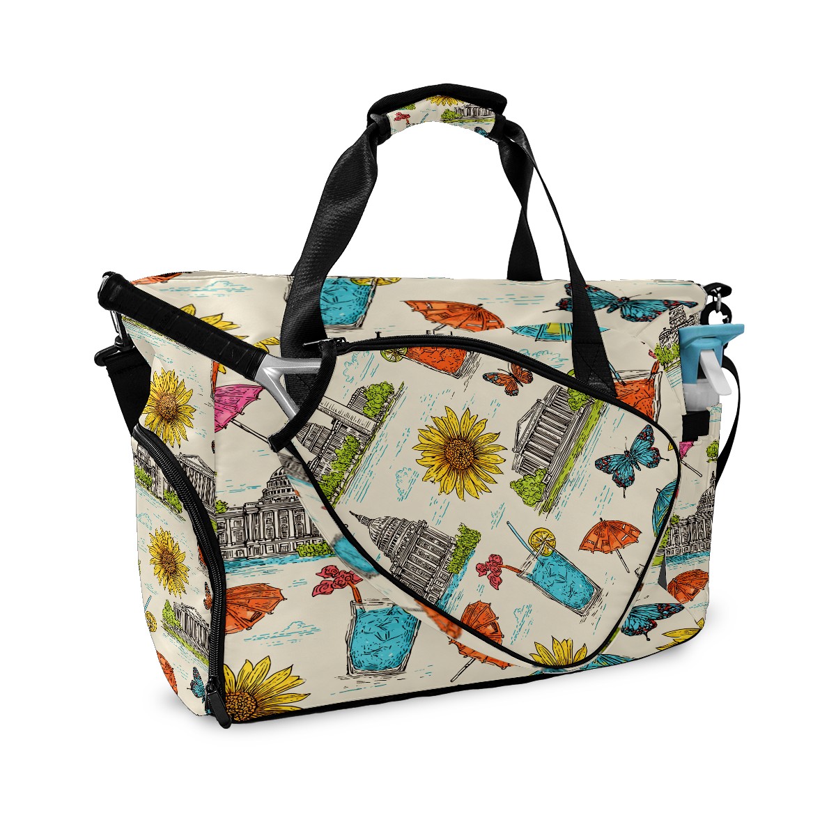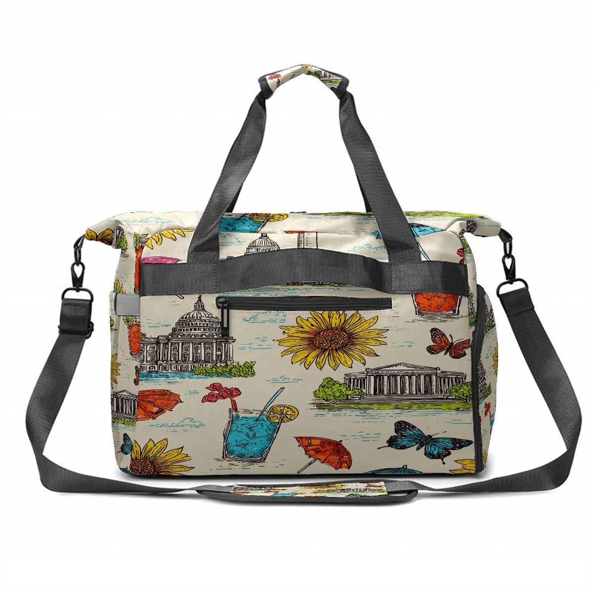 Large Gym Bag with Shoe Compartment, Water-Resistant Duffle Bag for Men and Women, Colorful City Sunflower Drinks Sports Tote for Workout Travel