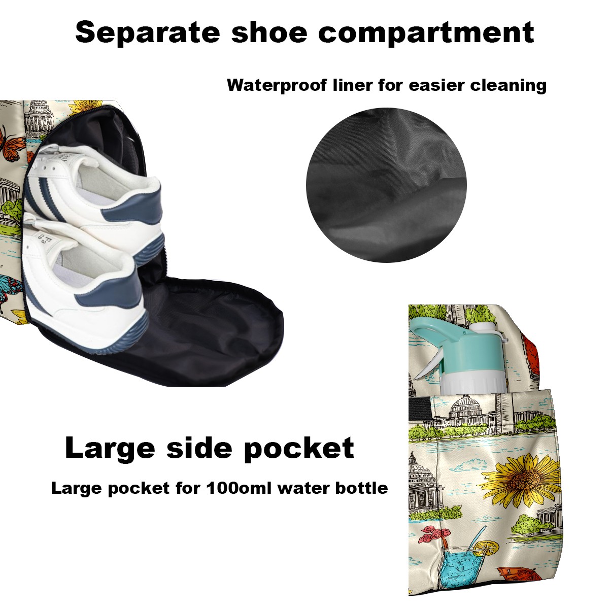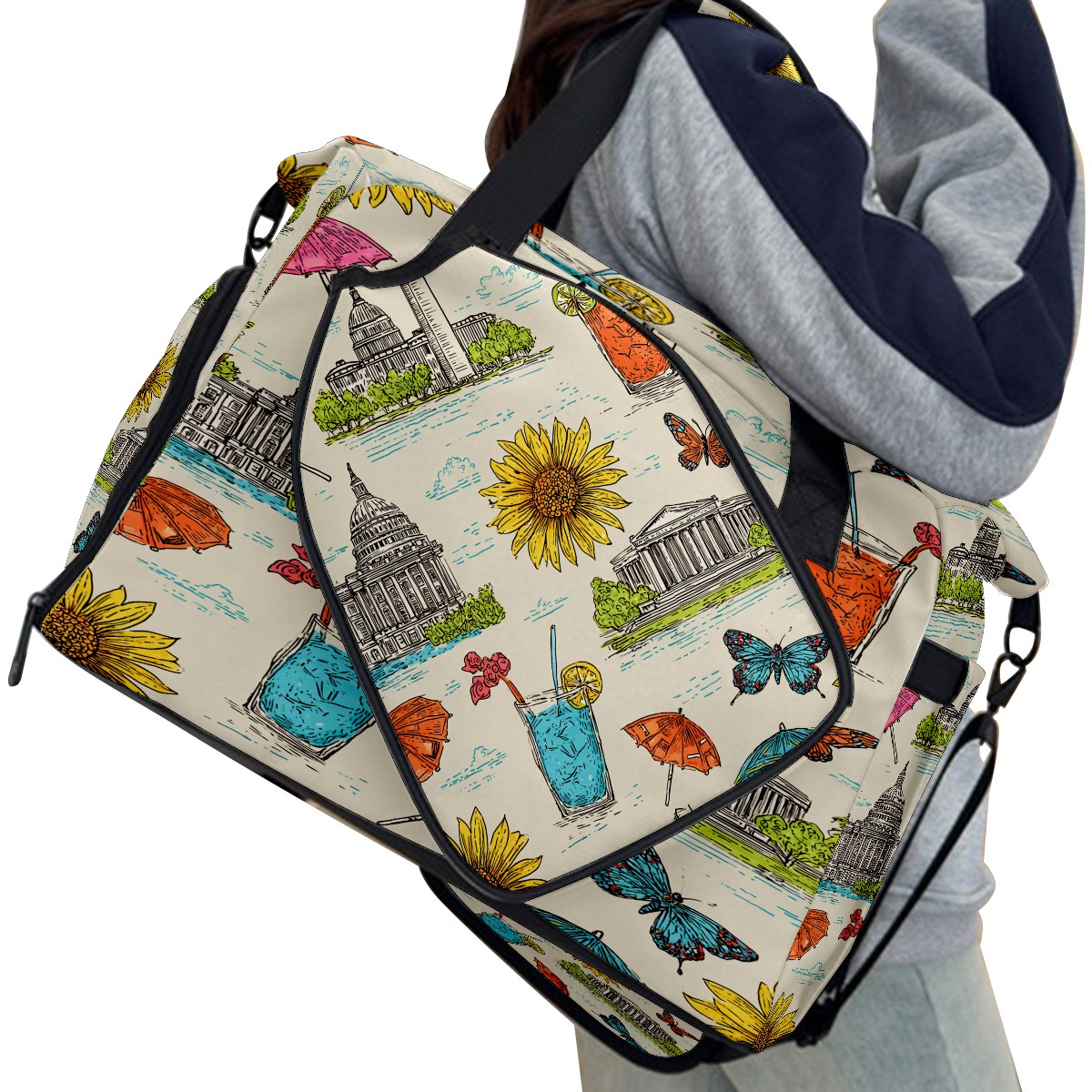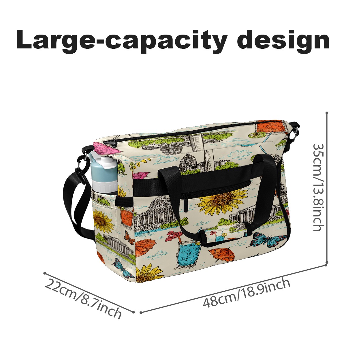 Large Gym Bag with Shoe Compartment, Water-Resistant Duffle Bag for Men and Women, Colorful City Sunflower Drinks Sports Tote for Workout Travel