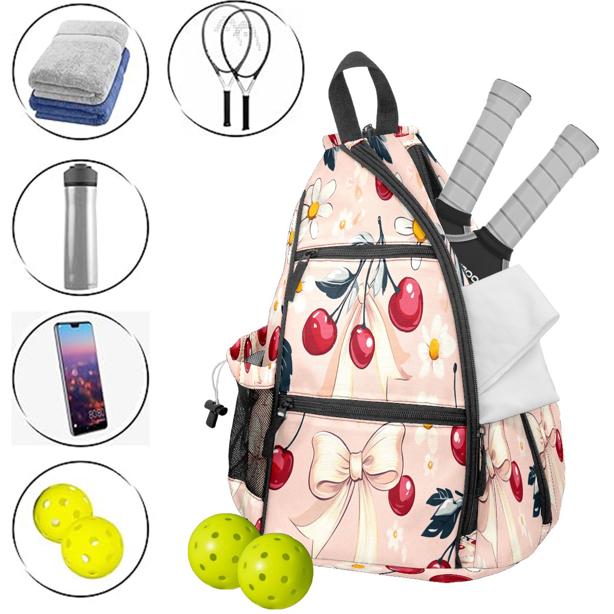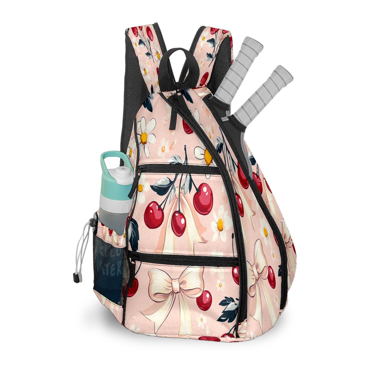 Pickleball Shoulder Bag for Men and Women - Fence Hook - Crossbody Backpack with Water Bottle Holder Cherry Daisy