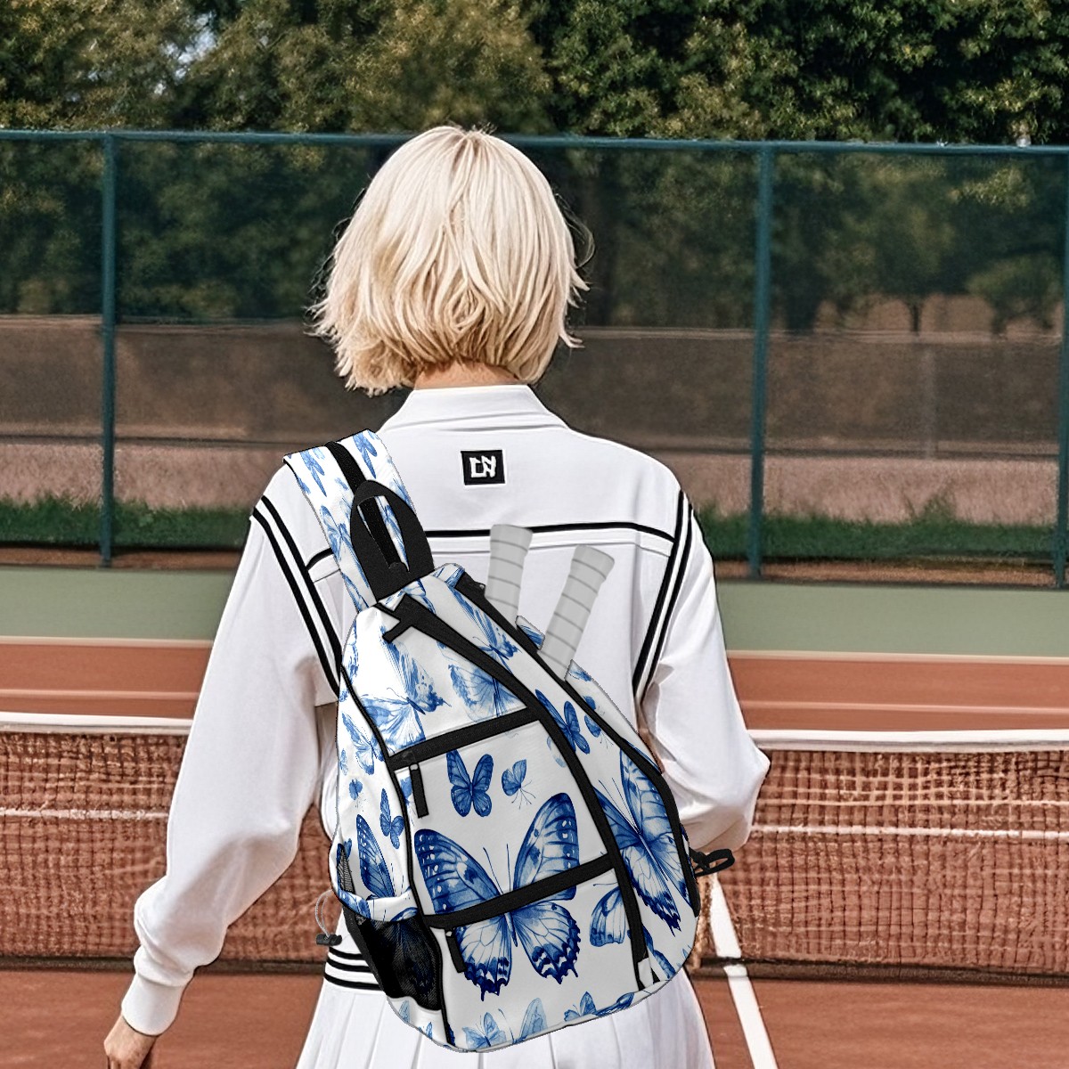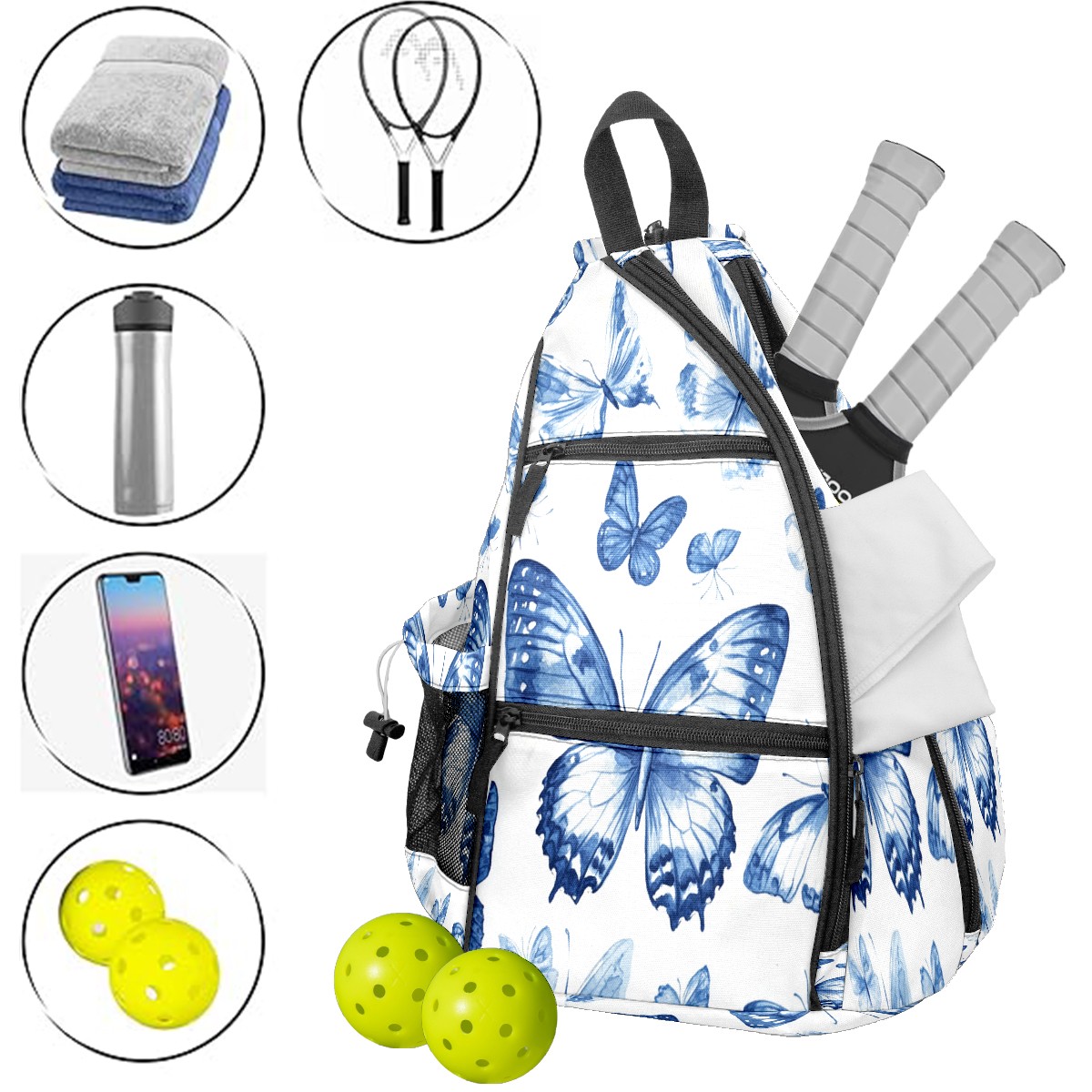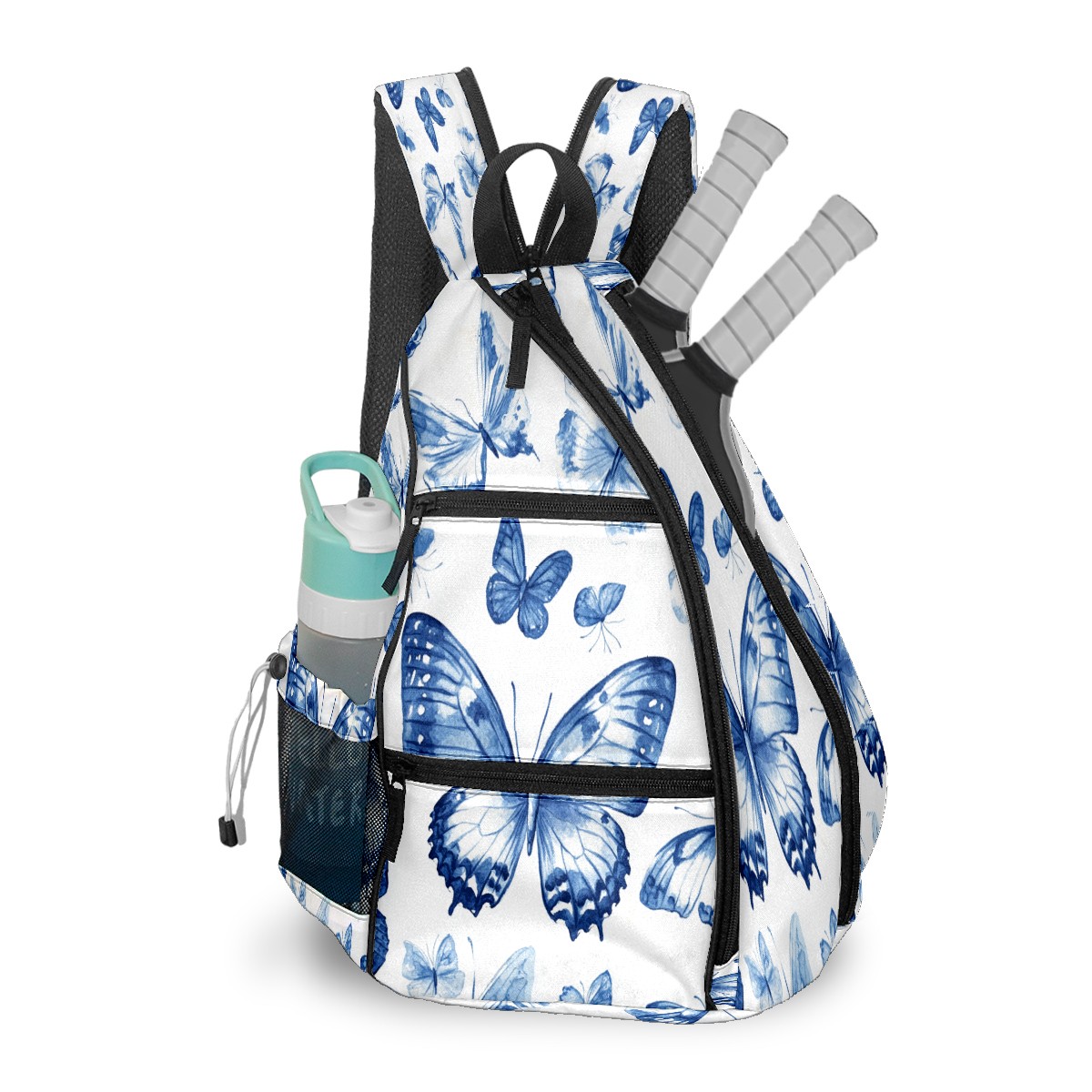 Pickleball Shoulder Bag for Men and Women - Fence Hook - Crossbody Backpack with Water Bottle Holder Blue Butterfly