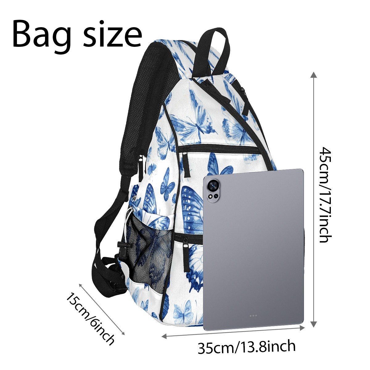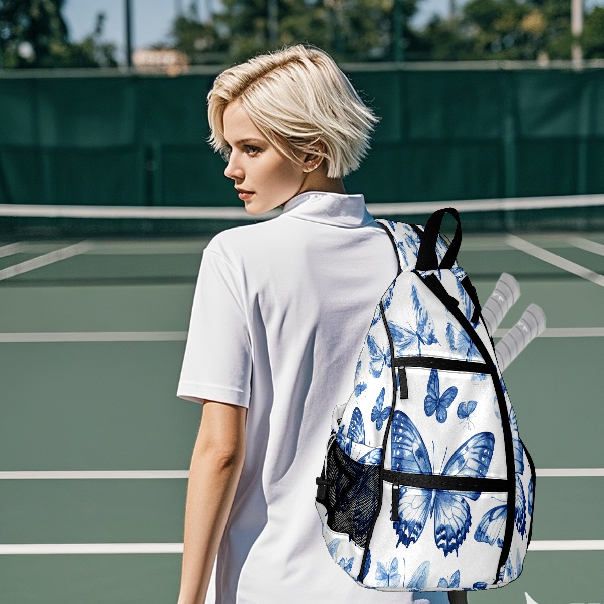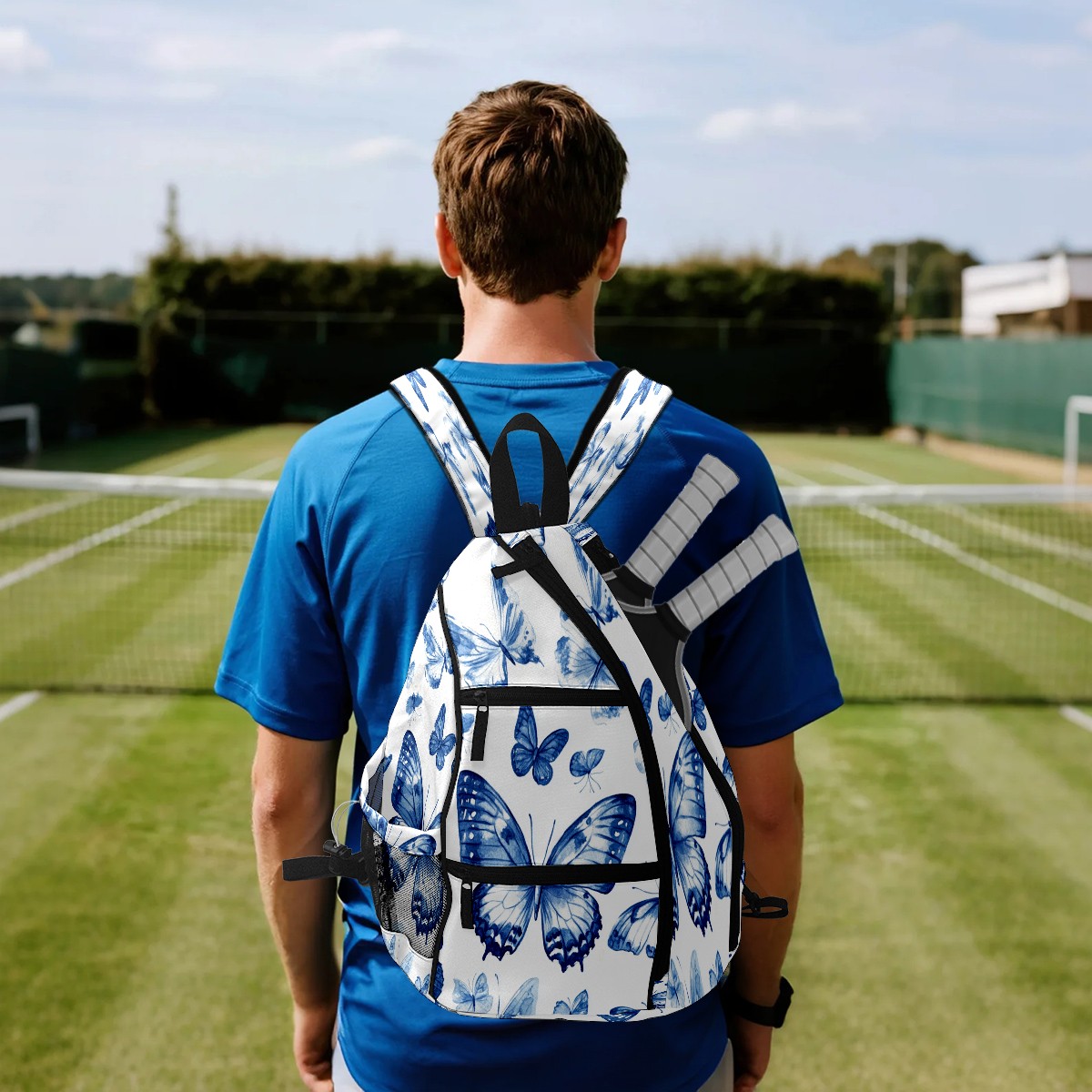 Pickleball Shoulder Bag for Men and Women - Fence Hook - Crossbody Backpack with Water Bottle Holder Blue Butterfly