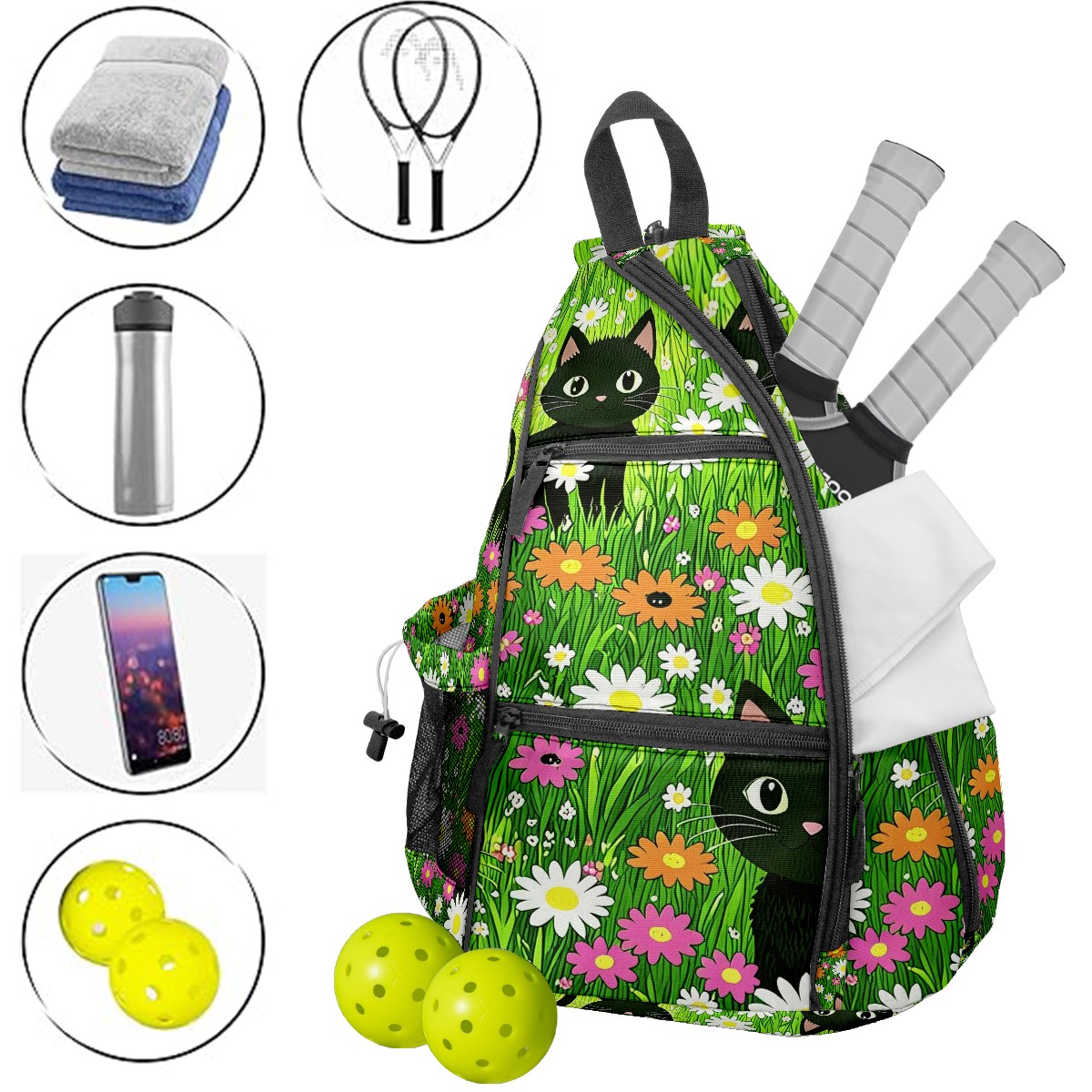 Pickleball Bag Jimeng-2025-08-16-2558-cartoon Cats, Black Cats, Floral Field, ... Pickle Ball Backpack for Women Men Premium Lightweight Crossbody Sling Bag Sports Backpack for Pickleball Paddle Tennis