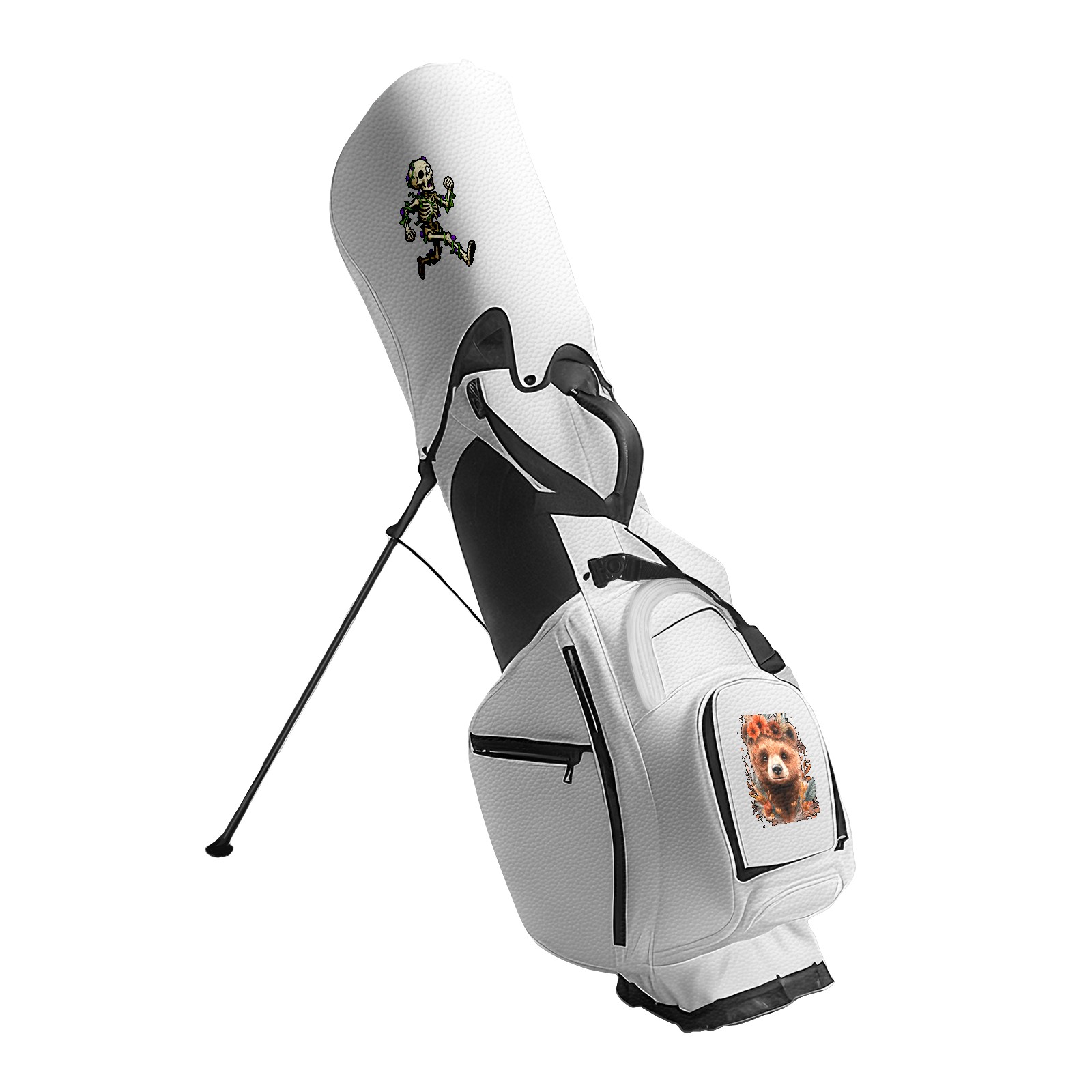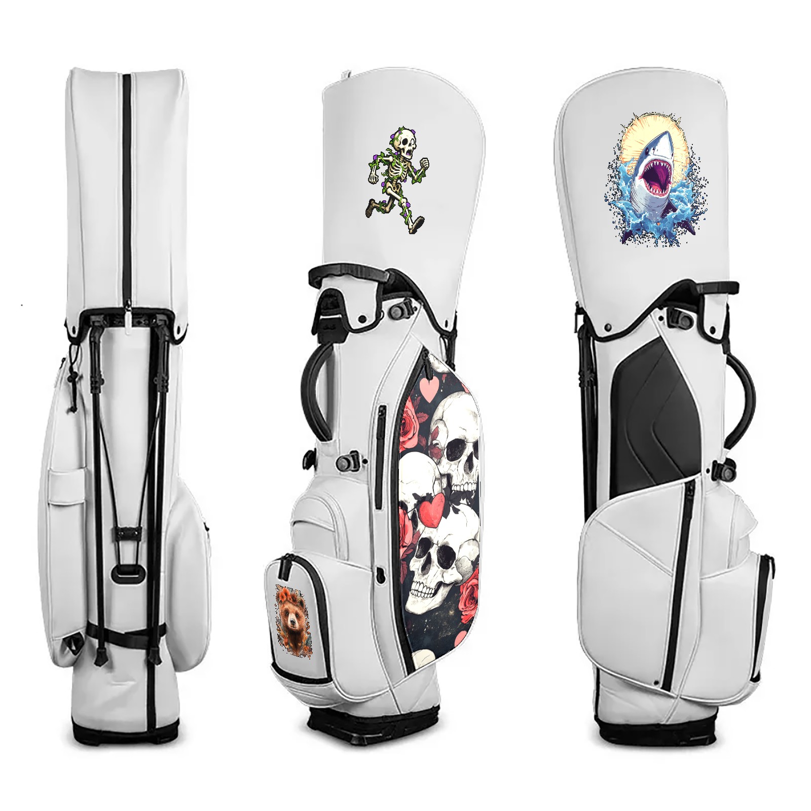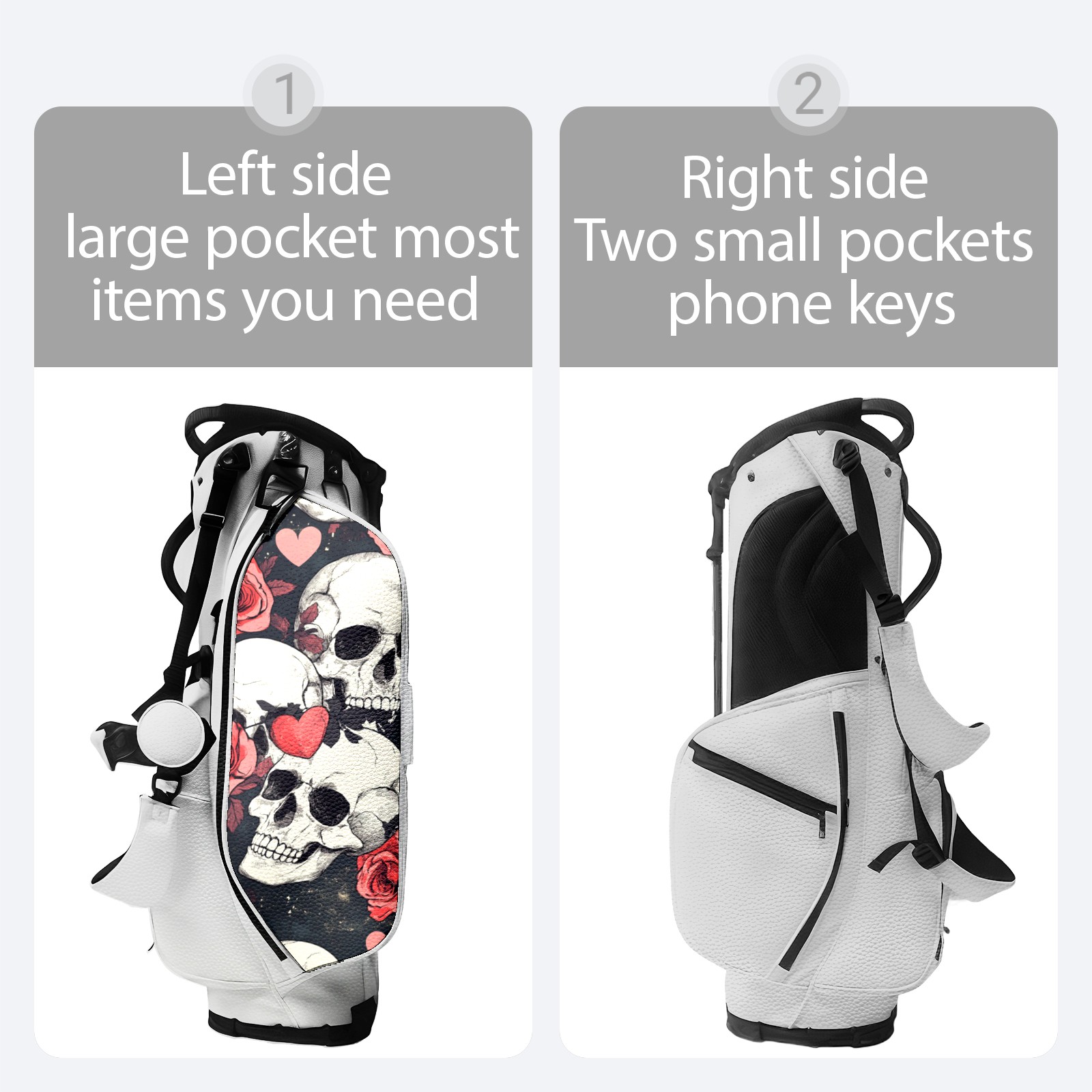 Unisex Waterproof PU Leather Golf Bag with 14-Way Dividers, Cooler Pocket, Rain Cover, Custom Embroidery, and Adjustable Shoulder Straps (White Skull)